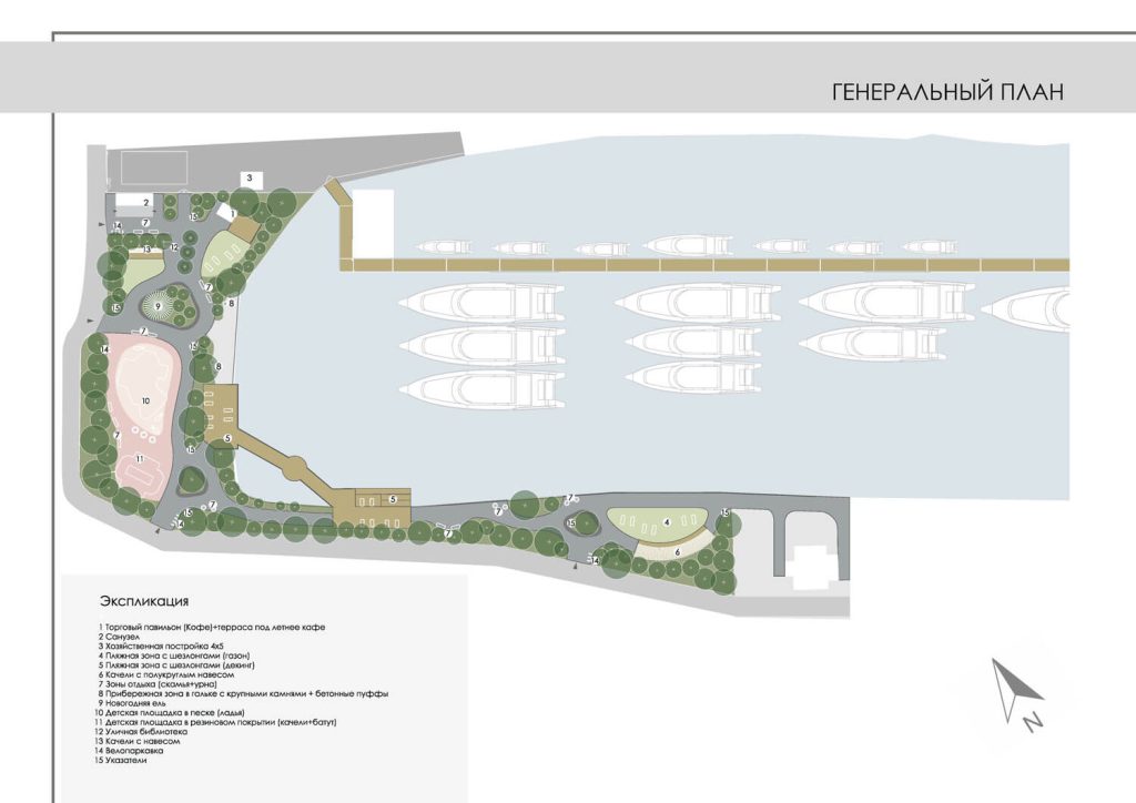 Архитектурно-планировочное решение парка опирается на тему русского кораблестроения и славянских культурных кодов, прочитанных через язык современного паркового дизайна. В малых архитектурных формах, пластике элементов и деталях благоустройства заложены ассоциации с корабельными конструкциями, ручным ремеслом, вниманием к материалу и форме. Здесь важна не прямая стилизация, а ощущение преемственности: современная верфь воспринимается как продолжение традиции, а не как изолированный индустриальный объект.