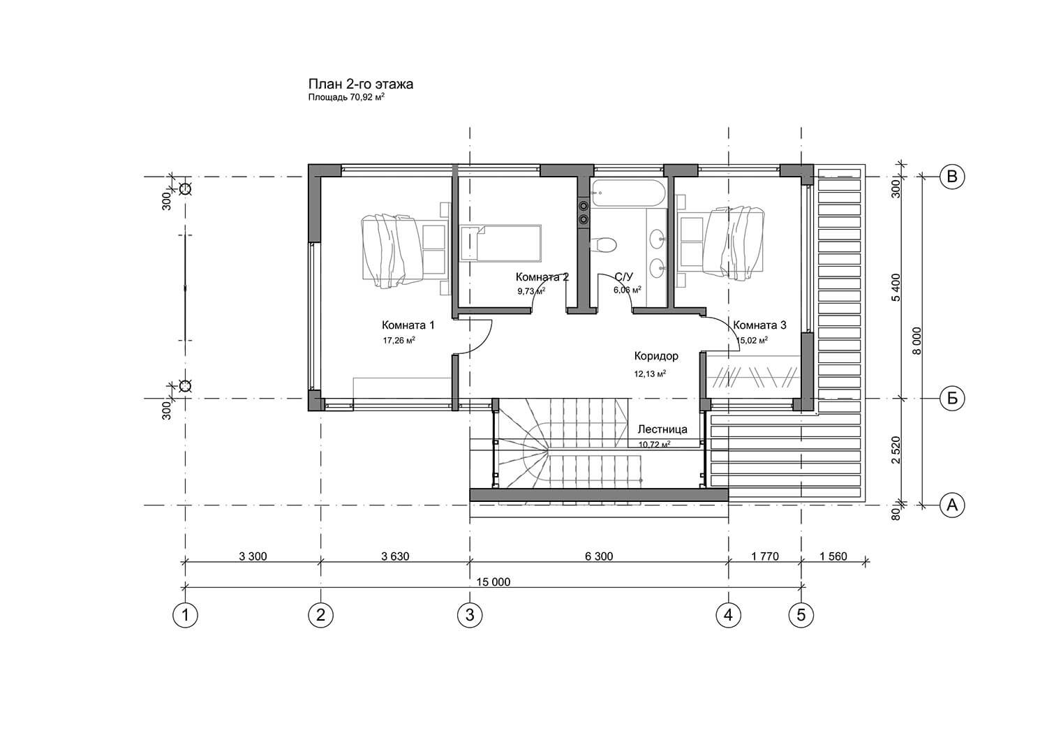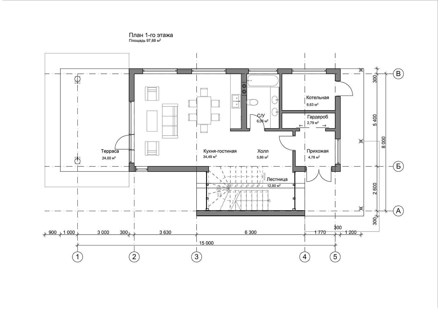 1-й этаж: прихожая, гардероб, котельная, с.у., холл, лестница, кухня-гостиная, терраса.