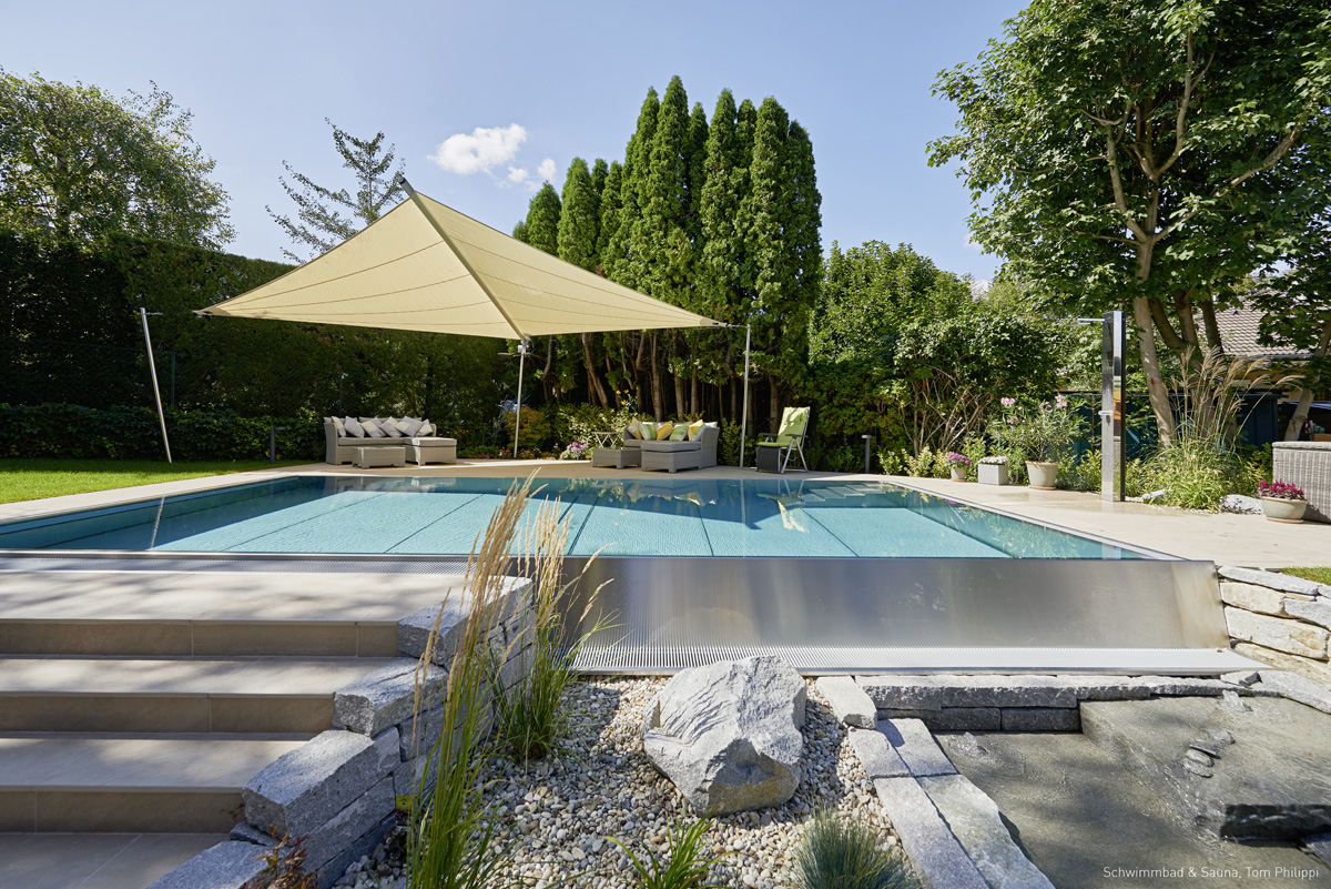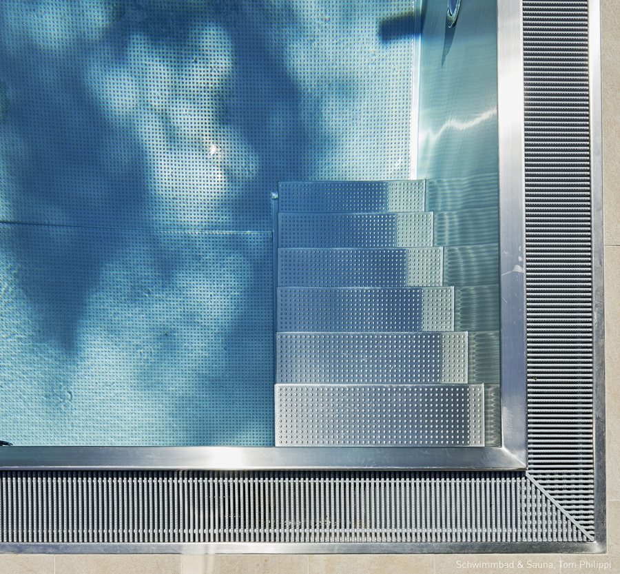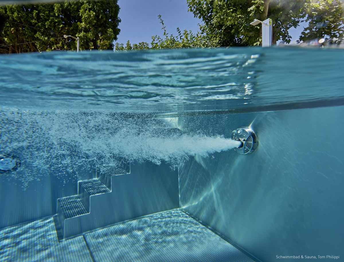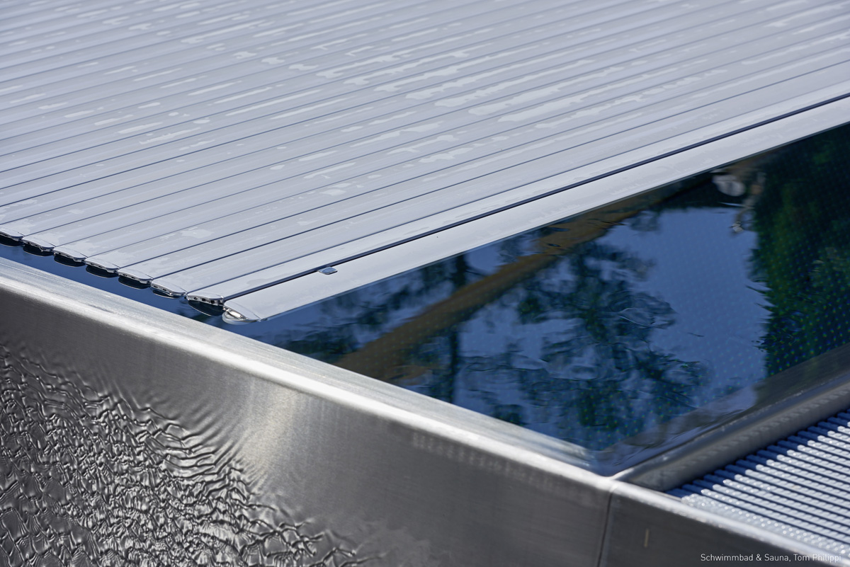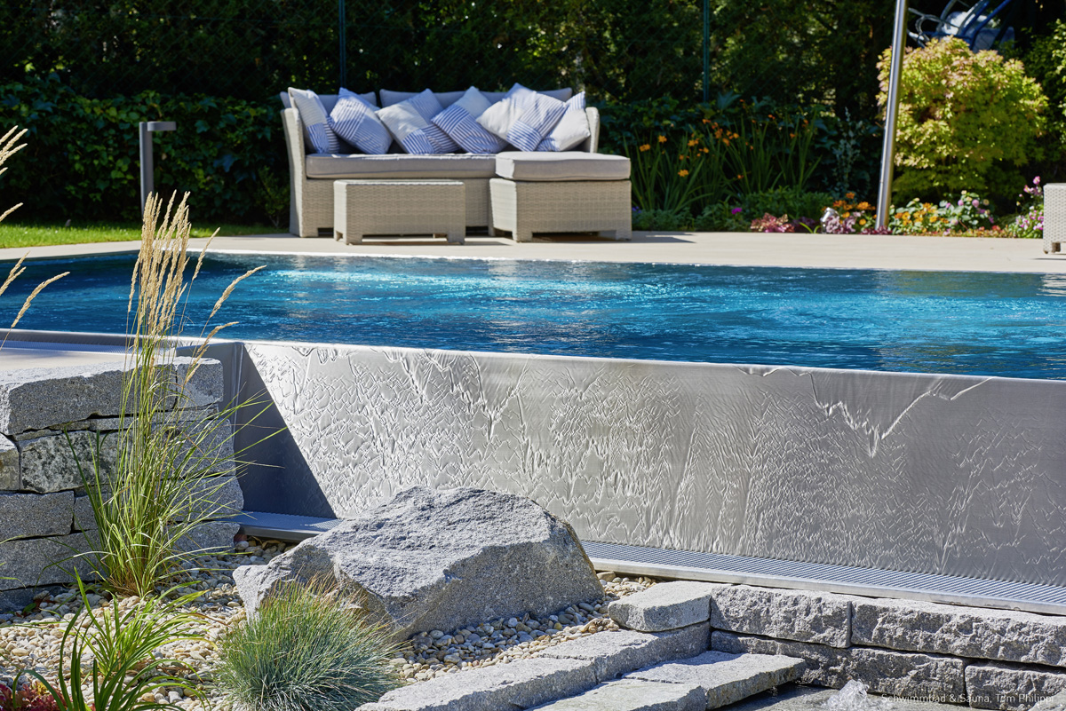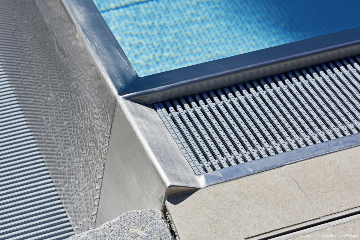 Плавательный бассейн из нержавеющей стали оснащен переливным желобом. Он выполнен частично в версии бассейн-инфинити (безбортный бассейн). Распложенный глубоко переливной желоб версии Infinity дополнительно оснащен светодиодным освещением белого цвета.