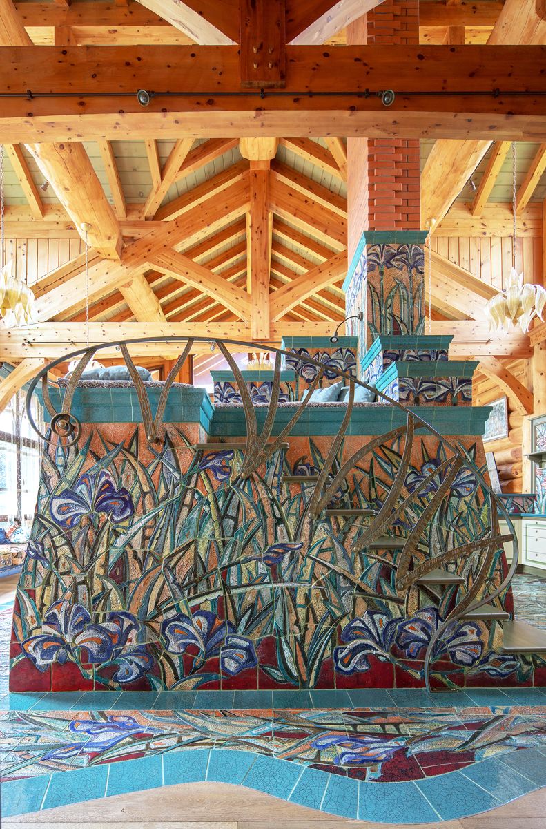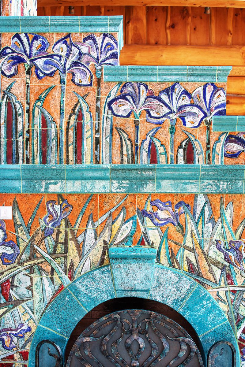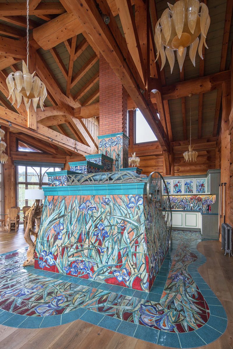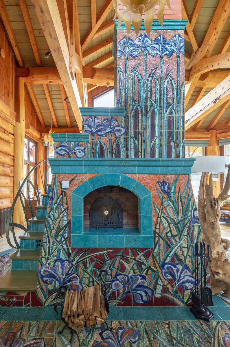 Ребра и топку печи обрамляет лазурная плитка, олицетворяя собой потоки воздуха, гуляющие по полю ирисов.