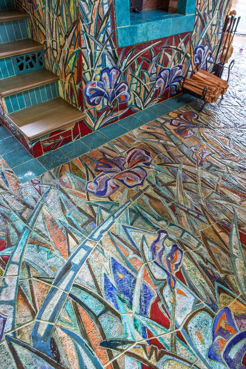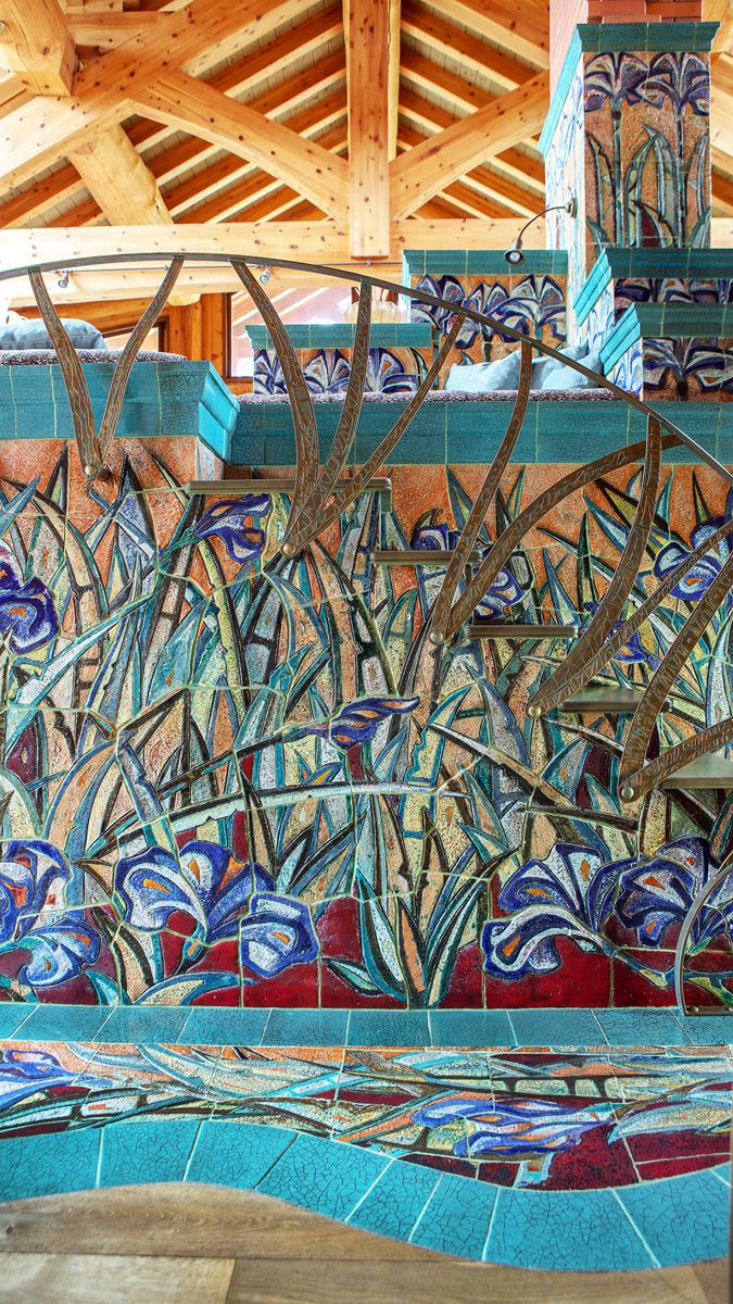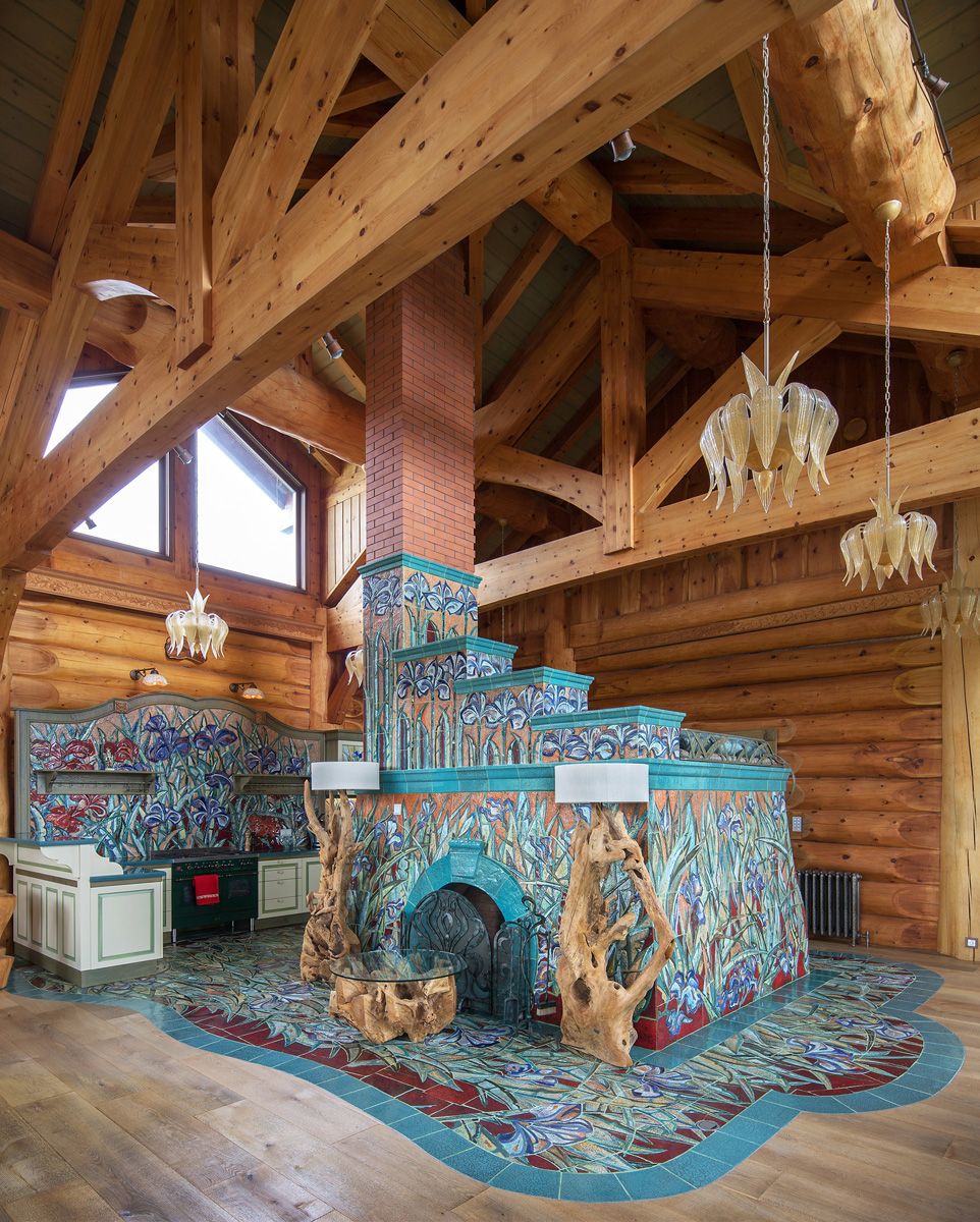 Ребра и топку печи обрамляет лазурная плитка, олицетворяя собой потоки воздуха, гуляющие по полю ирисов.