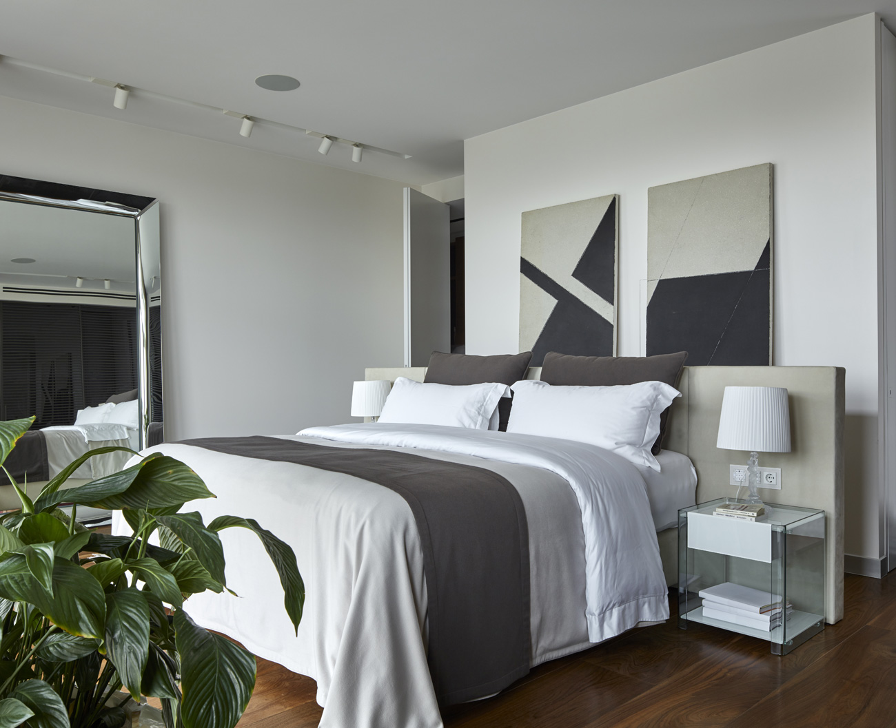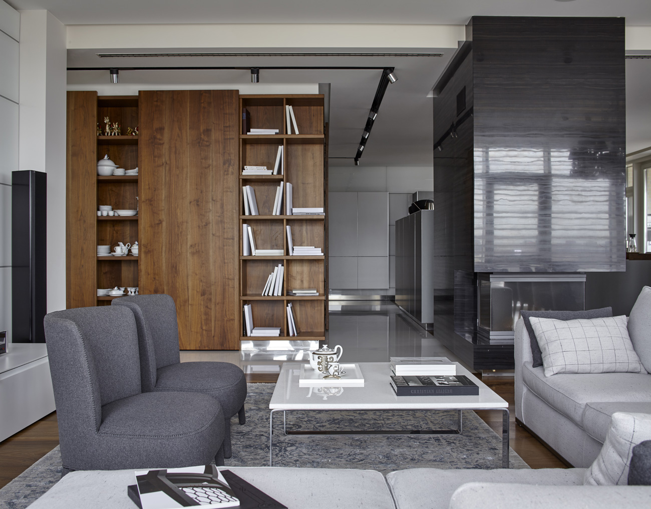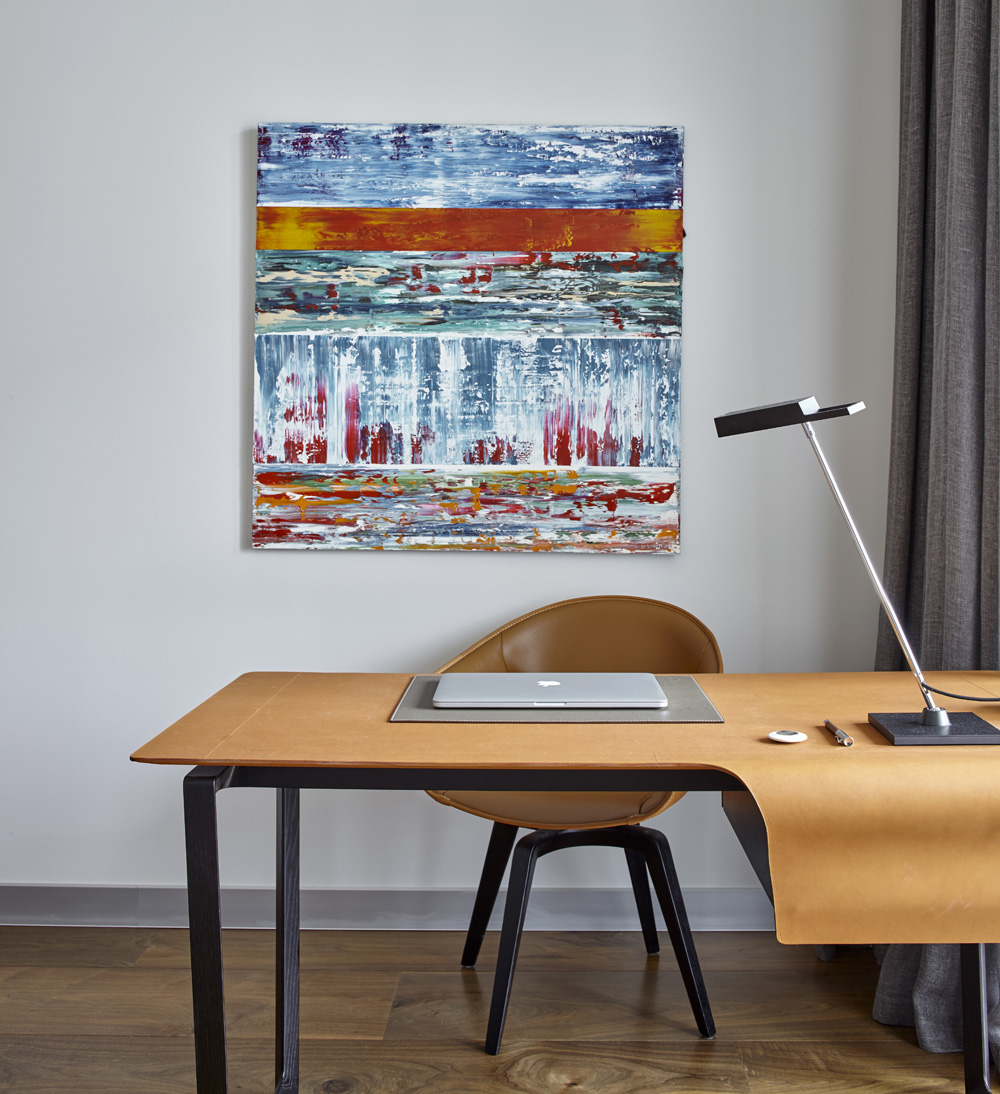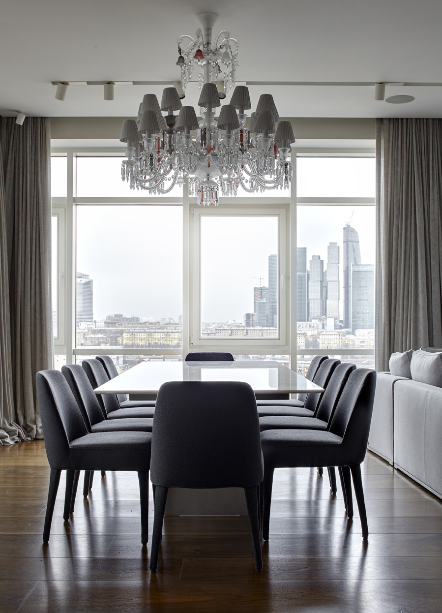 Из этой квартиры открывается невероятный вид на Москву. Панорама Воробьевых гор, Новодевичьего монастыря и виднеющегося московского сити поражает и захватывает дух. Именно этим и были продиктованы основные приемы, использованные при создании интерьера.