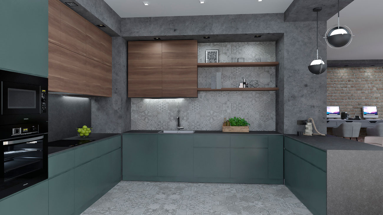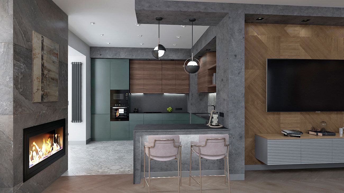 Балкон с панорамными окнами объединен с кухней. Получилось большое светлое пространство зоны гостиной и кухни. Камин делает интерьер «теплым».
