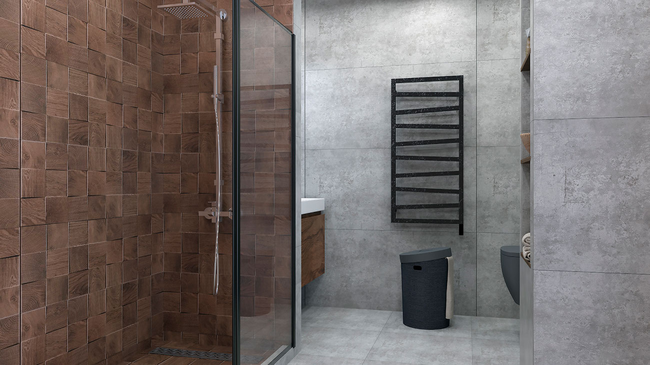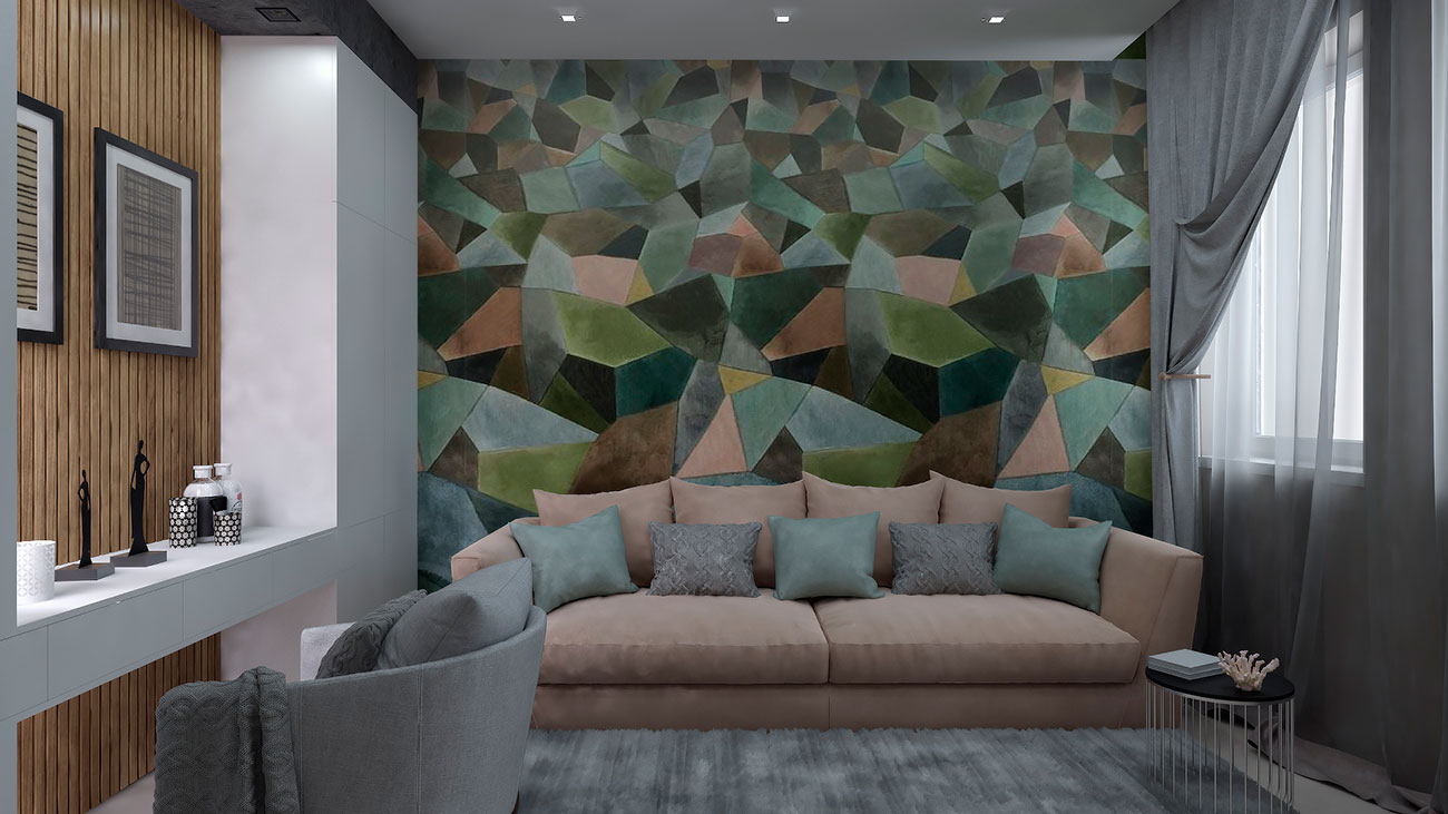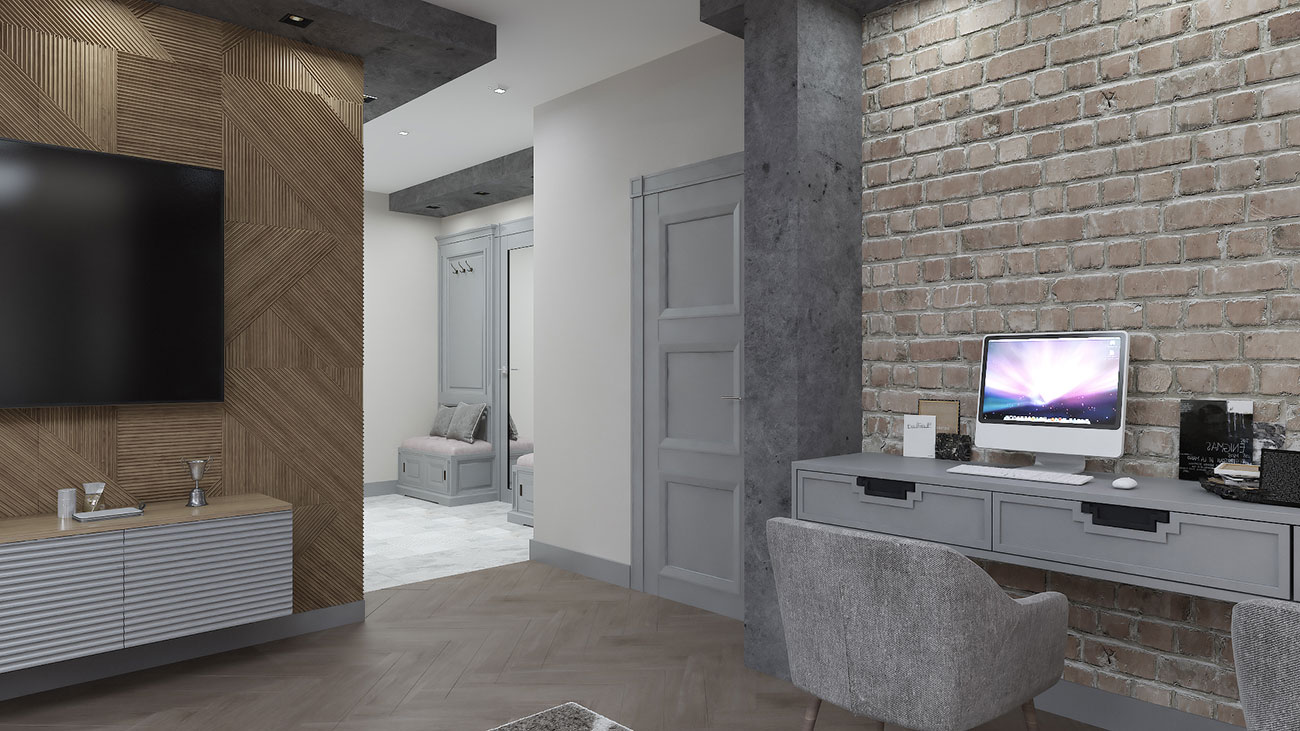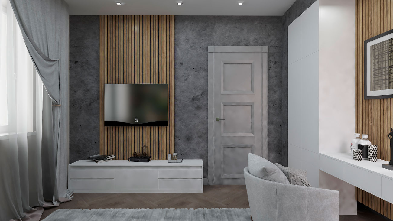 Деревянные панели и рейки и искусственный камень в отделке привносят уют в пространство. В гостевой комнате за диваном используется декоративное панно, мягкое на ощупь, как велюр.