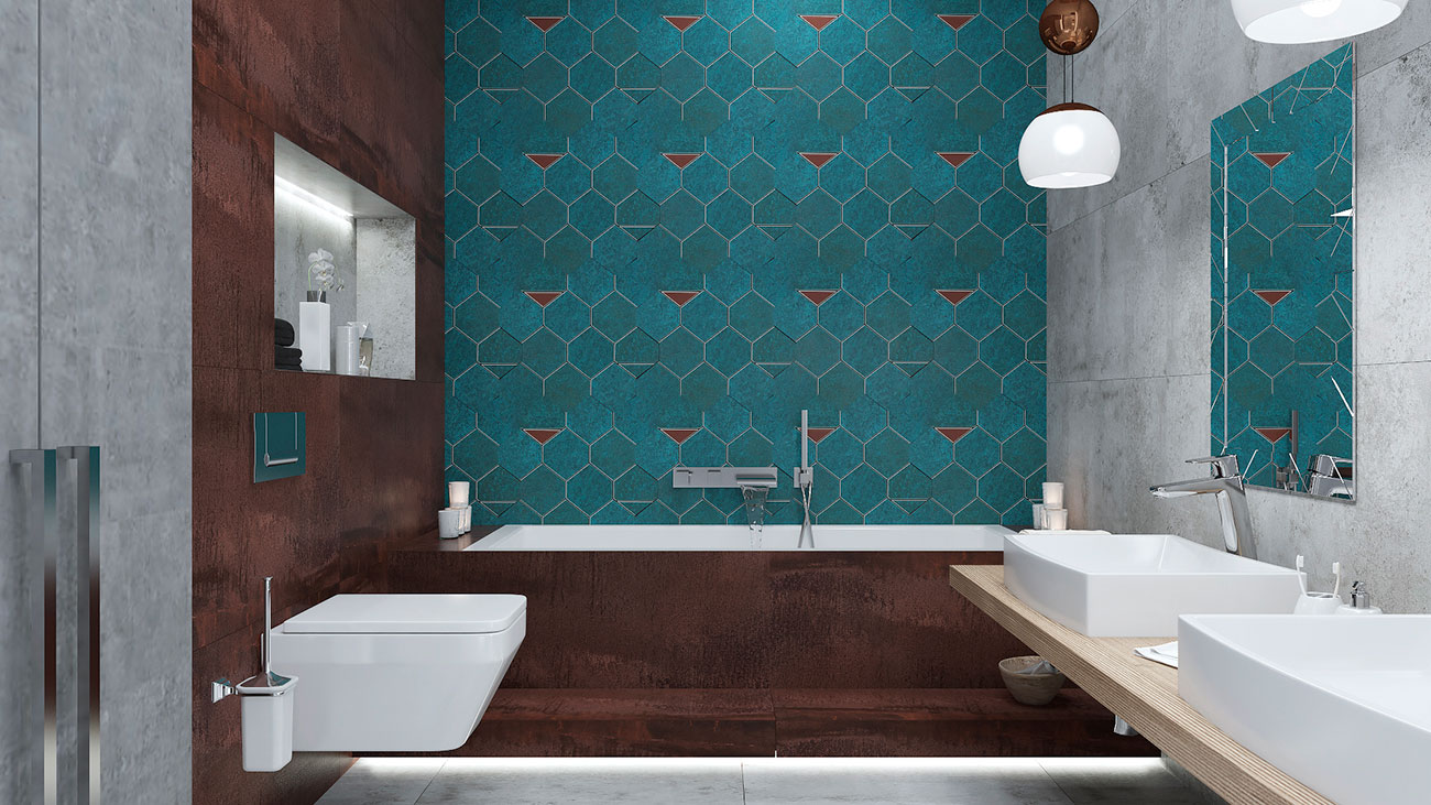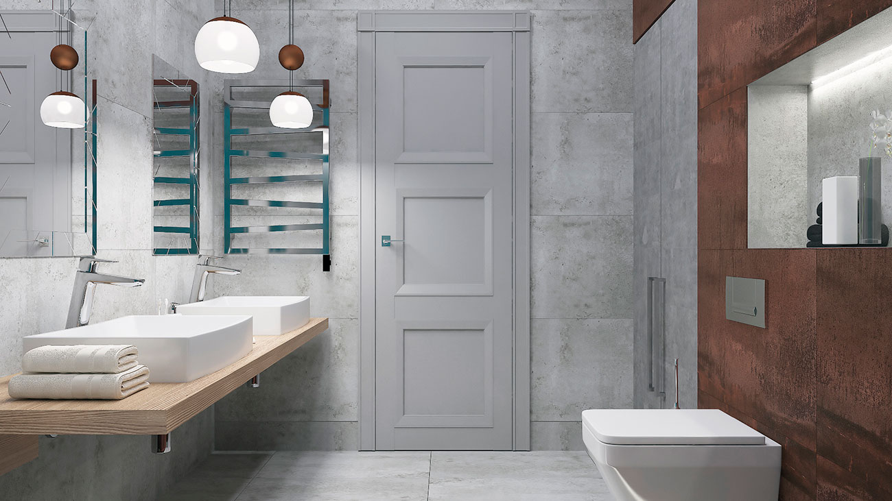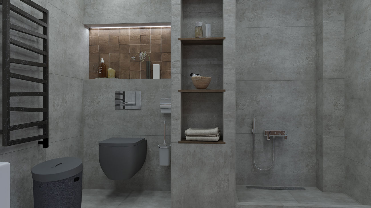 В ванной комнате создан подиум со скрытой подсветкой, что создает эффект парящей ванной.