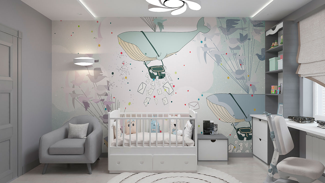 В детской комнате художественное панно «Киты, несущие почту» обыгрывает длинную стену.