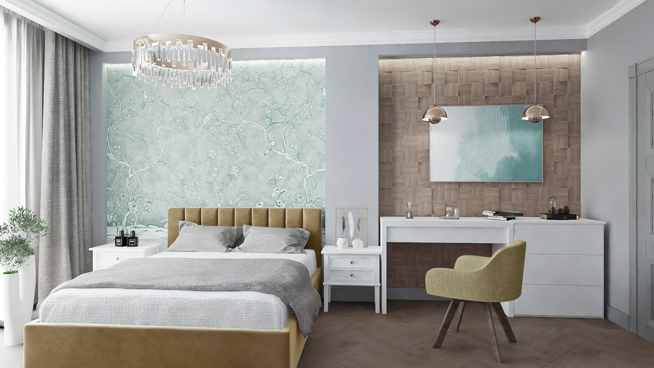 Подоконник окна объединен с рабочей зоной, что делает интерьер более функциональным и лаконичным. В спальне — декоративное панно «Флористика» и деревянные панели продолжают природную тему, а горчичный цвет мебели вносит изюминку в интерьер.
