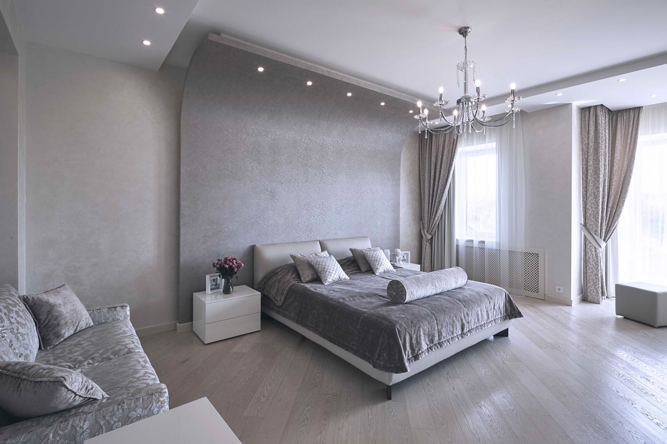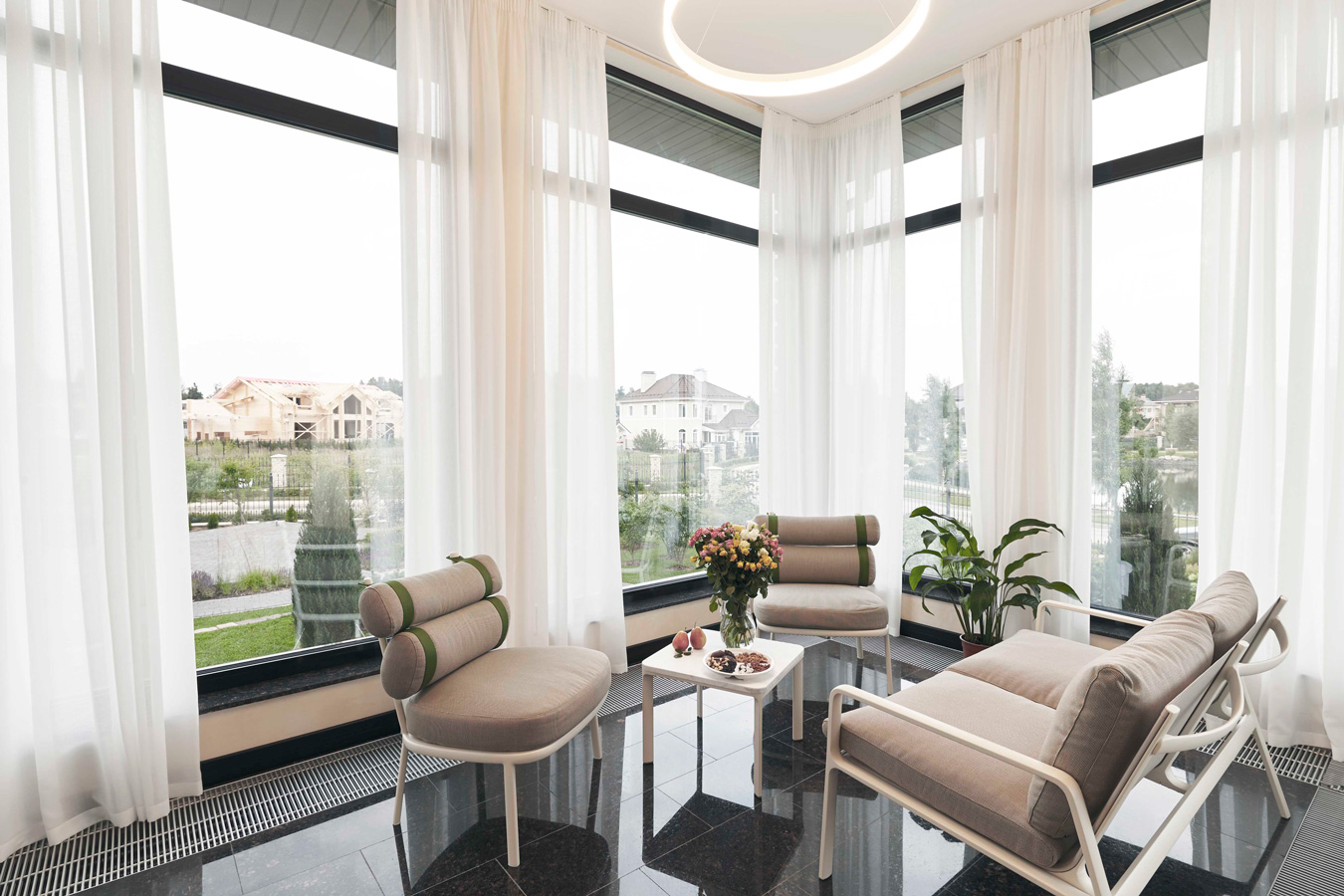 Во всех зонах просматривается индивидуальность и личность заказчиков. В гостевой зоне «холодным» хайтечным светильникам противостоят теплые цвета стен с декоративной штукатуркой и современные витражи в технике фьюзинг со средиземноморскими мотивами. Приватные зоны второго этажа в монохромной гамме моккачино и серебристых оттенков создают ощущения покоя, необходимого хозяевам во второй половине дня.