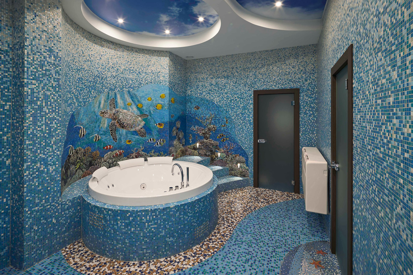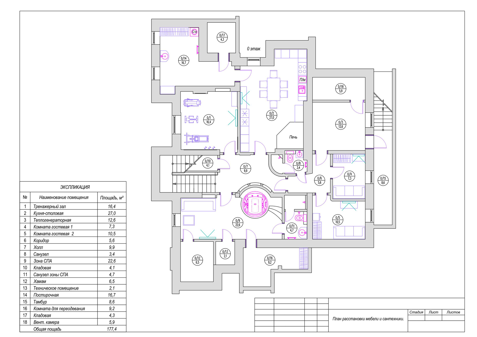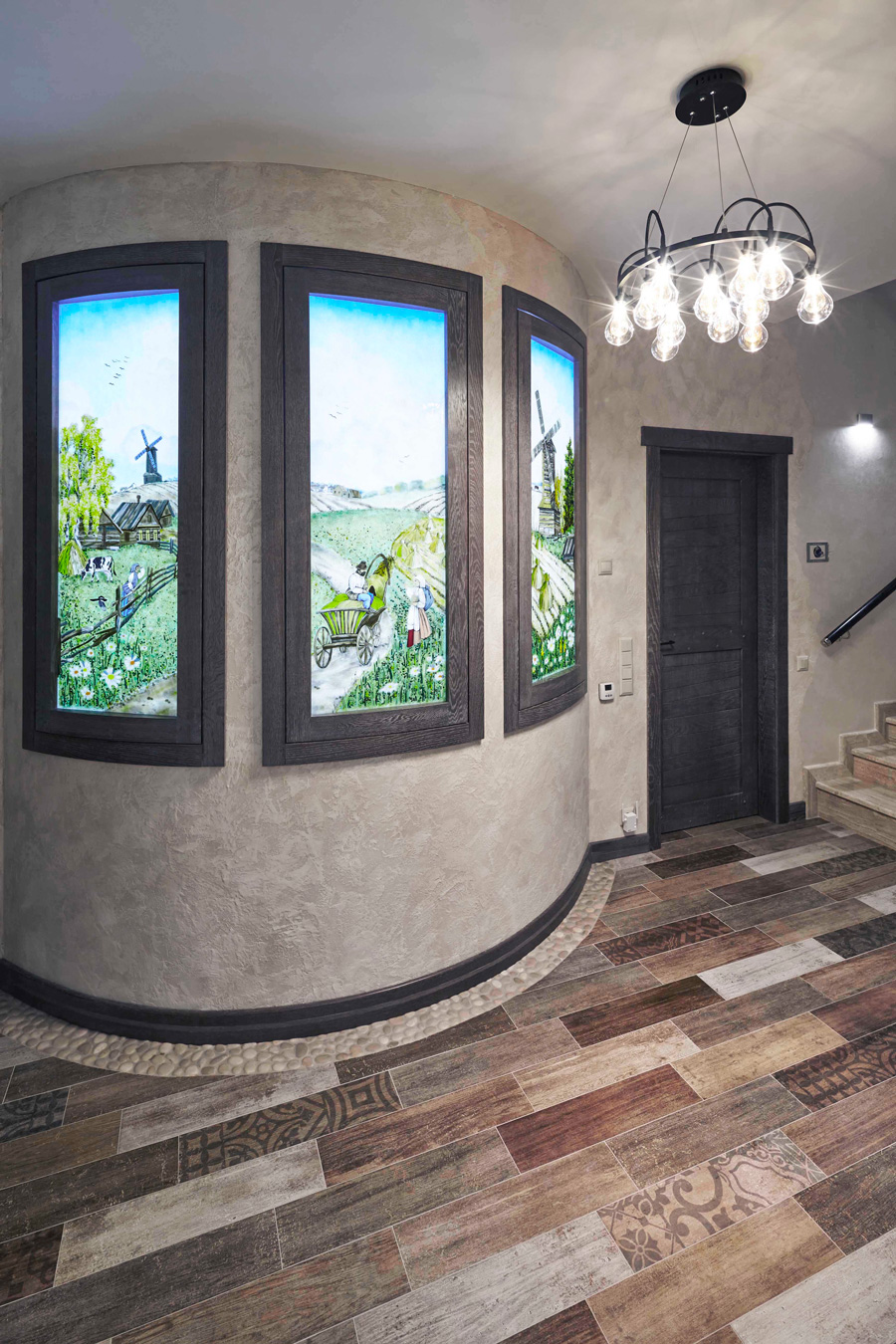 В цоколе функционирует кухня с настоящей дровяной печью, в которой можно не только запекать мясо или рыбу, но и также приготовить великолепную пиццу. Интерьер цокольного этажа необычен и представляет собой индивидуальное современное кантри с выполненной под заказ мебелью и удивительной люстрой с витражными элементами, повторяющими рисунок изразцов эксклюзивной печи. Так же в цоколе дома есть комфортная wellness-зона со SPA-зоной в морском стиле, гидромассажной ванной и собственным массажным кабинетом. Персонализированный интерьер дома в Подмосковье стал удобным местом для постоянного проживания заказчиков.