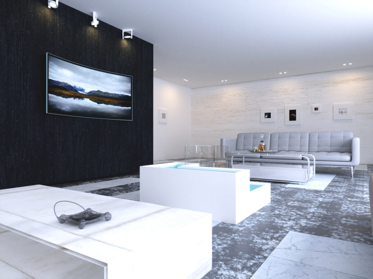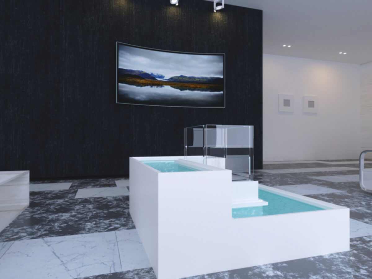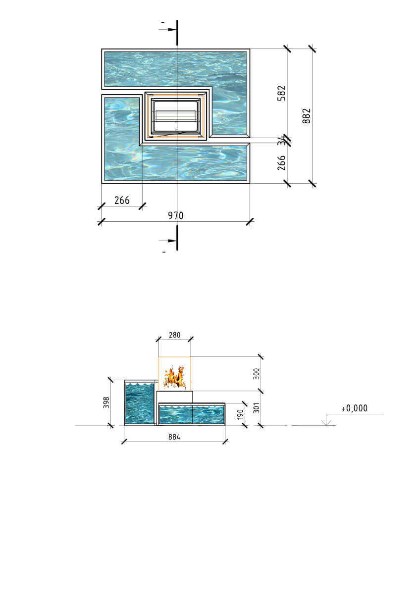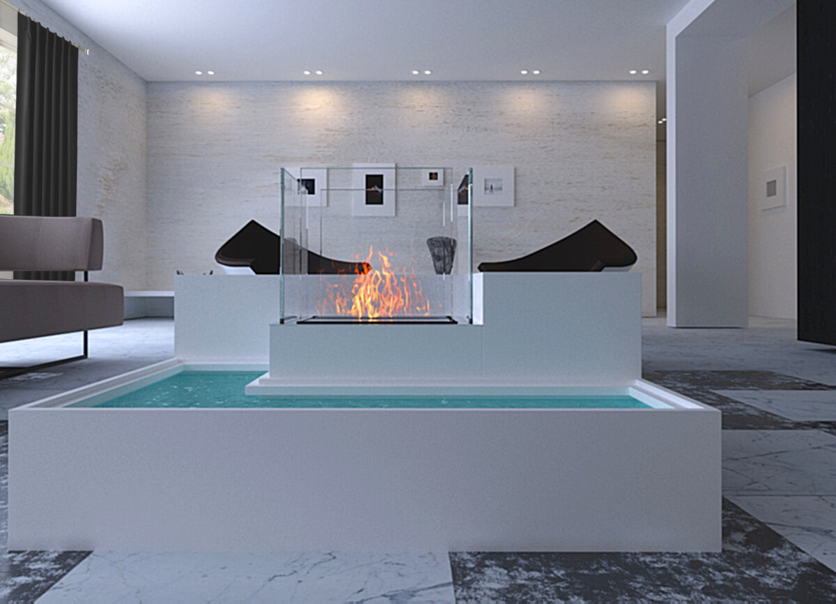 В данном случае камин представлен как костер на берегу реки. Тепло, полыхание огня и журчание воды создают покой и умиротворение.