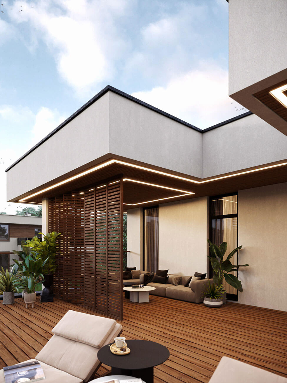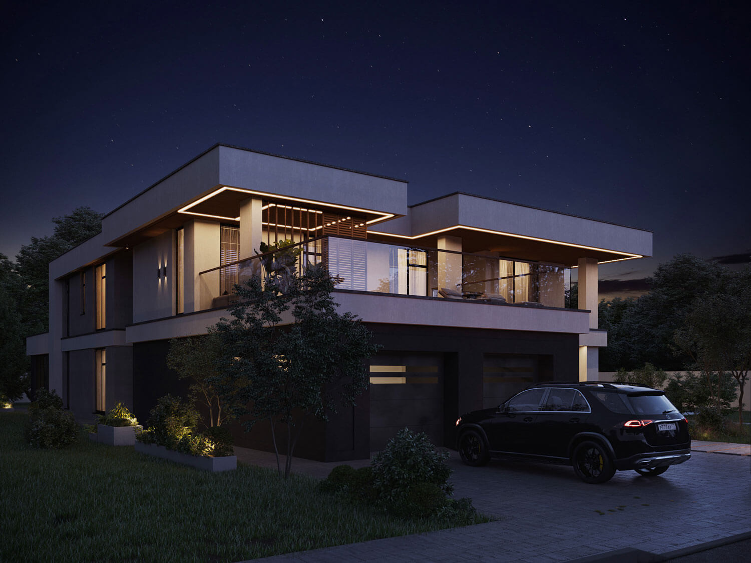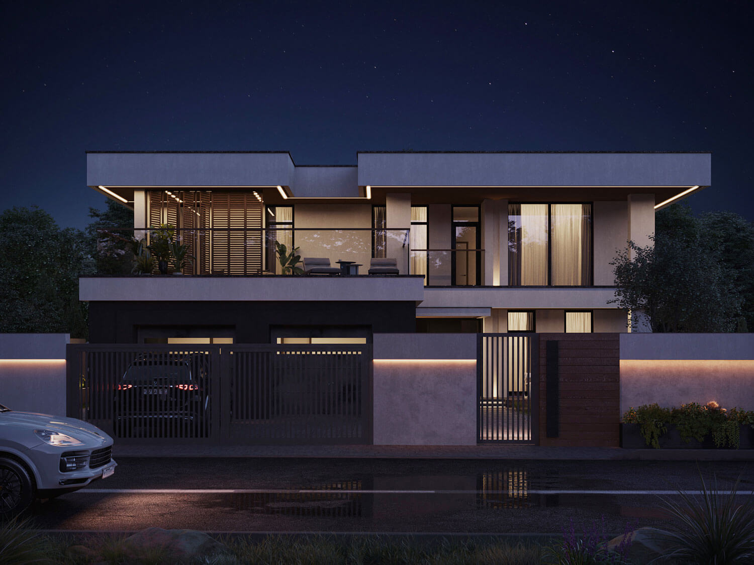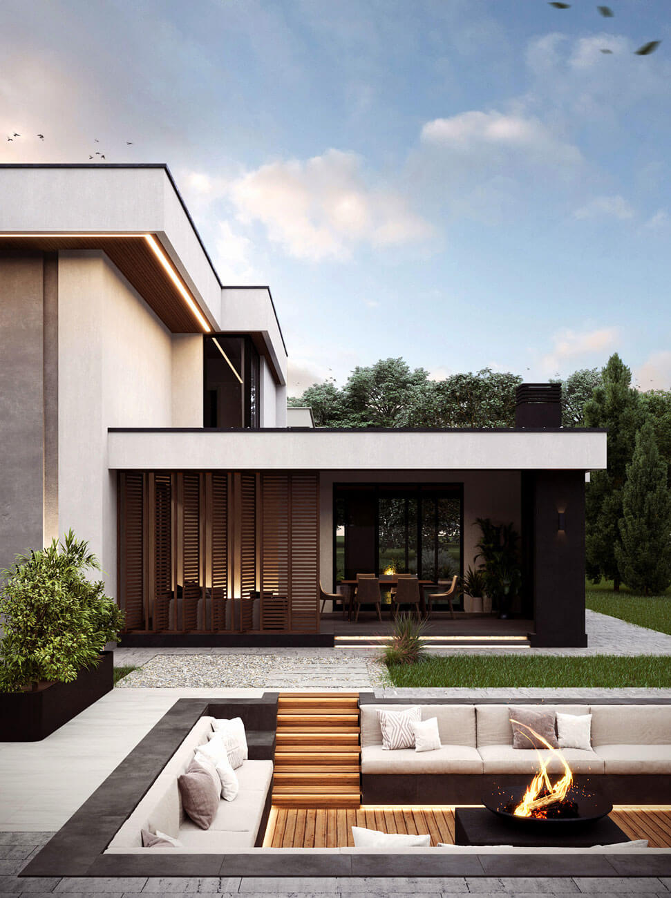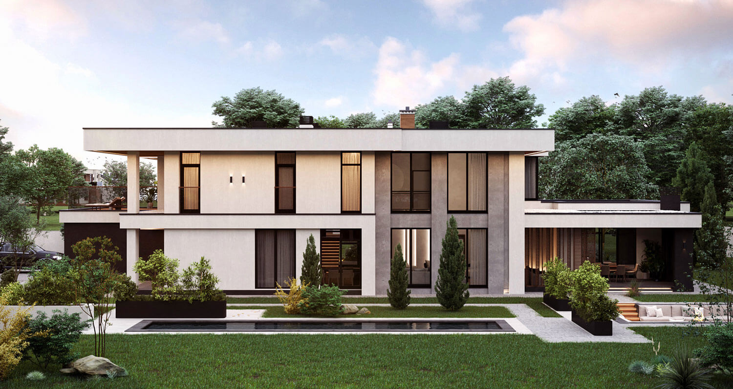 Важный аспект при проектировании этой виллы - вопрос естественного освещения, все значимые помещения оснащены витражными большими окнами в пол, что визуально расширяет пространство и позволяет чувствовать себя комфортно и свободно, находясь внутри дома.