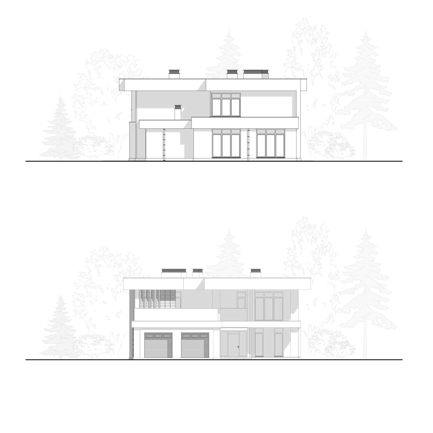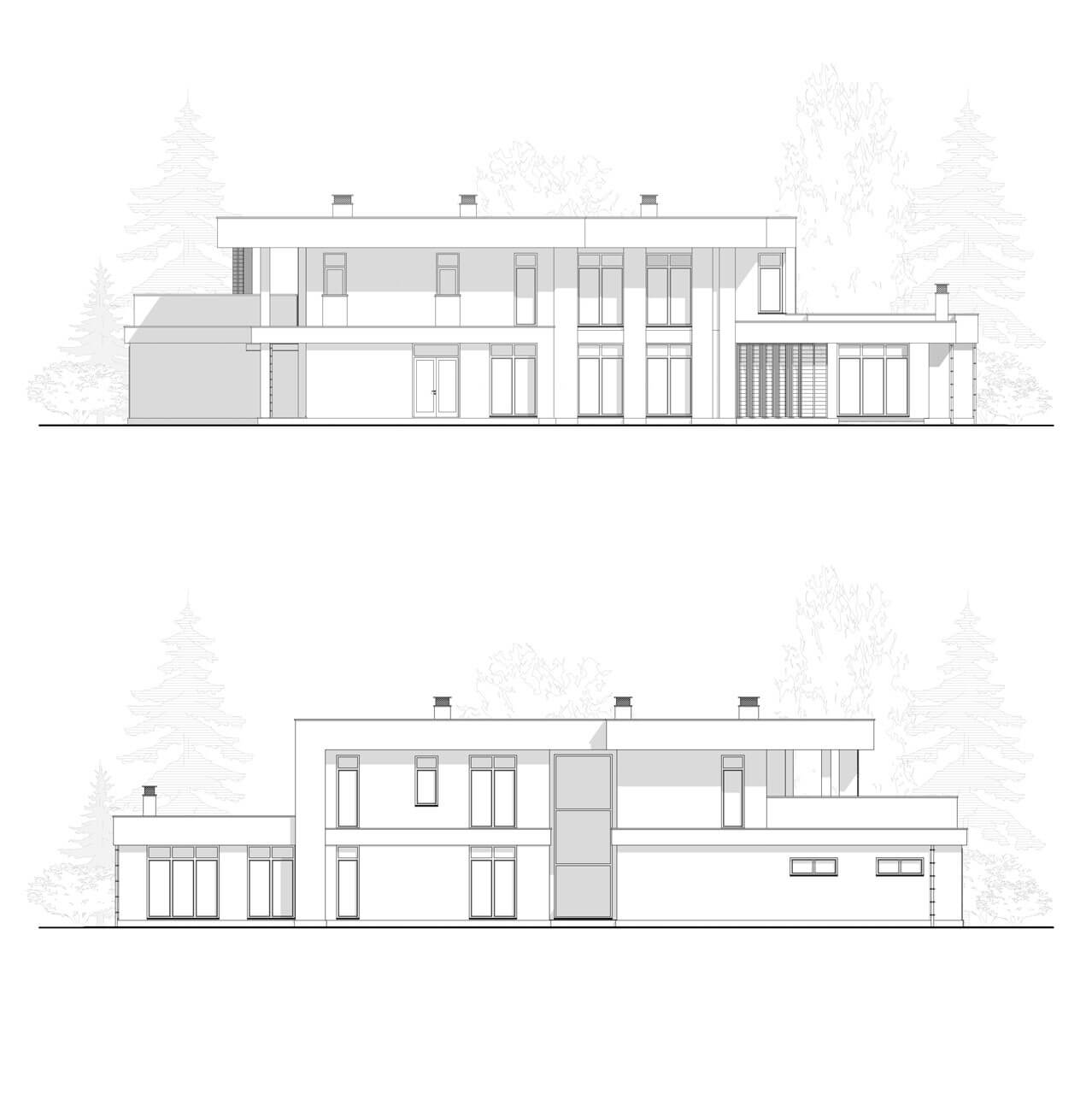 Планировочное решение первого этажа представляет собой связность основных функциональных пространств. Входная зона оснащена вместительной гардеробной и санузлом, также продумана кладовая, расположенная между коридором и кухней. Из гаража на два автомобиля предусмотрен доступ в дом и в котельную.