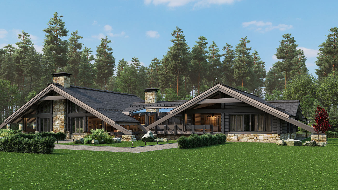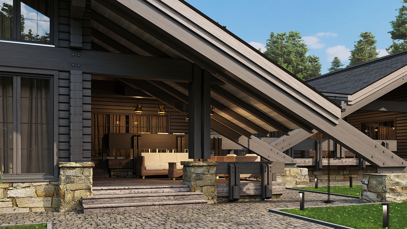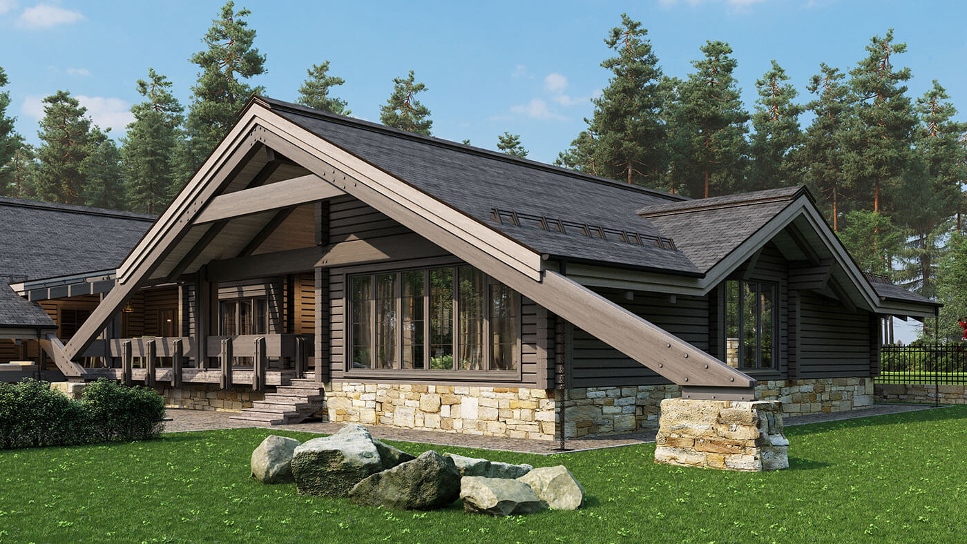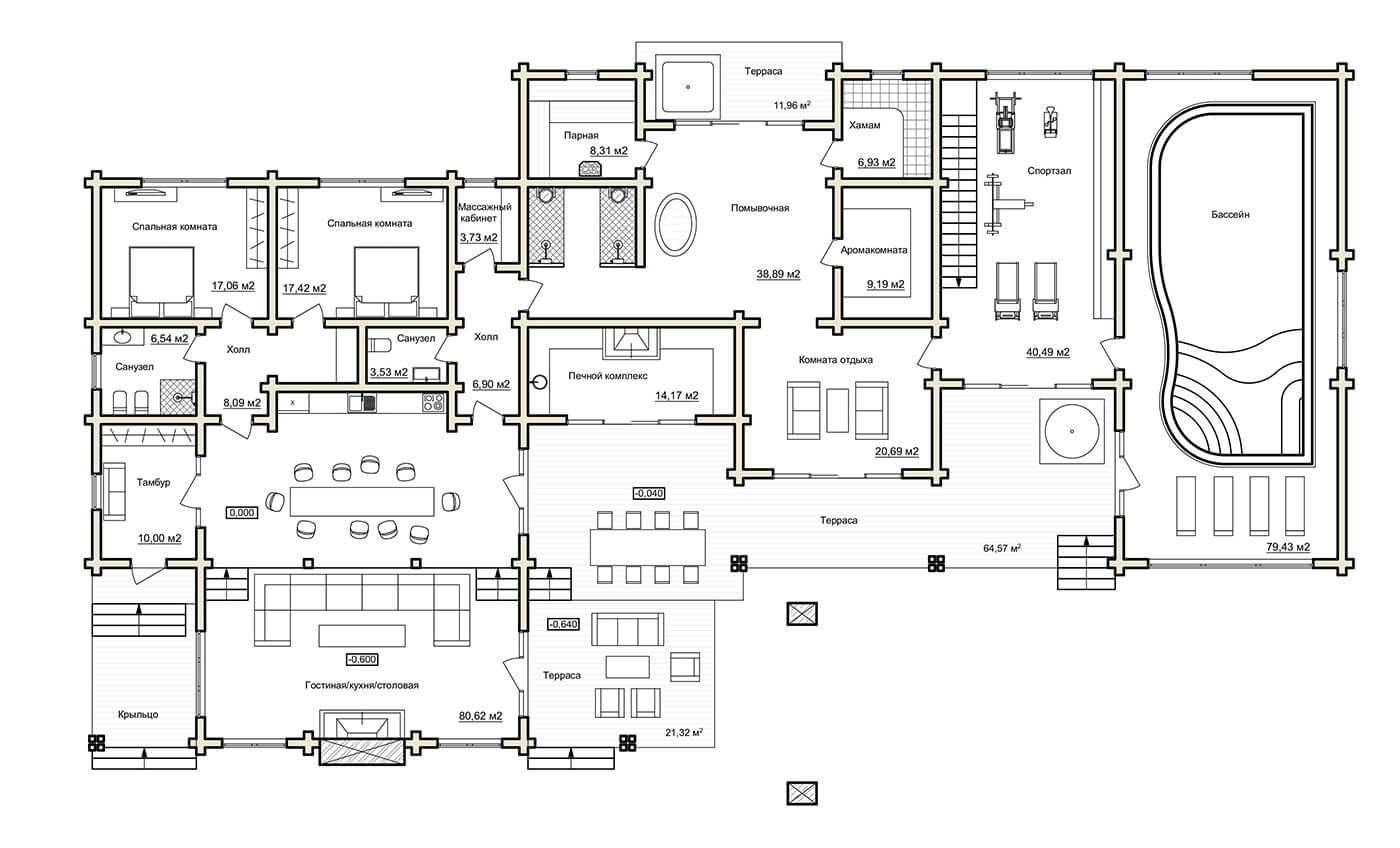 Жилой дом из клееного бруса «Пирамида плюс» — это большой многофункциональный комплекс, предназначенный как для проживания, так и активного отдыха. Помимо спален, жилых комнат и помещений общего назначения в нем есть большая спа-зона с хаммамом и сауной, спортивный зал, большой бассейн и несколько террас различного назначения. Общая площадь внутренних помещений — 370 кв.м; общая площадь террас — 100 кв.м.