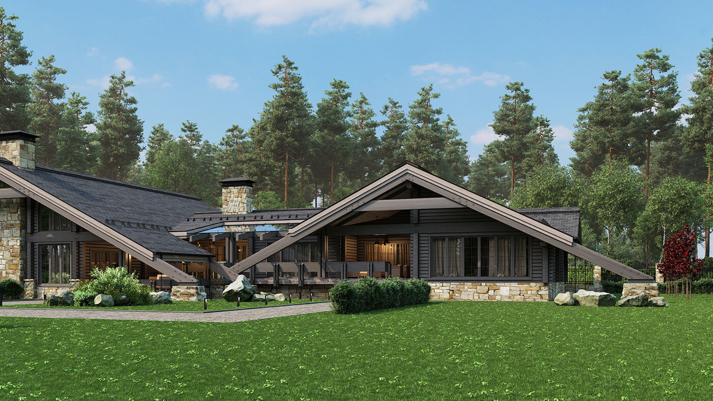 Доминанта — двухуровневая столовая-гостиная с огромным камином и панорамным остеклением. Из нее организованы выходы на две террасы: на верхнюю обеденную, с большой летней кухней и зоной барбекю, и нижнюю лаунж-террасу с диванной группой. Ближе к бассейну запроектирована терраса с джакузи. По всему фасаду устроены большие, в пол раздвижные окна. Большая терраса связывает все помещения.