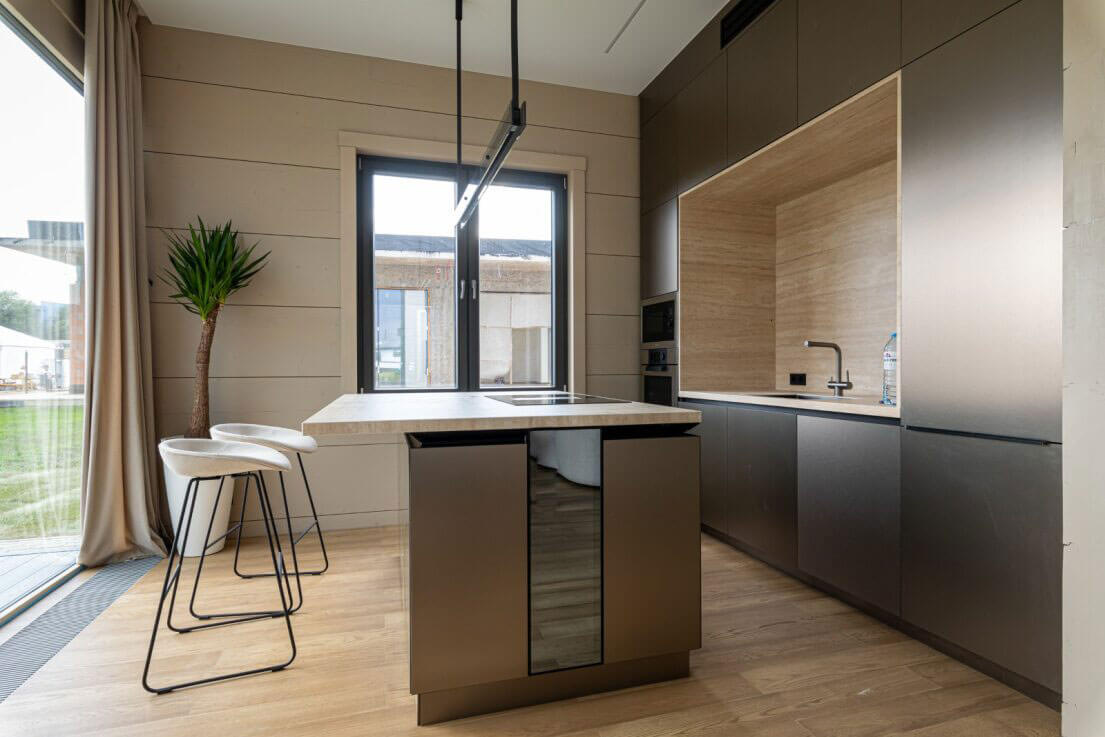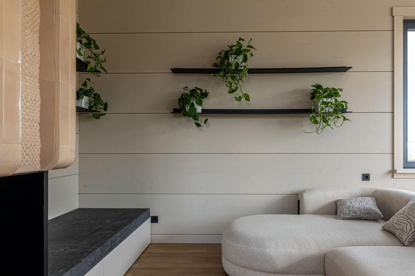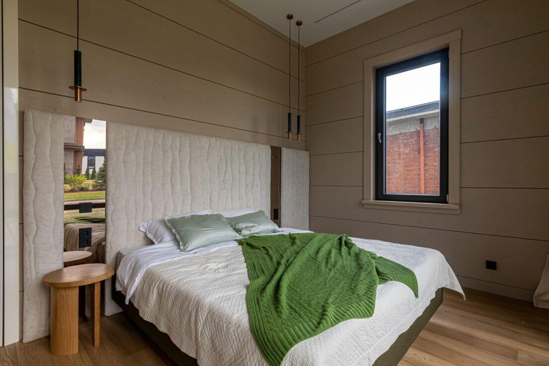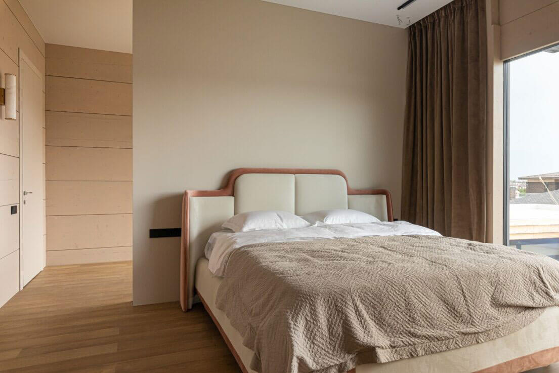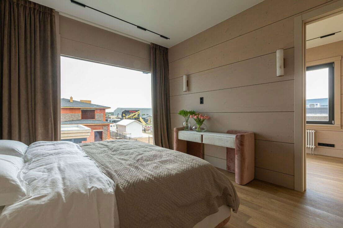 Необычность этого интерьера — в синтезе футуристических и природных мотивов. Вместо стандартных прямых линий и строгих модулей пространство живёт по принципам «бионики»: ощущения тактильности, органической текучести, невербального комфорта, а встроенное озеленение на черных полках подчеркивает стремление соединить функционал с природной эстетикой. Плавные линии мебели поддержаны даже в спальных комнатах — изголовье кровати выполнено из рельефного текстиля с волнообразным рисунком.