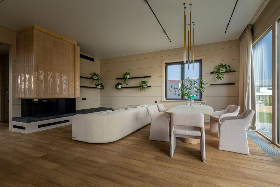 Центральное место занимает зона лаунжа с величественным камином, помещённым в массивную керамическую оболочку с плавно скруглёнными гранями. Этот архитектурный элемент напоминает монолитную арт-инсталляцию, мягко отделяющую гостиную от смежных зон и одновременно формирующую уютный центр притяжения. Светлая облицовка камина с легким глянцем усиливает эффект текучести линий, улавливая и отражая потоки естественного света.