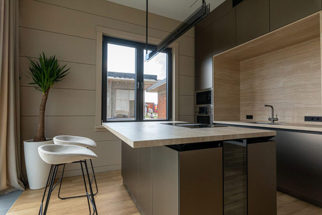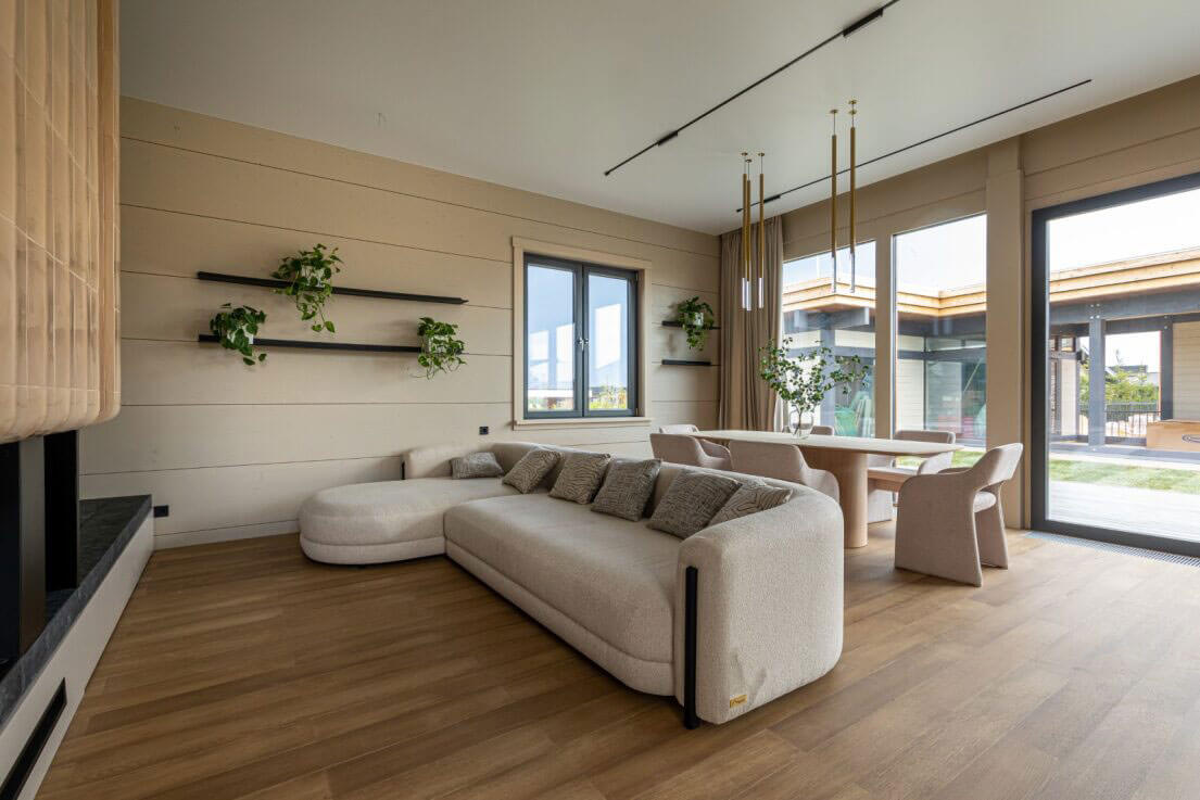 Интерьер дома в стиле «Пластический Лаунж» построен на выразительном архитектурном сочетании мягких, обтекаемых форм и лаконичных поверхностей, что определяет современный и одновременно органичный характер пространства. Ключевой архитектурной особенностью этой концепции становится пластика линий в мебели, отделке и отделочных деталях — пространстве нет агрессивных углов или резких переходов, всё течет и перетекает друг в друга.