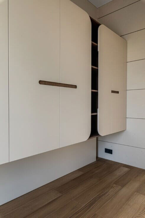 Мебель продолжает общую концепцию: диваны и кресла выполнены в свободной, органичной форме, позволяя пространству дышать и исключая визуальную тяжесть. Спинки и основания мягкой мебели словно «обтекают» зону отдыха, поддерживая общее ощущение текучести и пластичности. Даже столы и шкафы решены в закругленных очертаниях, без острых углов и выступающих деталей — фасады шкафов с изогнутыми линиями визуально смягчают строгую геометрию стен.