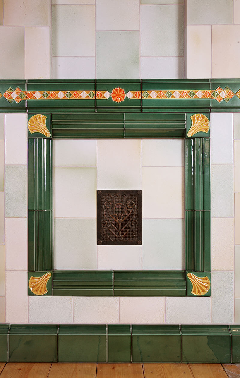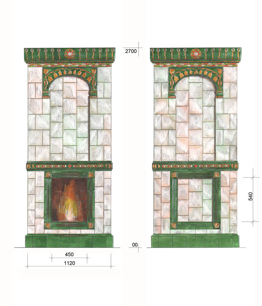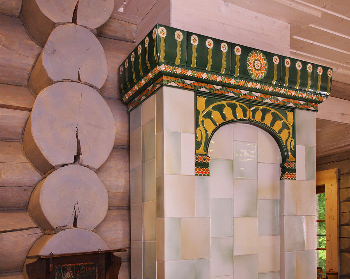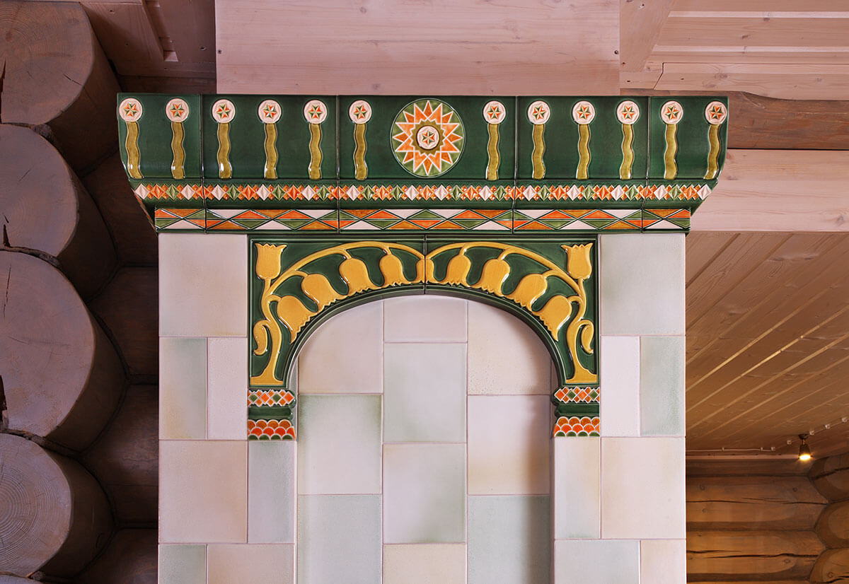 В изразцовом воплощении мы использовали фрагменты мебели Е. Д. Поленовой в поясах, порталах и в короне камина. Фоном для орнаментальных изразцов послужили гладкие изразцы, декорированные светлыми потечными глазурями. Фоновые гладкие изразцы тонально отличаются друг от друга.