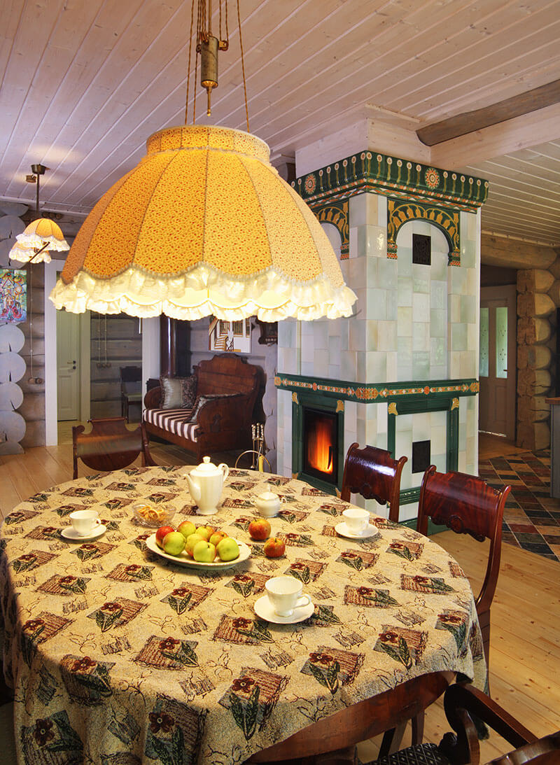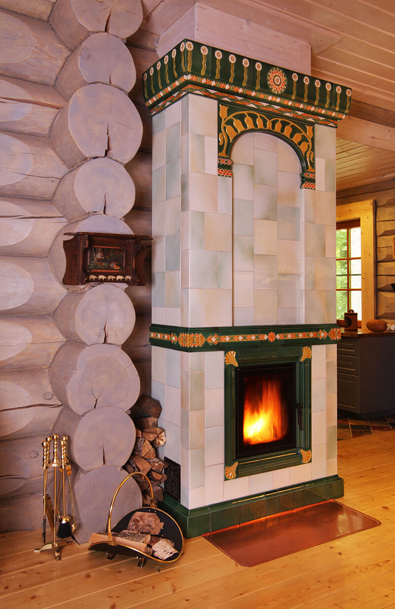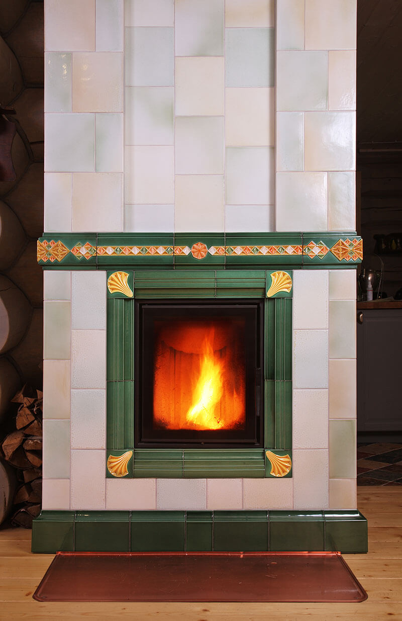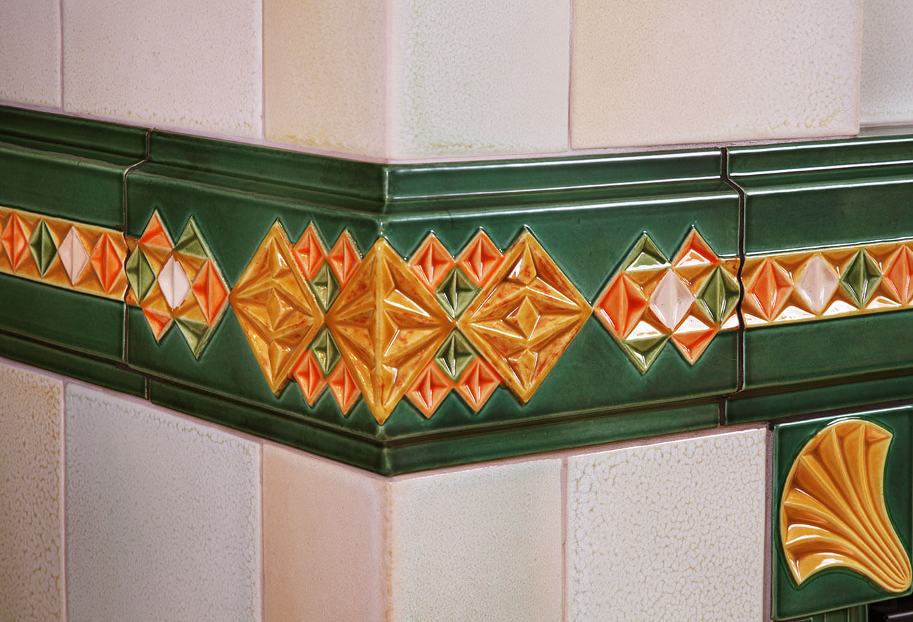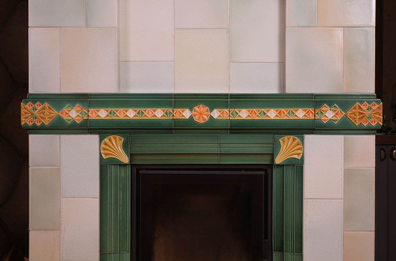 В изразцовом воплощении мы использовали фрагменты мебели Е. Д. Поленовой в поясах, порталах и в короне камина. Фоном для орнаментальных изразцов послужили гладкие изразцы, декорированные светлыми потечными глазурями. Фоновые гладкие изразцы тонально отличаются друг от друга.