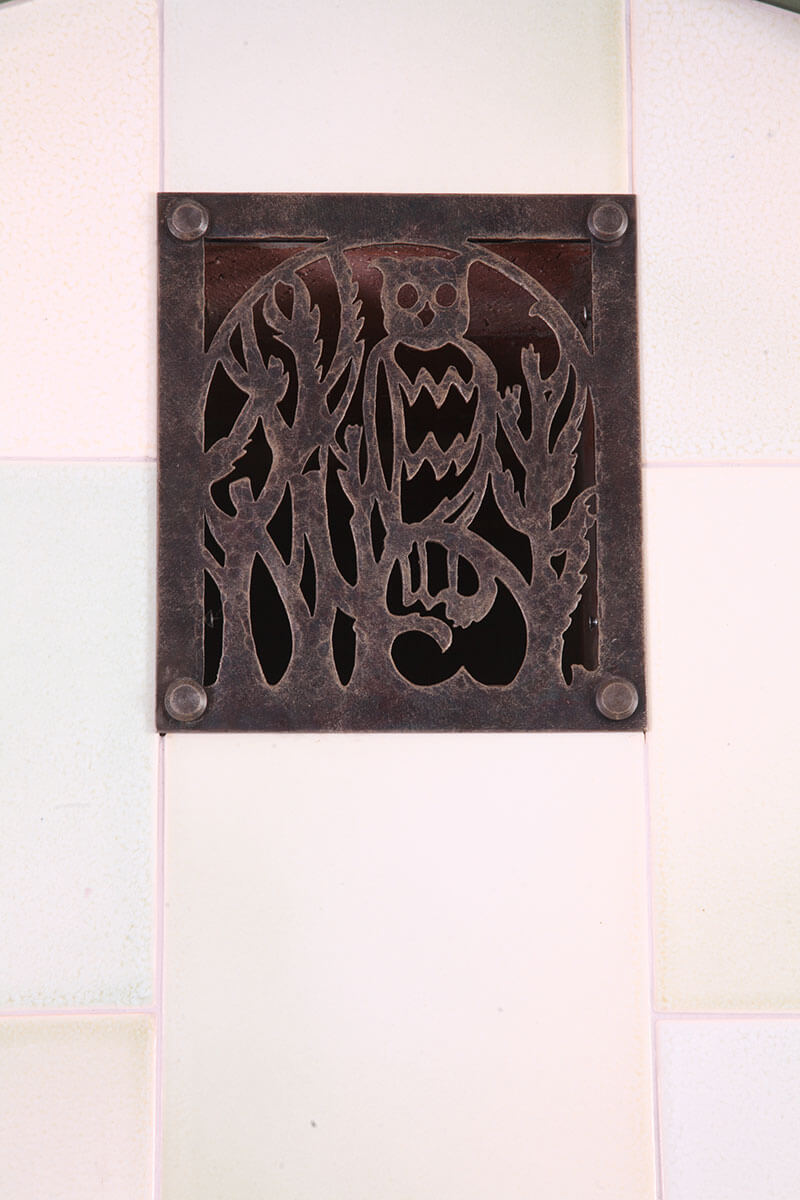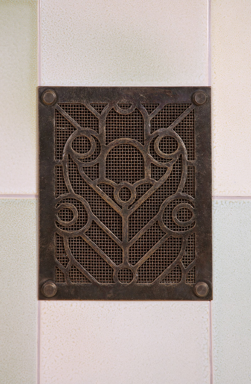 Конвекционные решетки выполнены из просечной листовой стали с канфарением и чернением. Сюжетные мотивы также взяты из изделий, сделанных по эскизам Поленовой Е. Д.