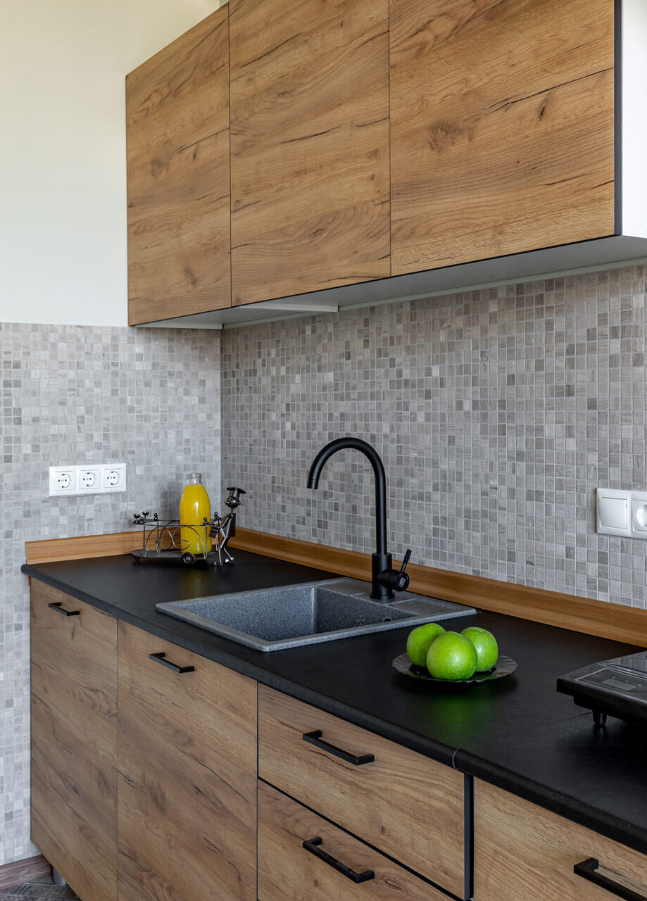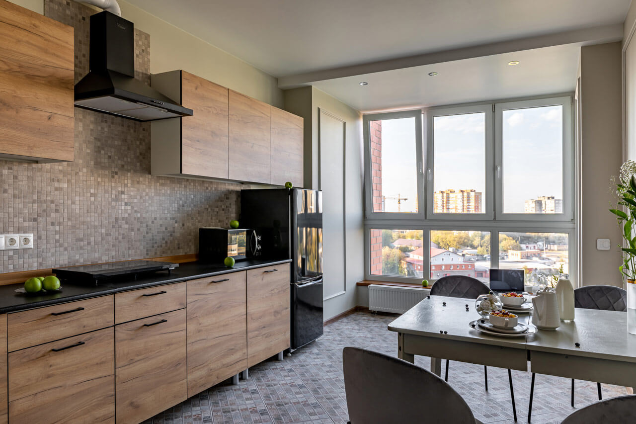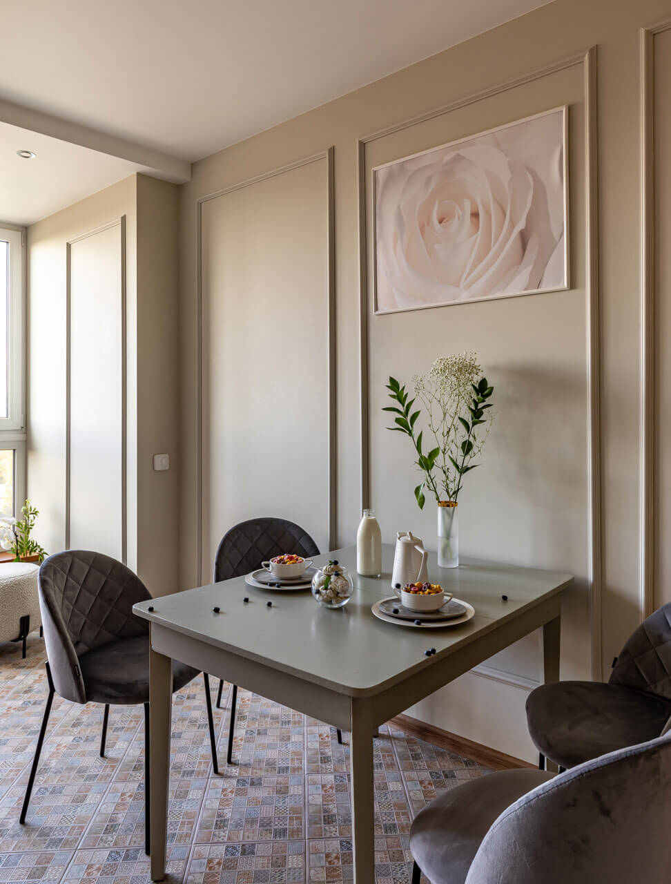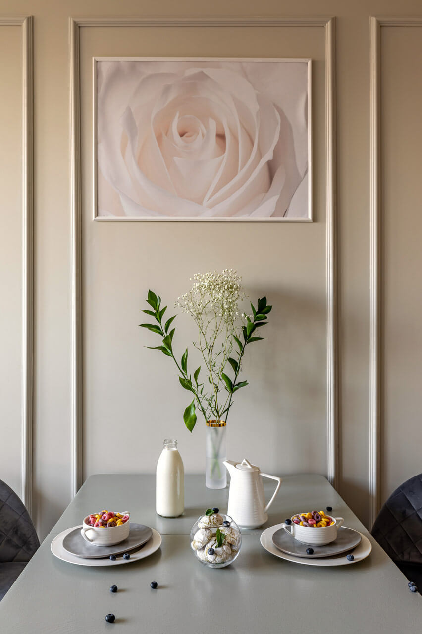 В проекты применены авторские предметы столярных изделий и декора. Девушке по наследству перешел старинный стол, его хозяйка решила оставить. Стол был отреставрирован и помещен на кухне.