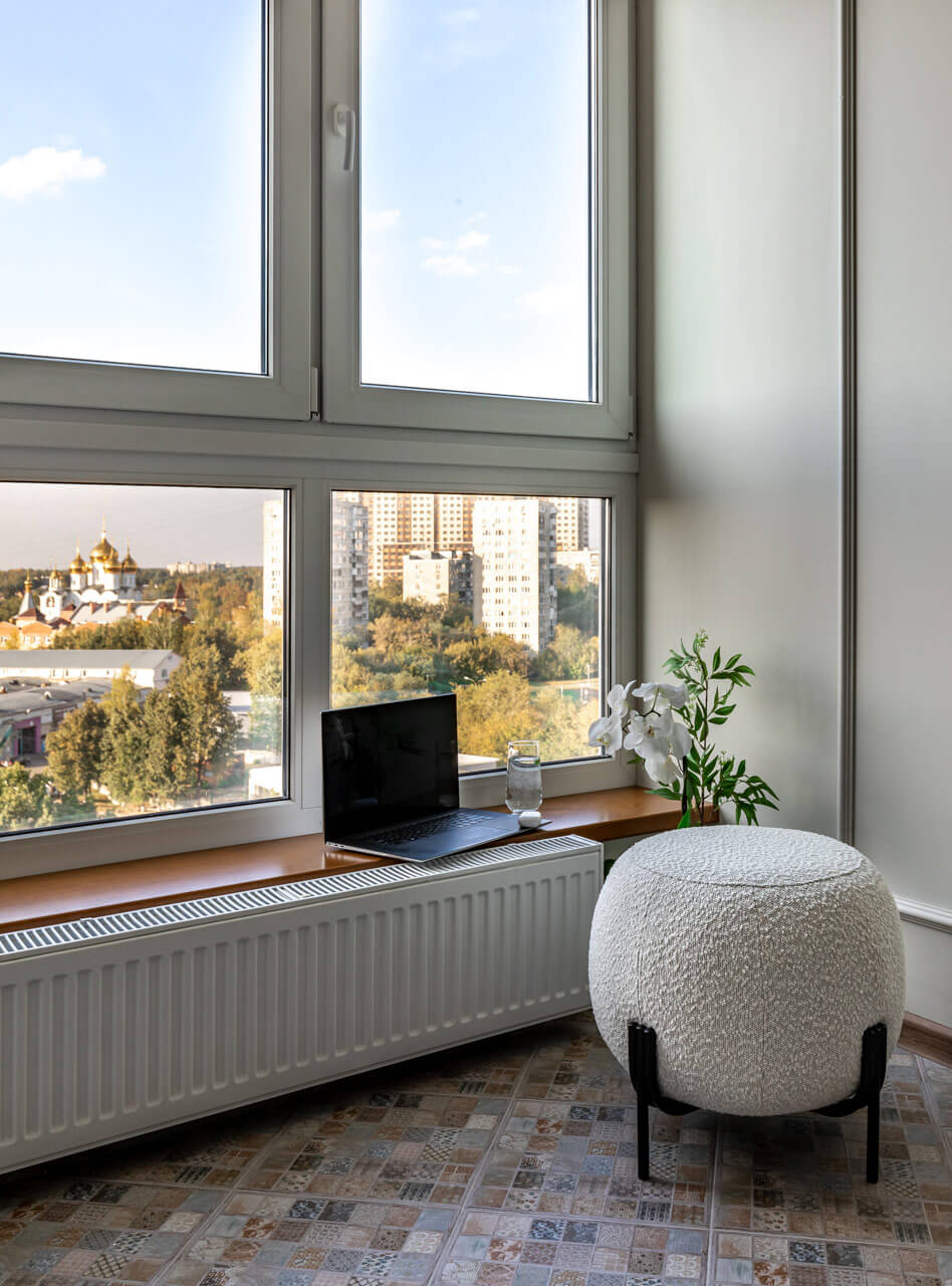 Помещение полностью отделено от внешнего шума и городской суеты — размышлять, наблюдая из окна за бескрайними просторами природы, не покидая города, для хозяйки не мечта, а реальность.
