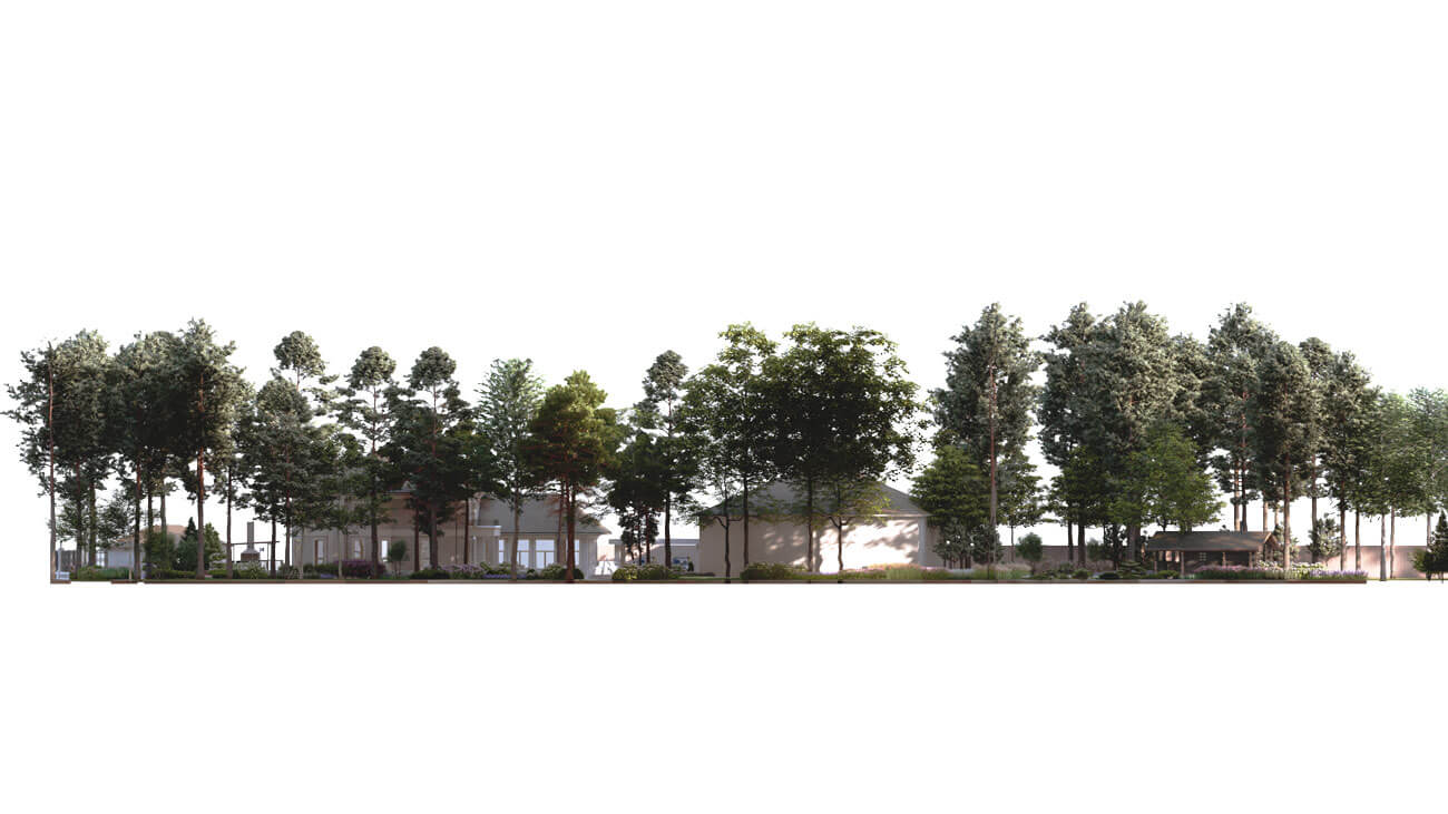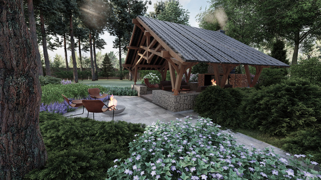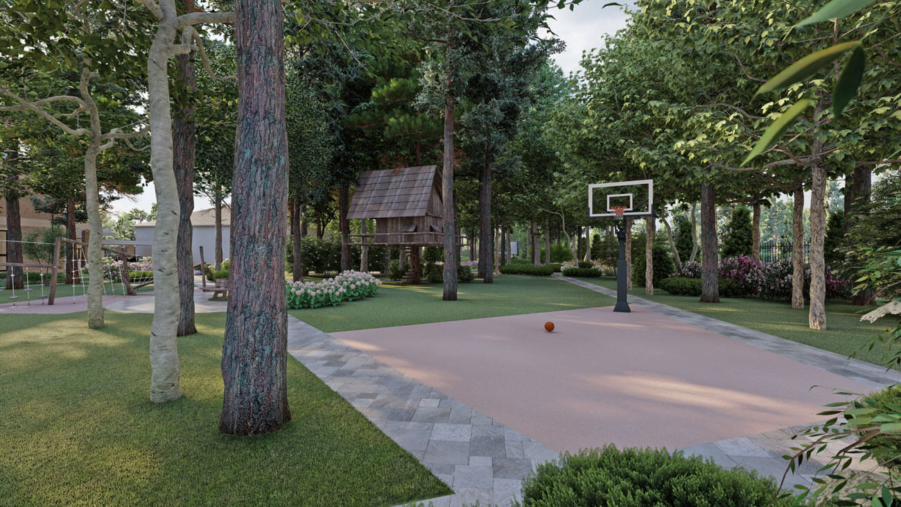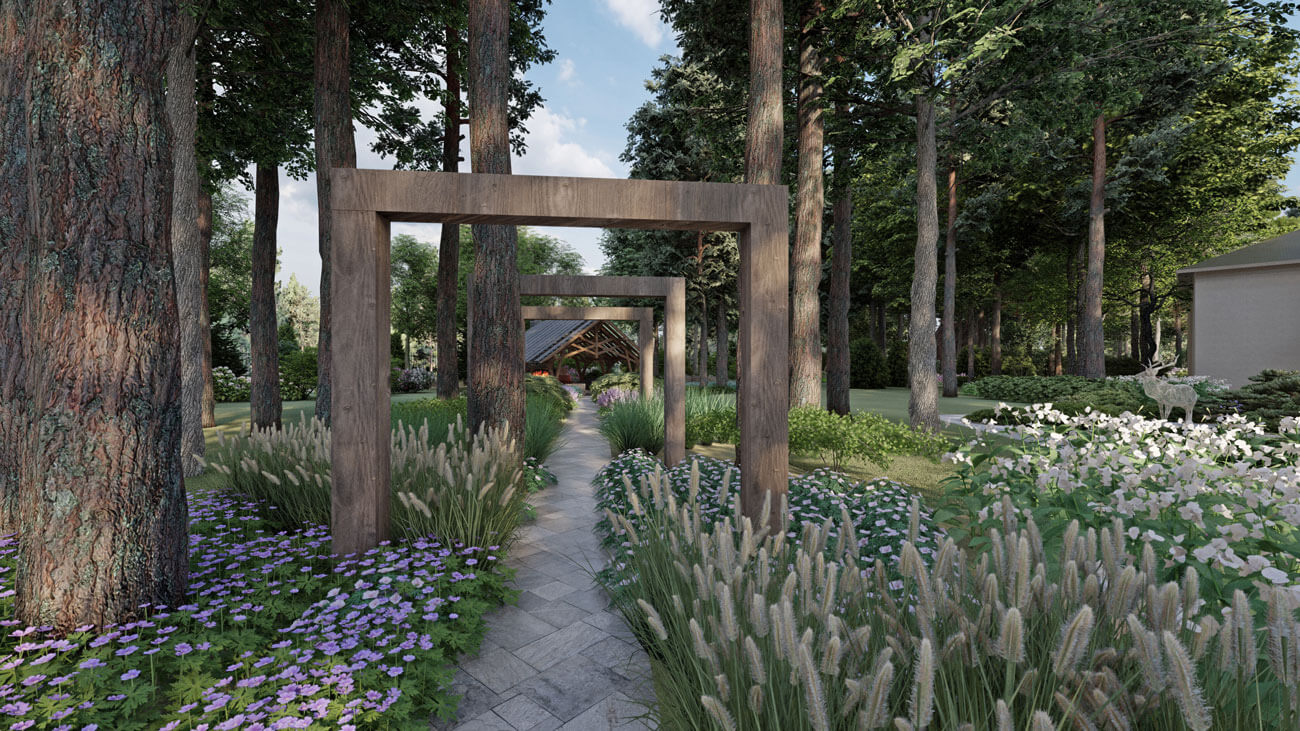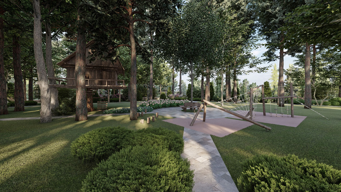 Следуя по дорожкам сквозь лес, вам открываются виды налесные цветники, которые хорошо адаптируются к тени деревьев и, при этом, дают приятное цветение. Дорожки имеют ломаную геометричную структуру, которая гармонично вписывается между деревьями. За счет такой траектории дорожек удалось сохранить большую часть деревьев, а прямые линии позволяют соединить функциональные зоны кратчайшим путем.