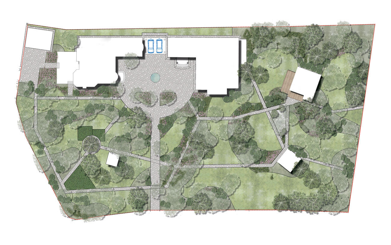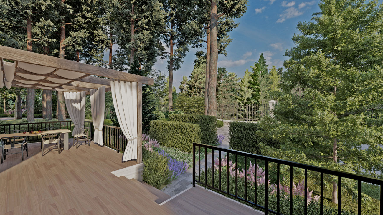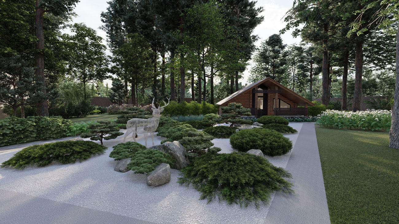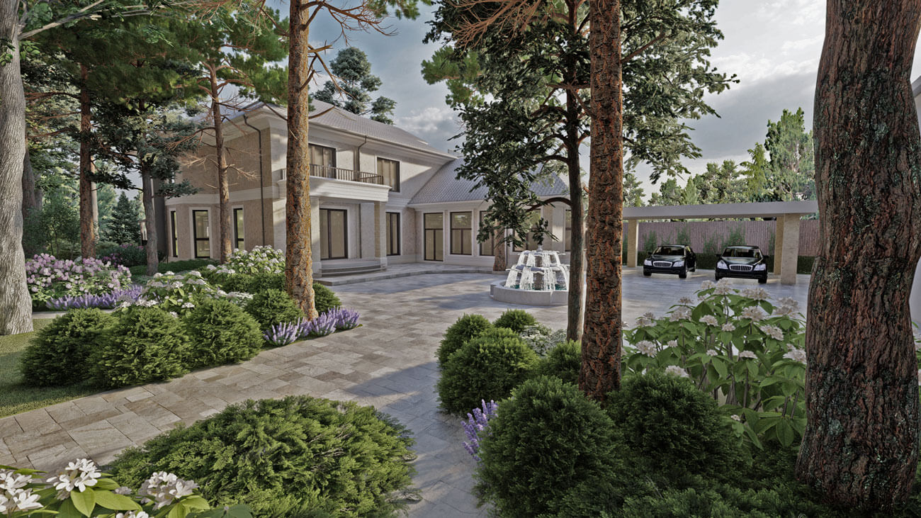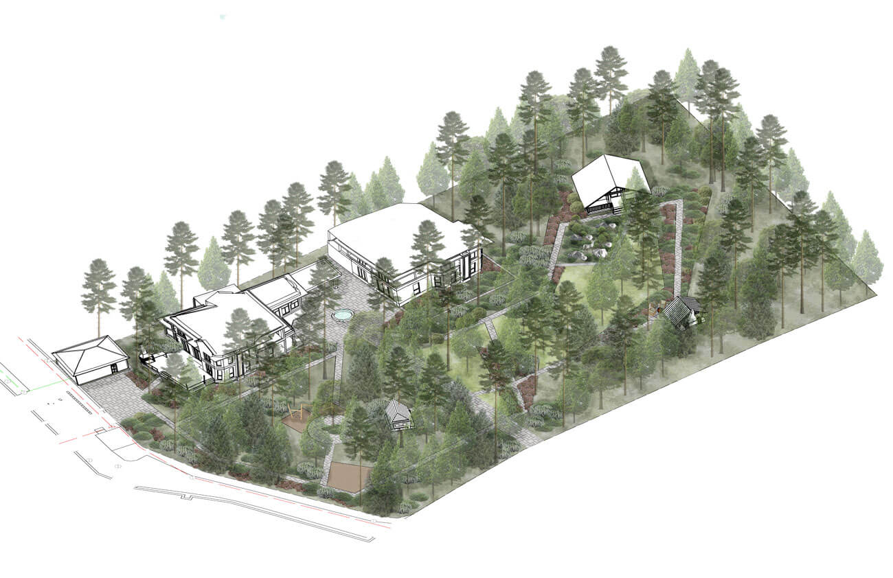 Концептуальное решение участка основано на главной идее сохранения существующих вековых деревьев. На участке начинается настоящее путешествие под пологом леса. Таинственная лесная тропа, магический свет, пробивающийся сквозь кроны деревьев, исмена видовых планов. Чередование открытых и закрытых пространств создает многоплановость ландшафта.