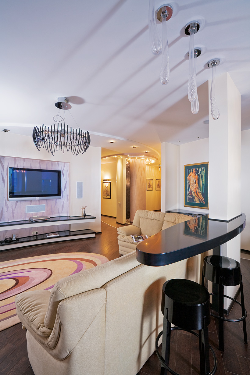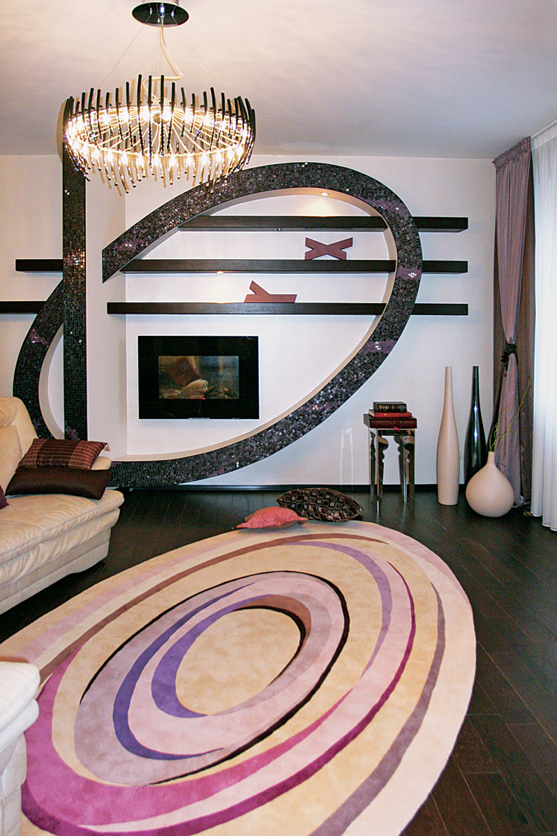 Гостиную от столовой отделяют две несущие колонны. Рядом с одной из них установлен электрический камин, вписанный в овальную настенную конструкцию из гипсокартона, облицованную фиолетово-коричневой плиткой с кристаллами Swarovski. По горизонтали овал пересекают длинные полки, шпонированные венге, а по вертикали — несущая колонна, украшенная той же плиткой. Визуально инсталляция из геометрических фигур напоминает произведения конструктивистов начала XX века.