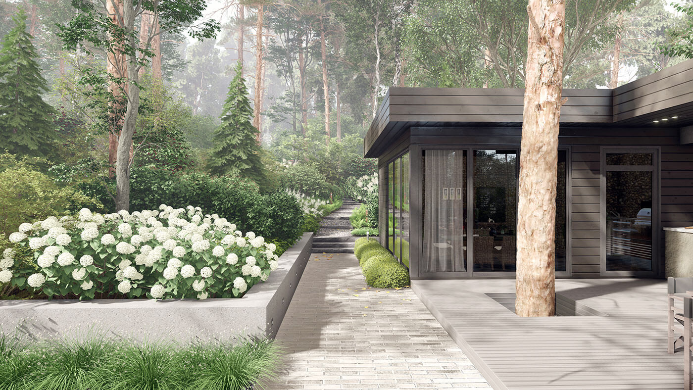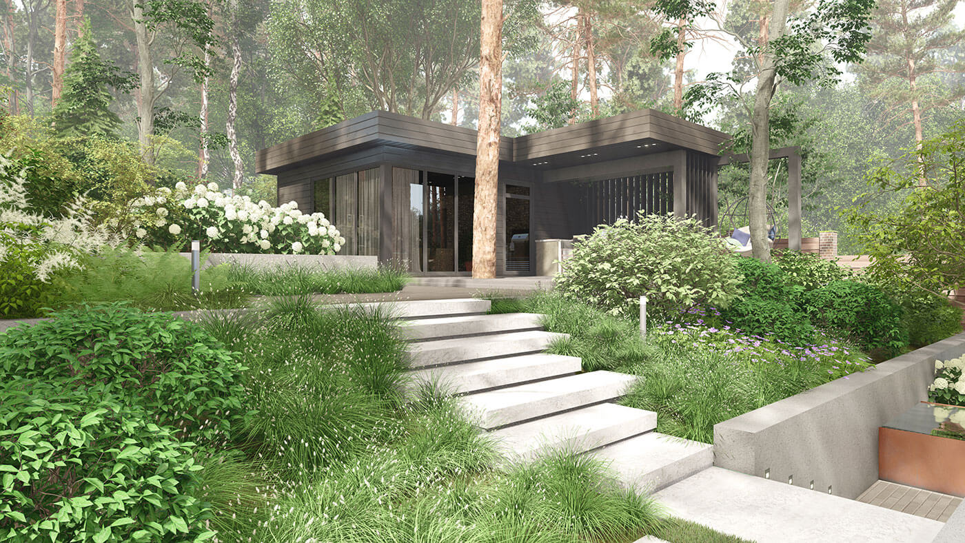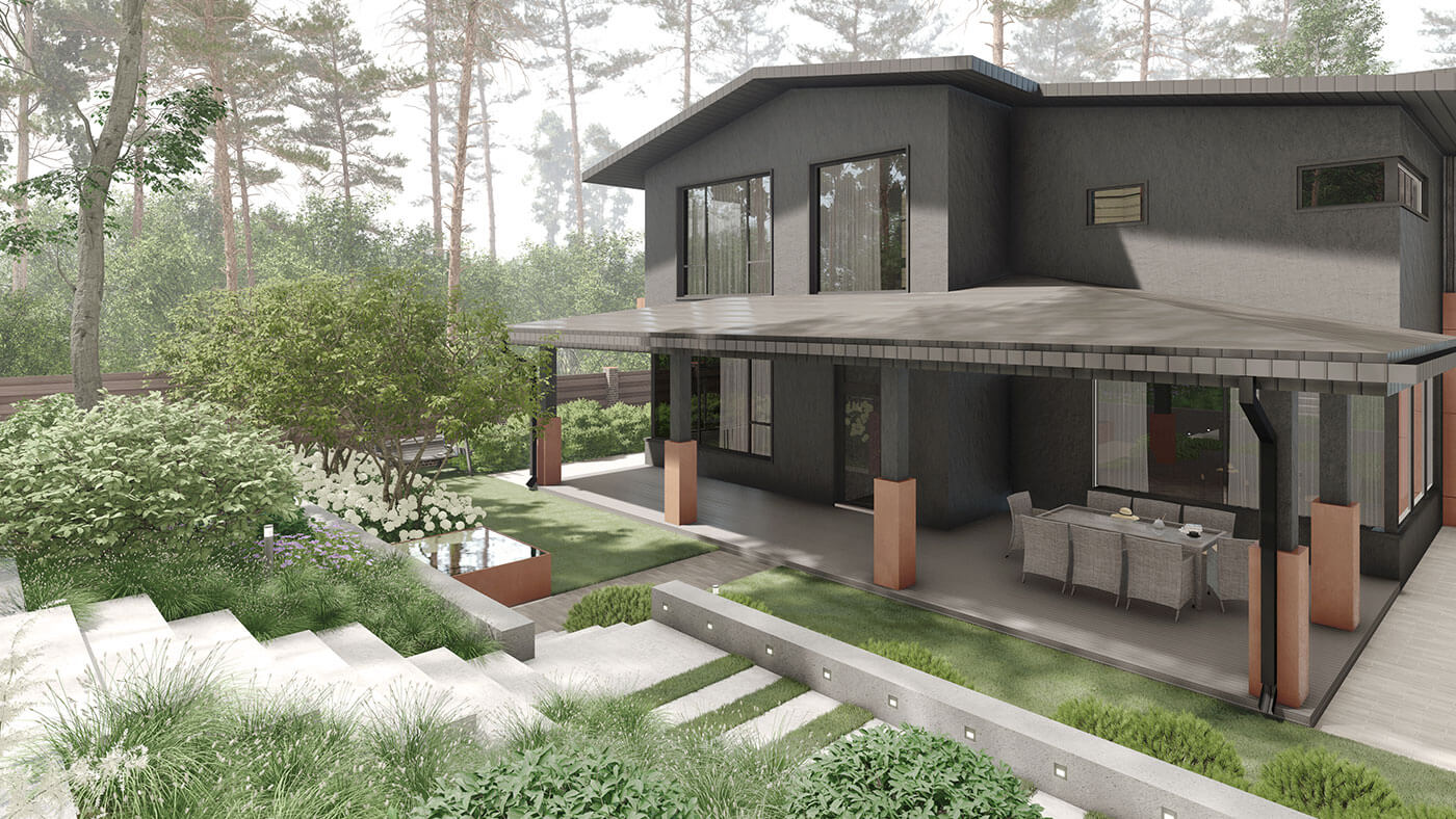 Дом в современном стиле на лесном участке с большим перепадом высот — уникальное сочетание и прекрасное «поле» для создания красивого сада.