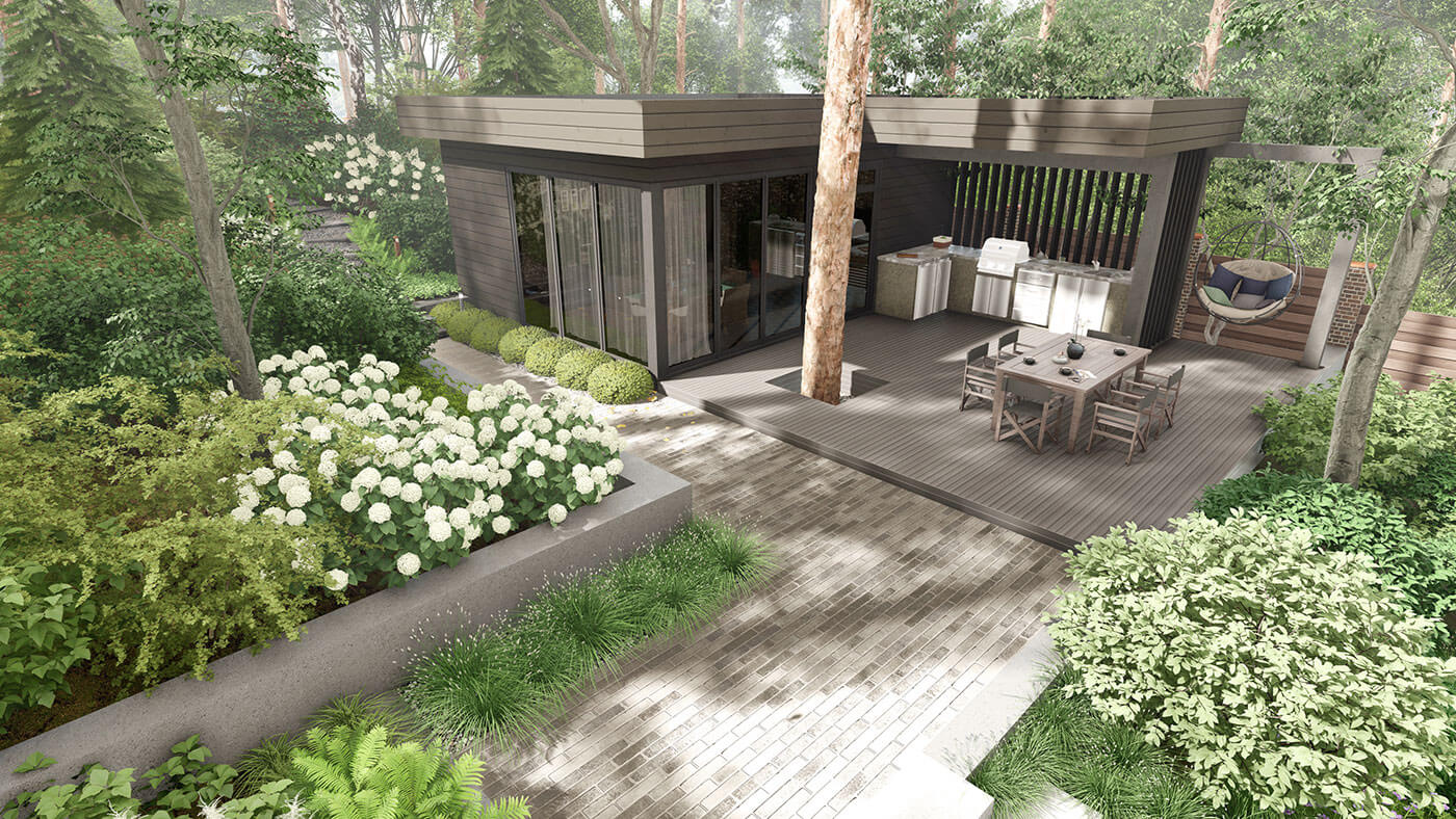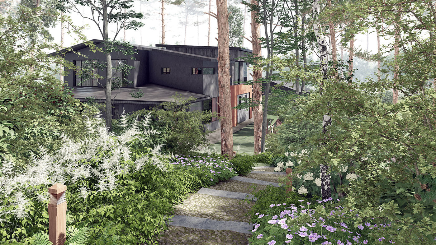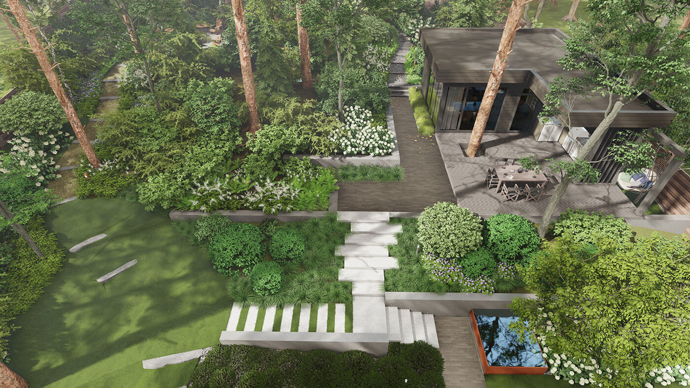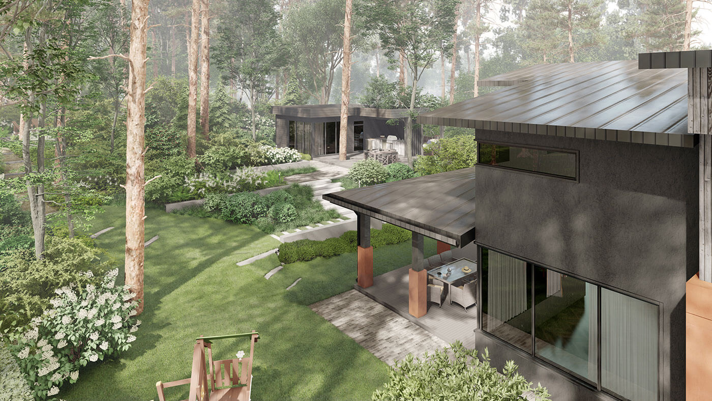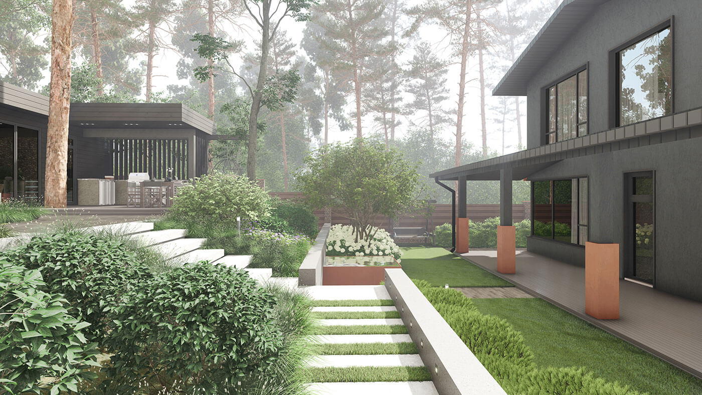 В саду, построенном с уважением к природе, сохранены существующие деревья. Строения концентрируются в восточной части, тогда как западная сторона участка остается нетронутой. Просторная беседка с летней кухней вместит большое количество гостей, которые смогут разместиться на террасе с обеденной зоной и качелями. Пространство между домом и беседкой решено с помощью подпорных стен и лестниц, утопающих в зелени. Современные материалы — бетон, декинг, кортен — и встроенное освещение контрастируют с обилием растений.