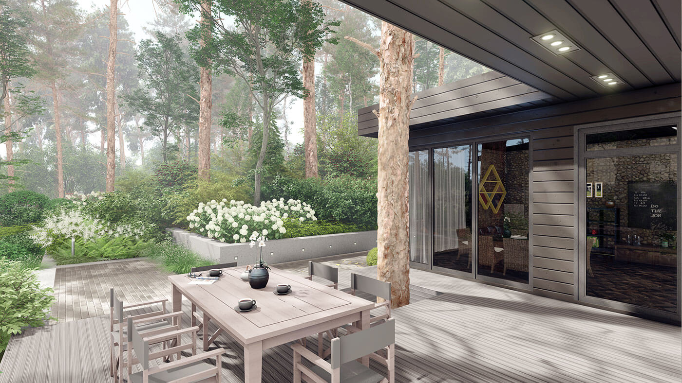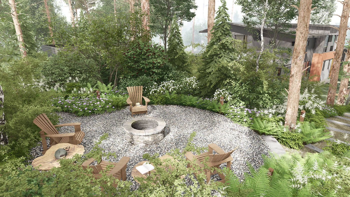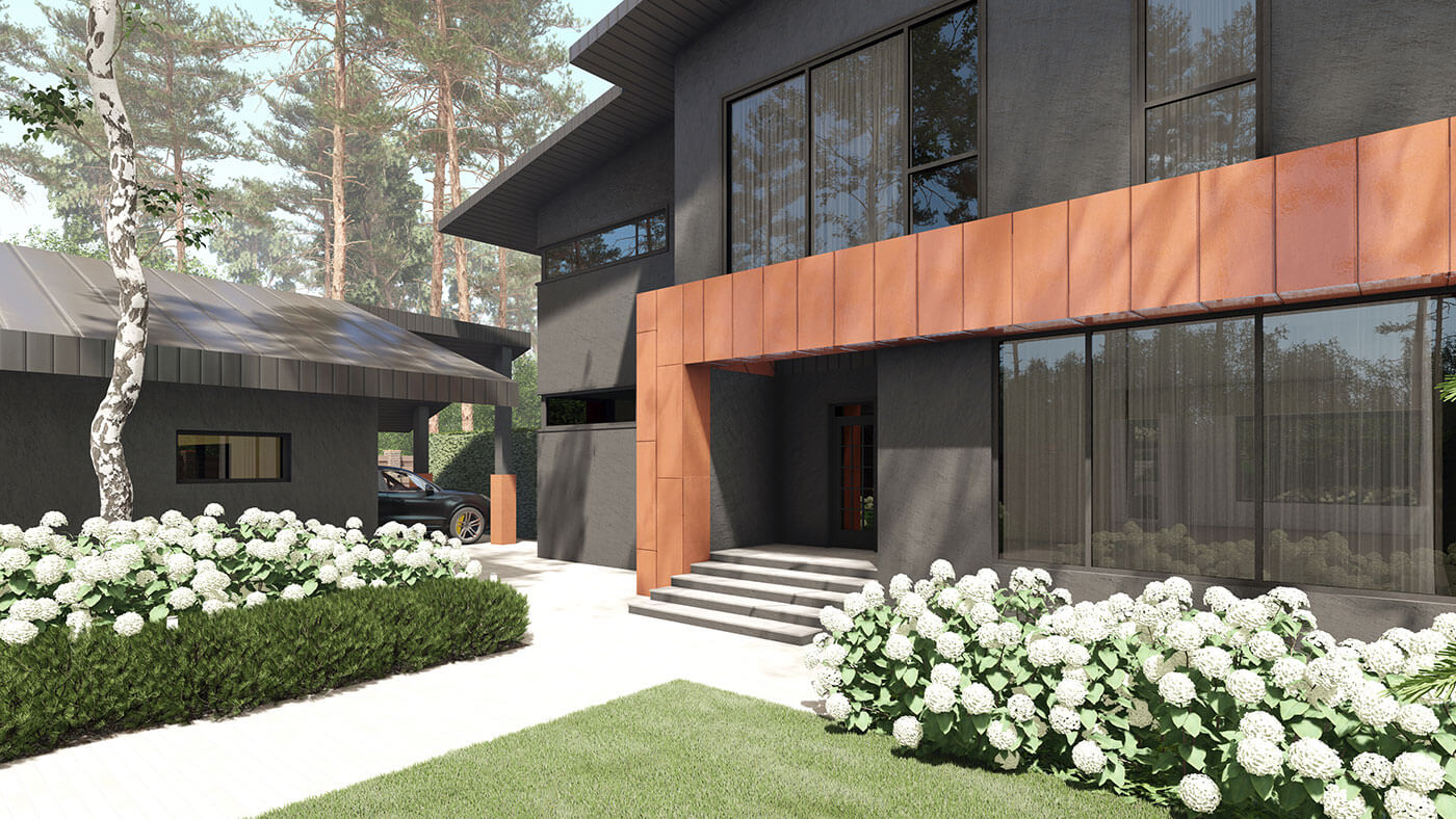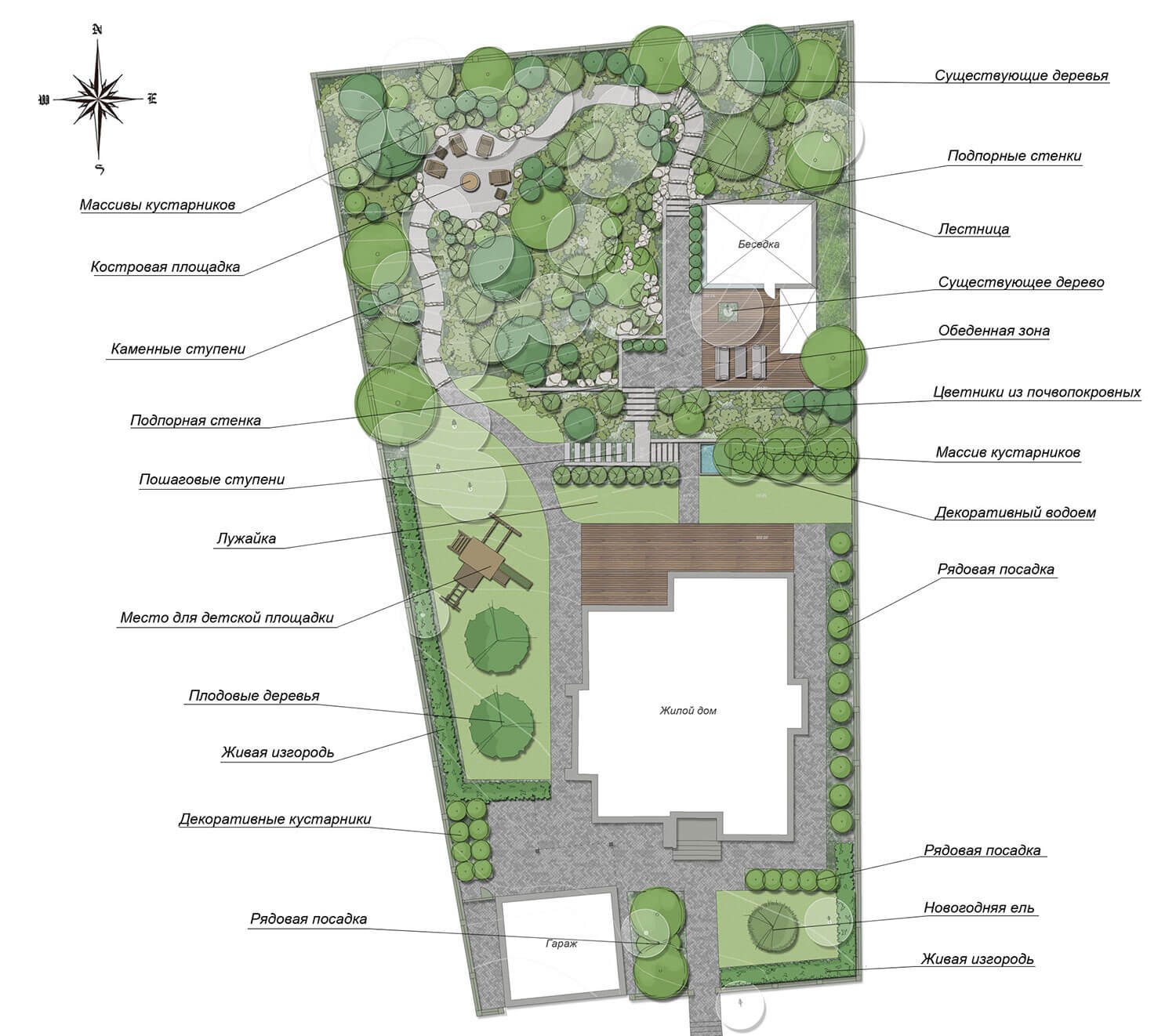 В саду, построенном с уважением к природе, сохранены существующие деревья. Строения концентрируются в восточной части, тогда как западная сторона участка остается нетронутой. Просторная беседка с летней кухней вместит большое количество гостей, которые смогут разместиться на террасе с обеденной зоной и качелями. Пространство между домом и беседкой решено с помощью подпорных стен и лестниц, утопающих в зелени. Современные материалы — бетон, декинг, кортен — и встроенное освещение контрастируют с обилием растений.