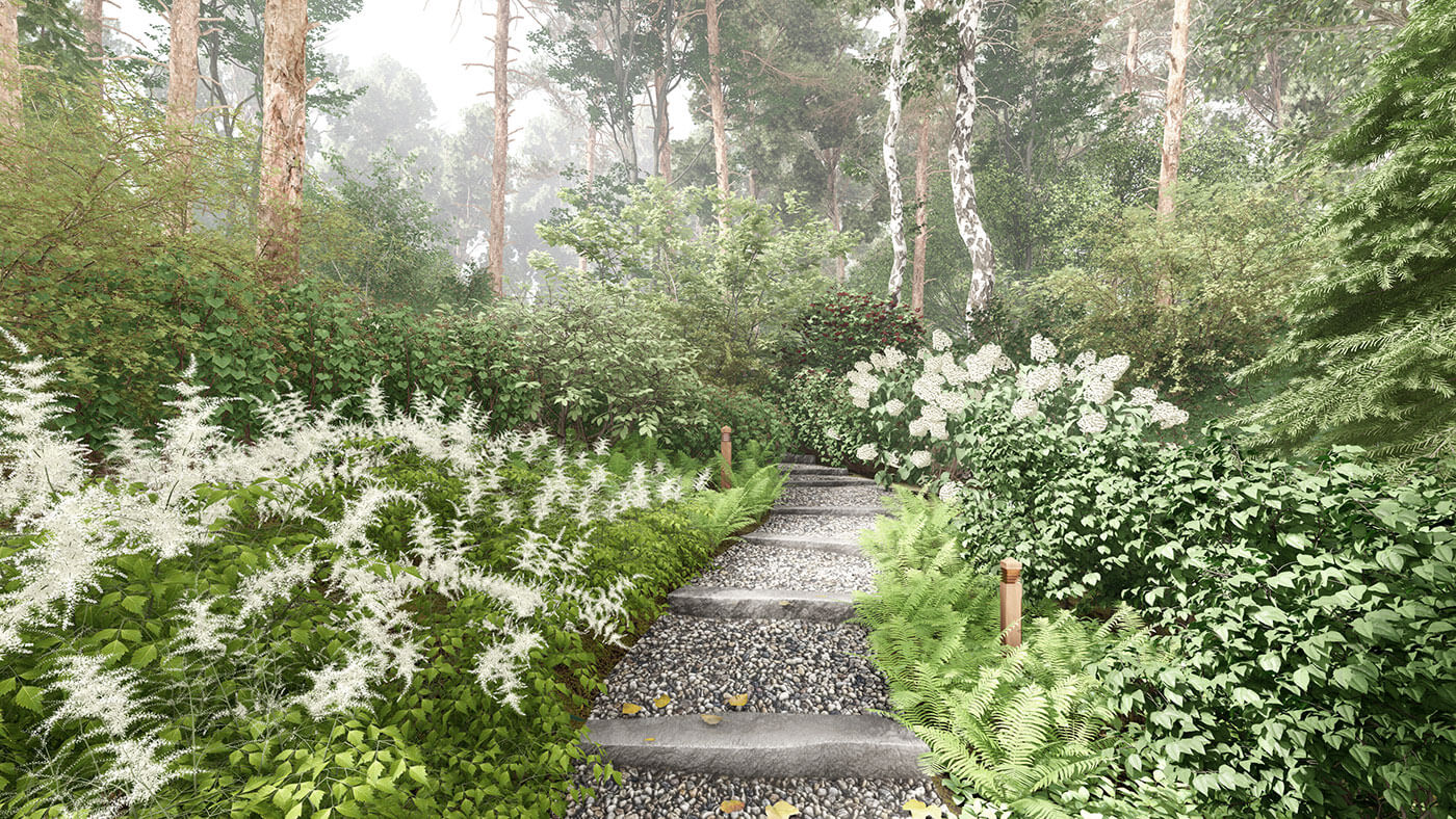 В западной части сада лишь подчеркивается красота лесного участка на выраженном рельефе. Тропинки и небольшие ступени уводят в глубь сада, в уединенное место на вершине холма, где размещается костровая площадка.