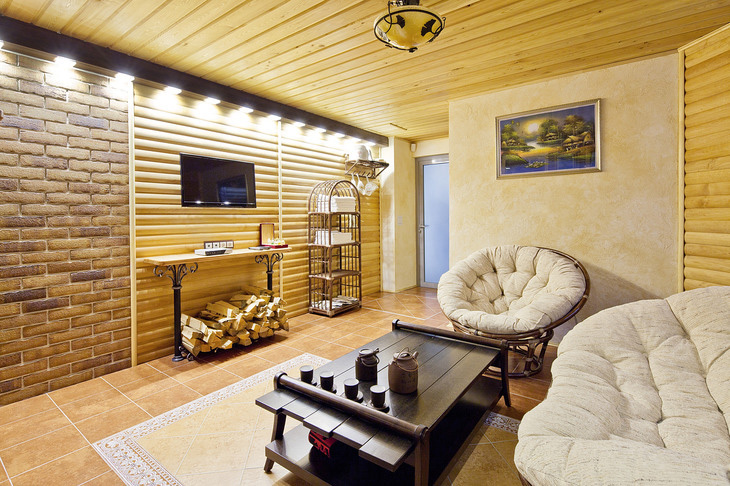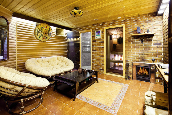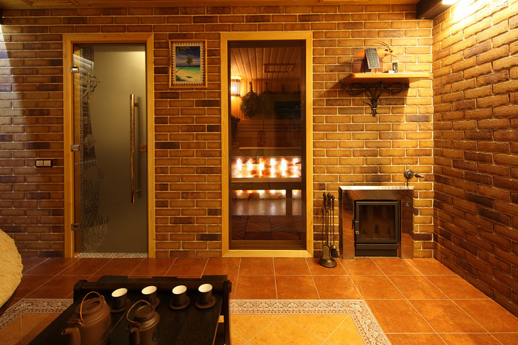 Топка печи производится из комнаты отдыха. Между баней и комнатой отдыха установлен стеклянный витраж, что зрительно увеличивает внутреннее пространство помещения.
