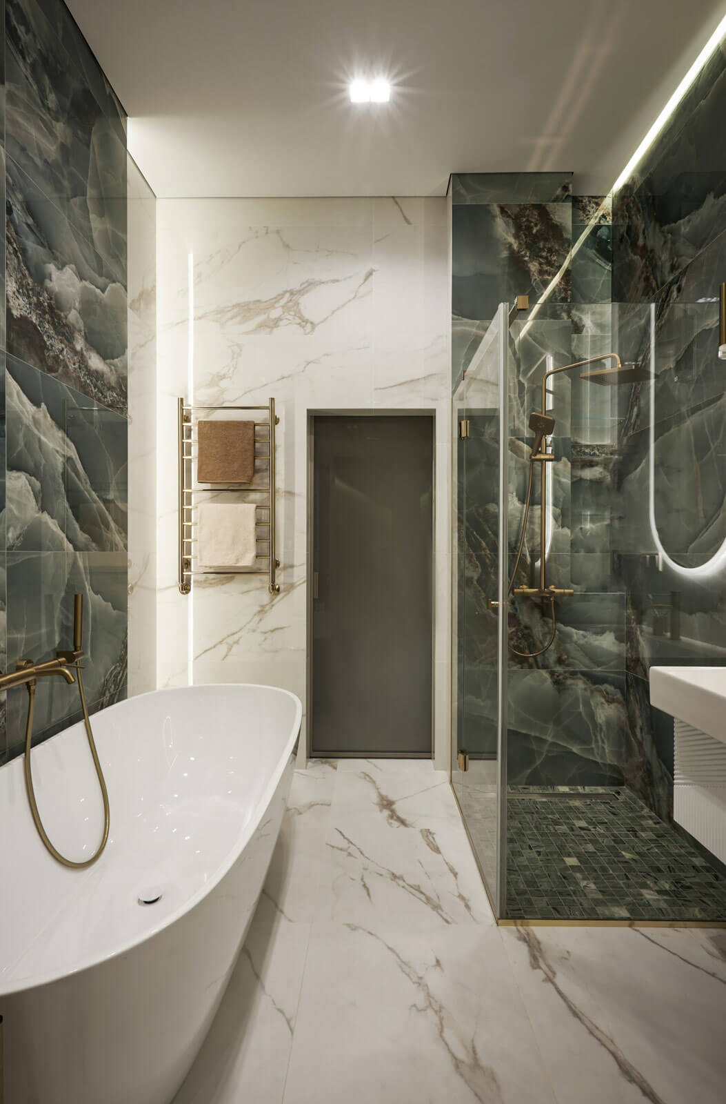 Женская зона, напротив, воплощает атмосферу уюта и расслабления. Просторная ванная комната с отдельно стоящей ванной стала настоящей спа-зоной в доме, подчеркивая важность личного комфорта и уединения.