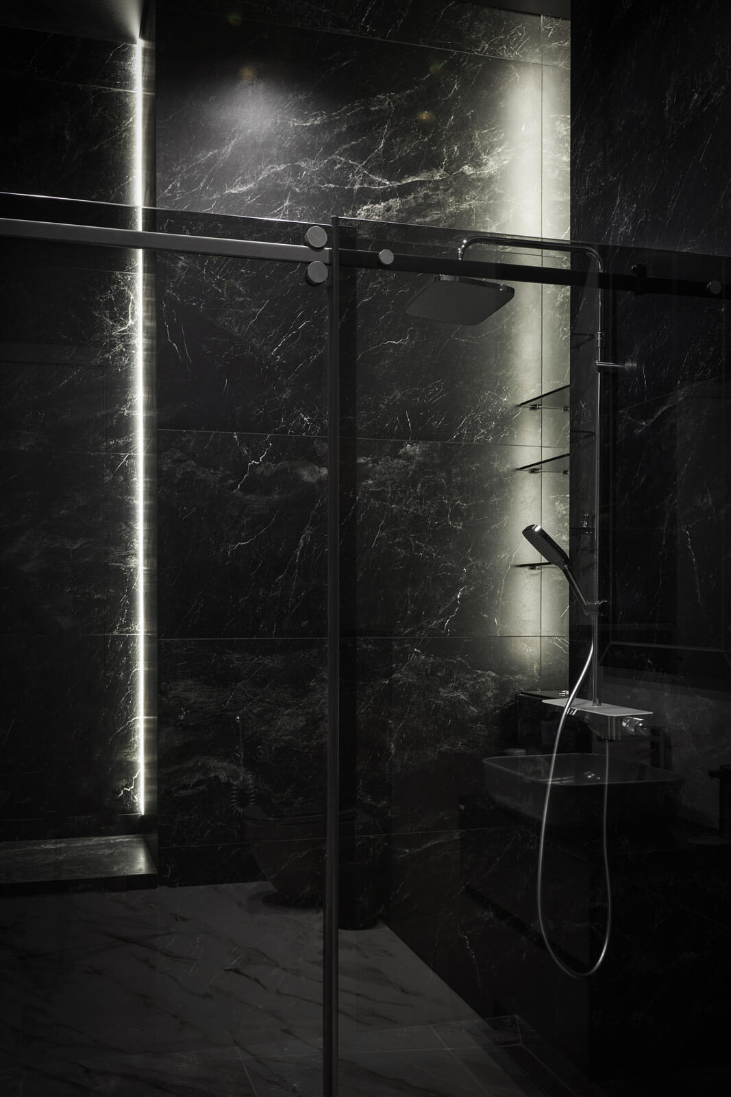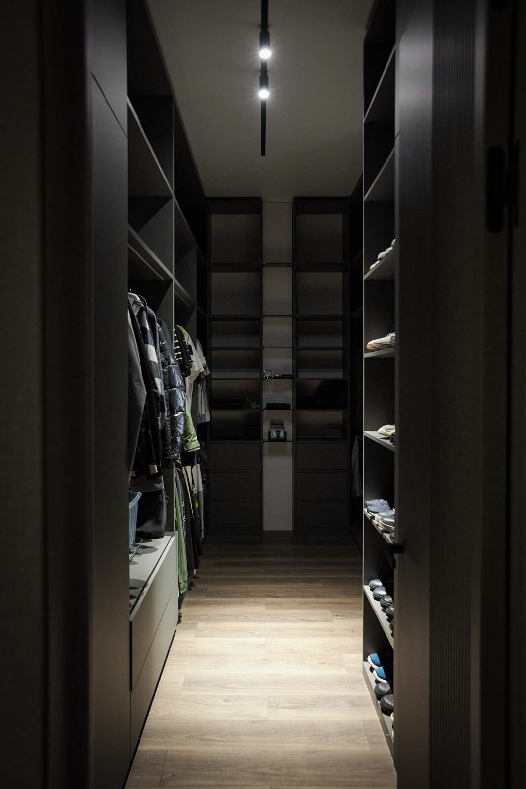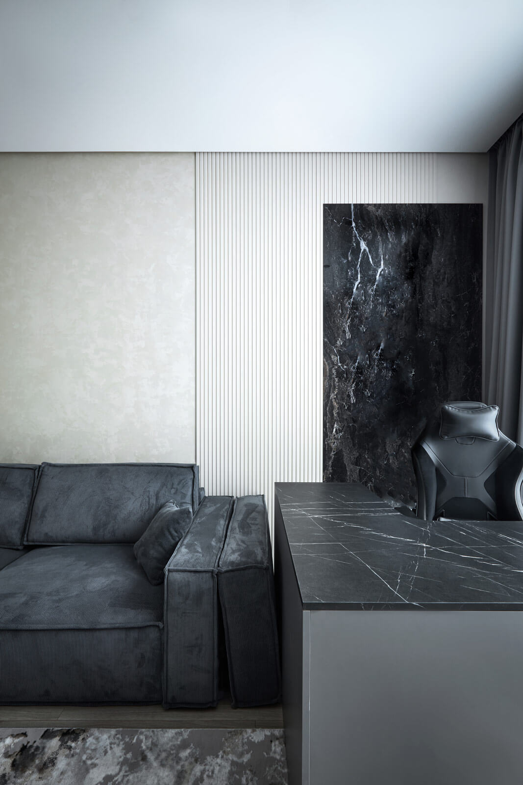 Отдельным элементом проекта стал мужской этаж, оформленный в брутальных оттенках. В его состав вошли спортивный зал, личный кабинет, душевая и гардеробная. Эта зона создавалась как личное пространство, где можно уединиться, заниматься спортом и работать.