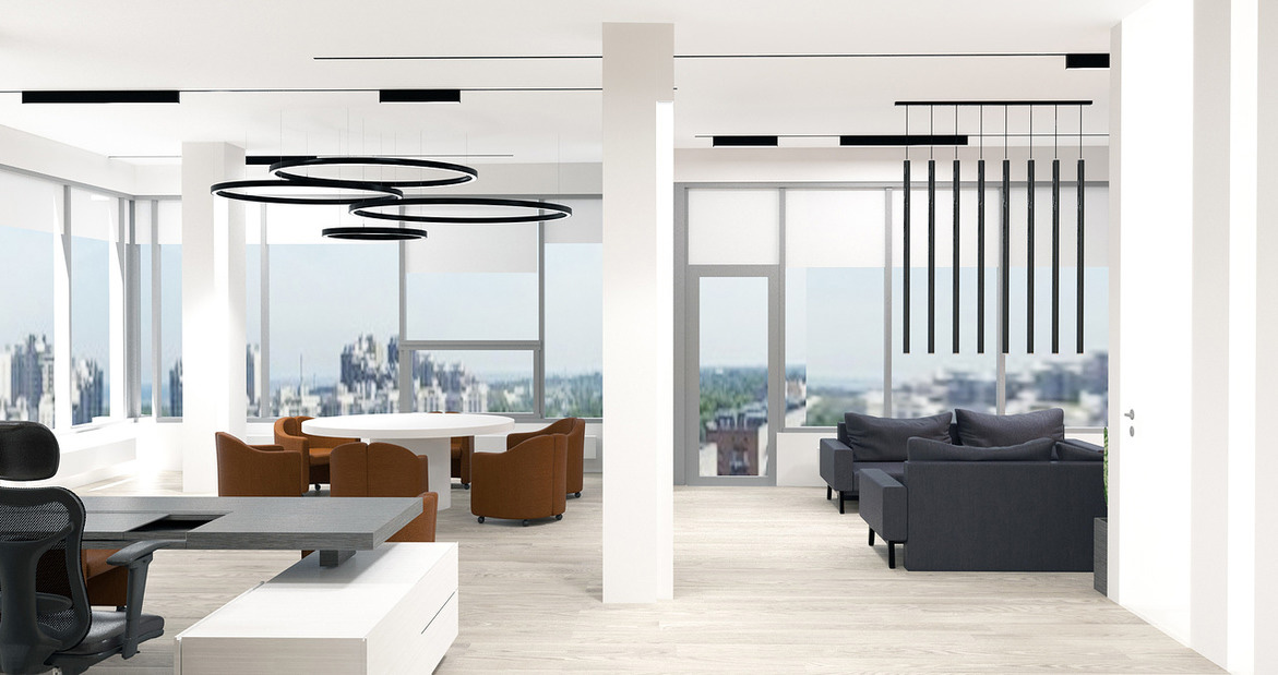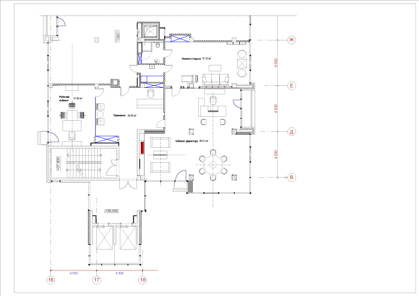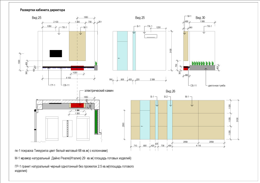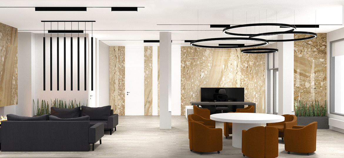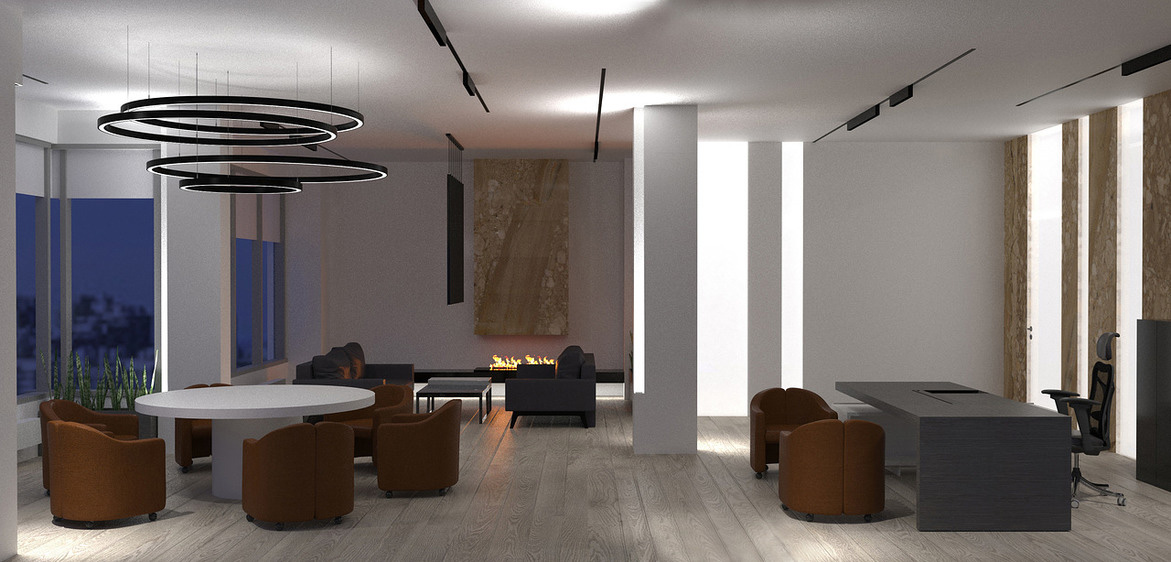Дизайн кабинета и приемной разработан для руководителя нефтяной компании. Кабинета решен в экологическом стиле с применением натурального мрамора Daino Reale (Италия) и натуральной паркетной доски с текстурой ясеня. Живописный мрамор, представленный в виде слэбов в облицовке стен, является прекрасным фоном для аскетичной мебели и черных минималистских светильников. Такой контраст делает интерьер живым и в то же время статусным. Обилие зелени дополняет экологическую тему.