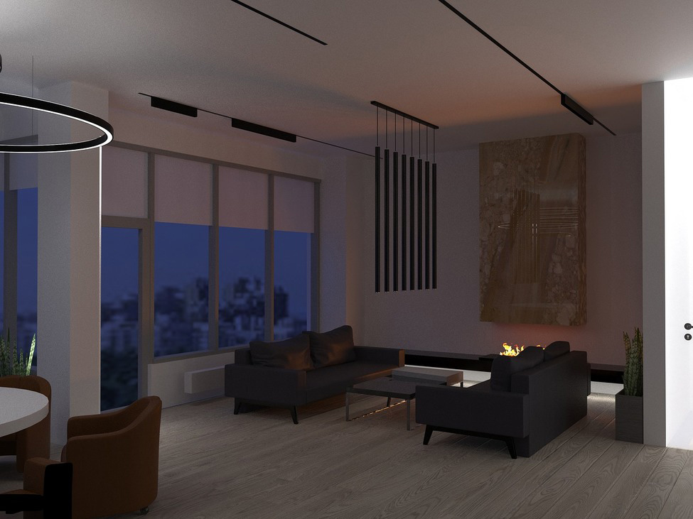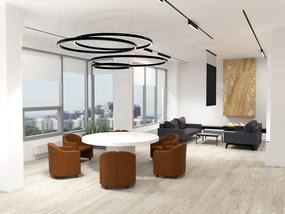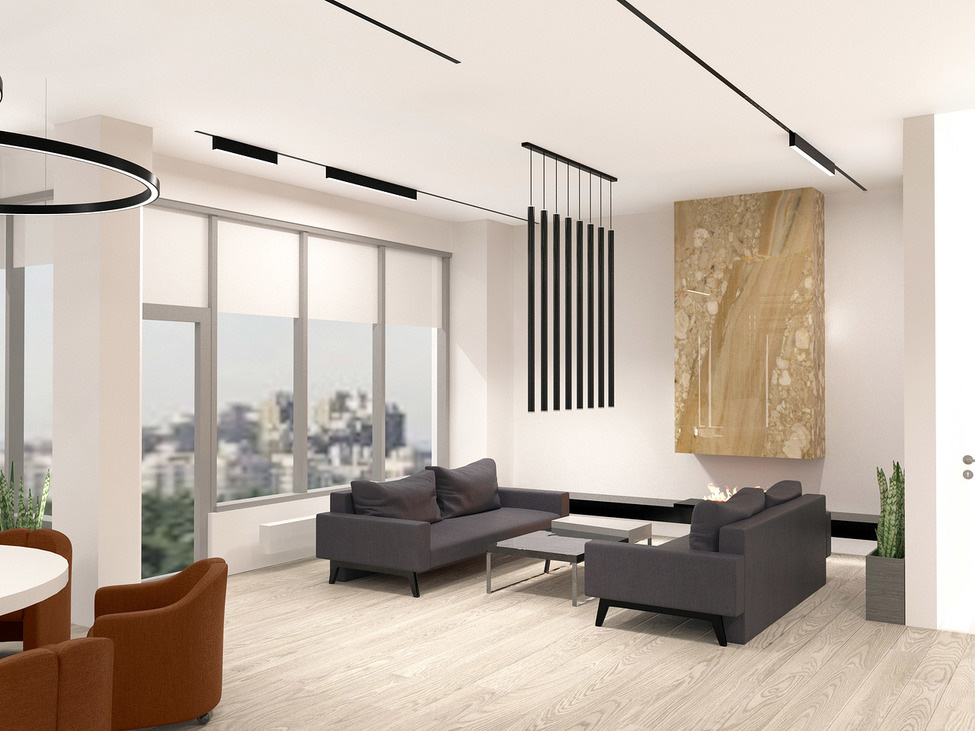 Камин вместе с диванами и журнальным столиком организует лаунж-зону для переговоров.