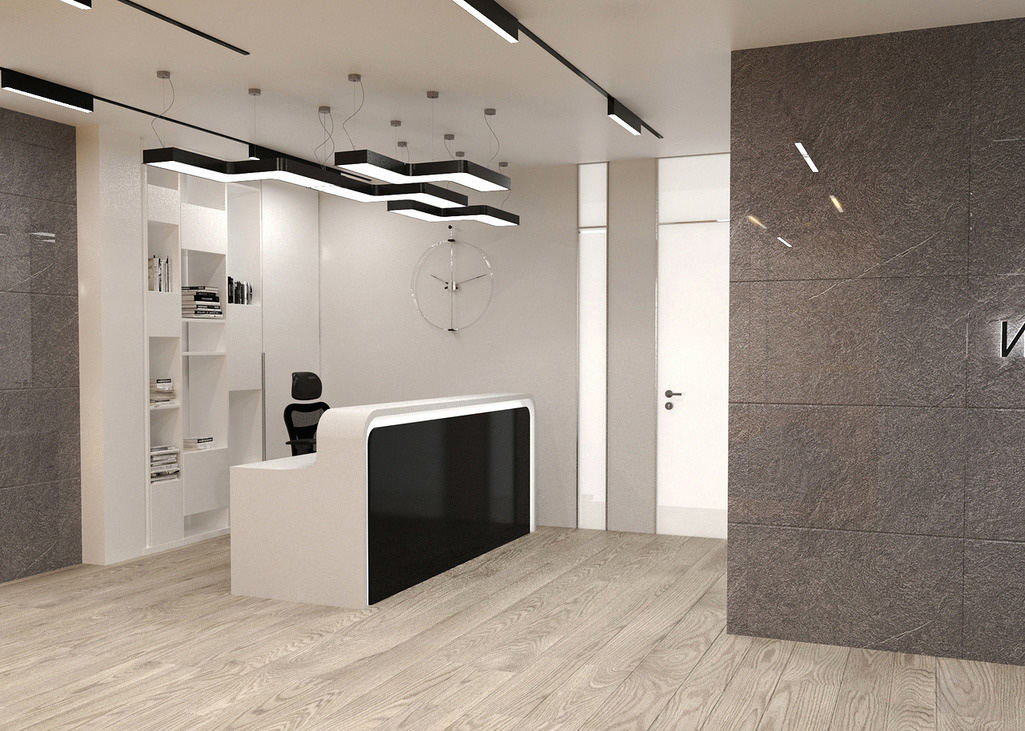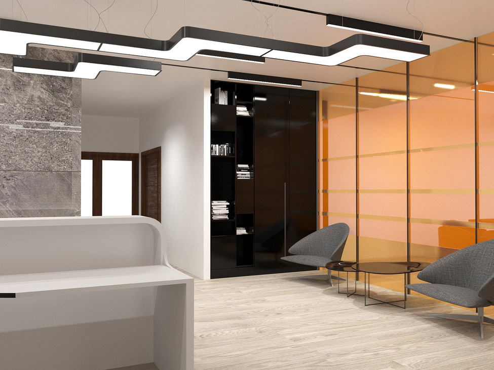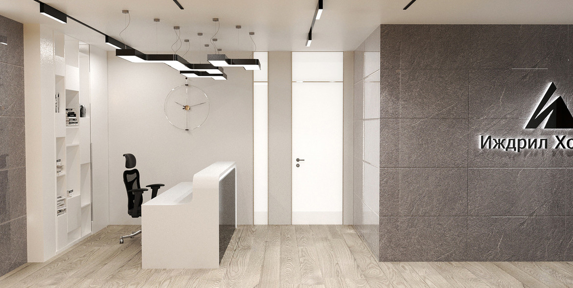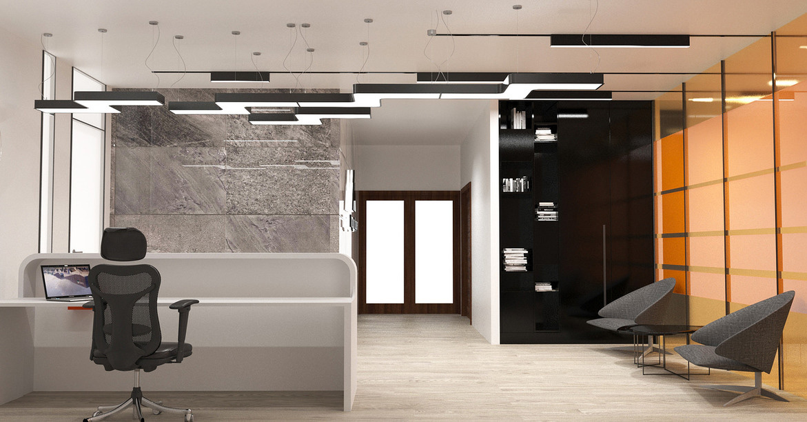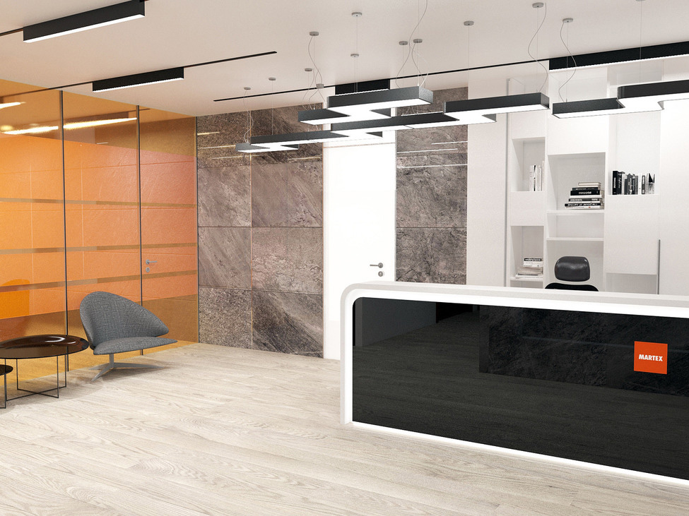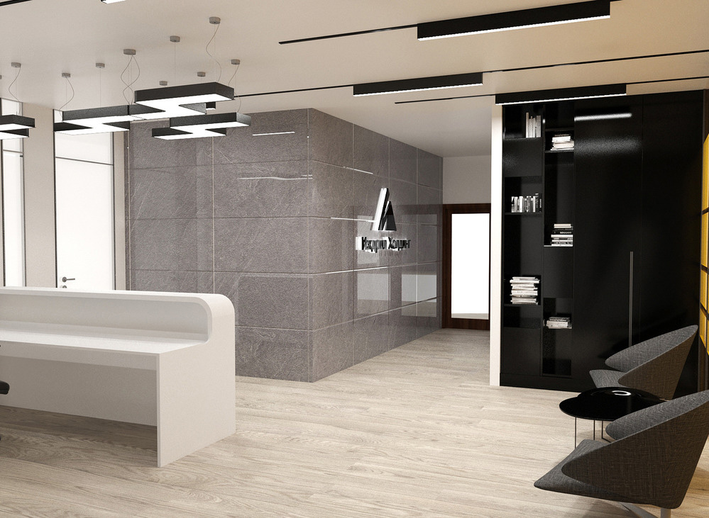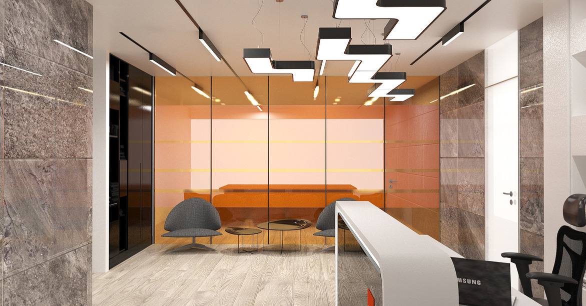 В приемной для отделки стен использован серый мрамор Antilopa Grey (Турция). Он изысканно сочетается с оранжевой перегородкой из стекла, ограничивающей зал переговоров. При входе на стене, выложенной мрамором, размещен хромированный логотип компании. Сочетание таких дорогих материалов подчеркивает статусность помещения.