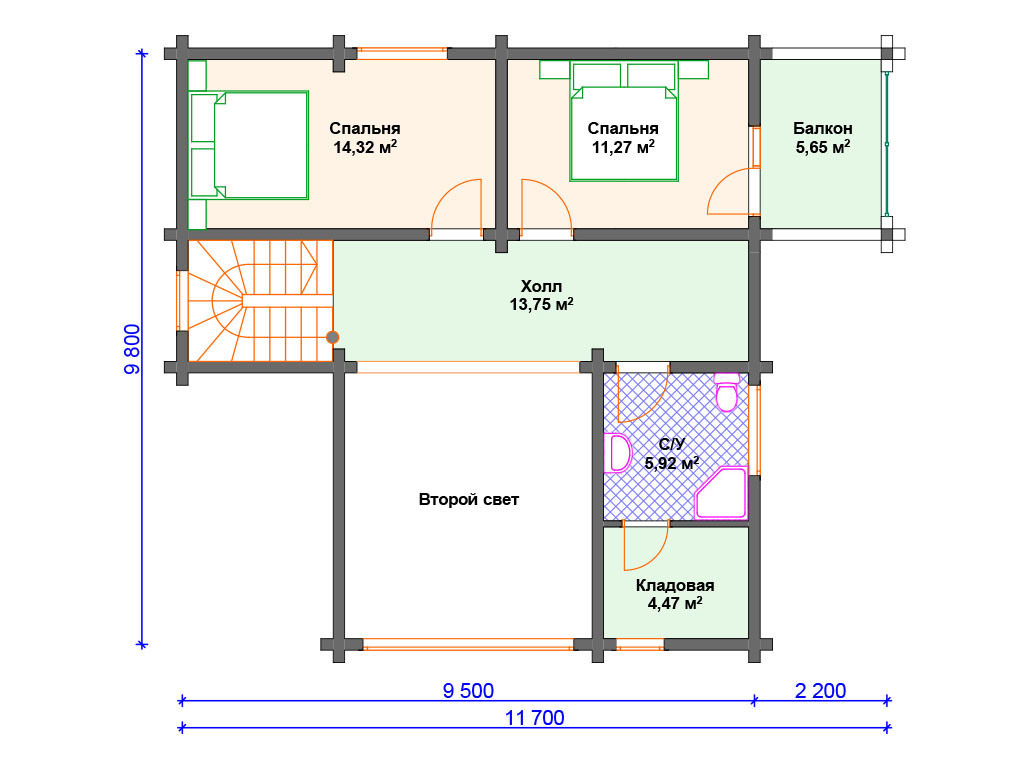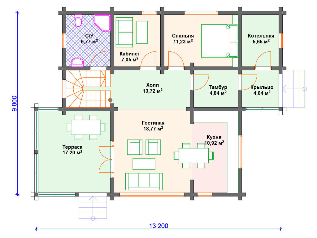 Габаритные размеры дома в осях строения — 9,8 м х 13,2 м