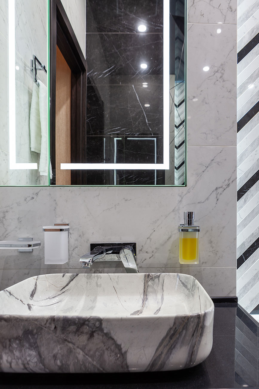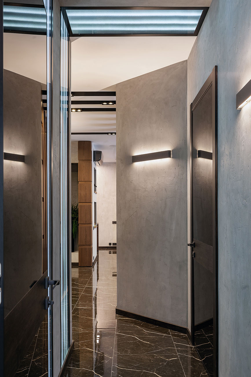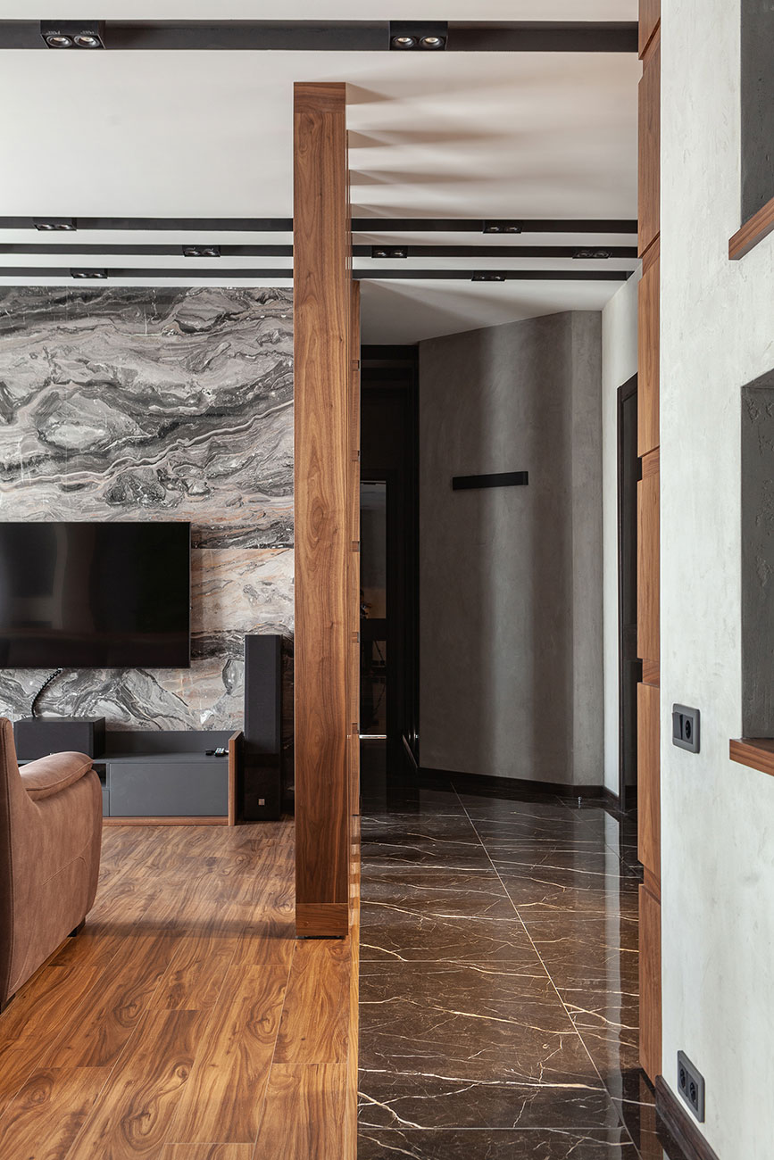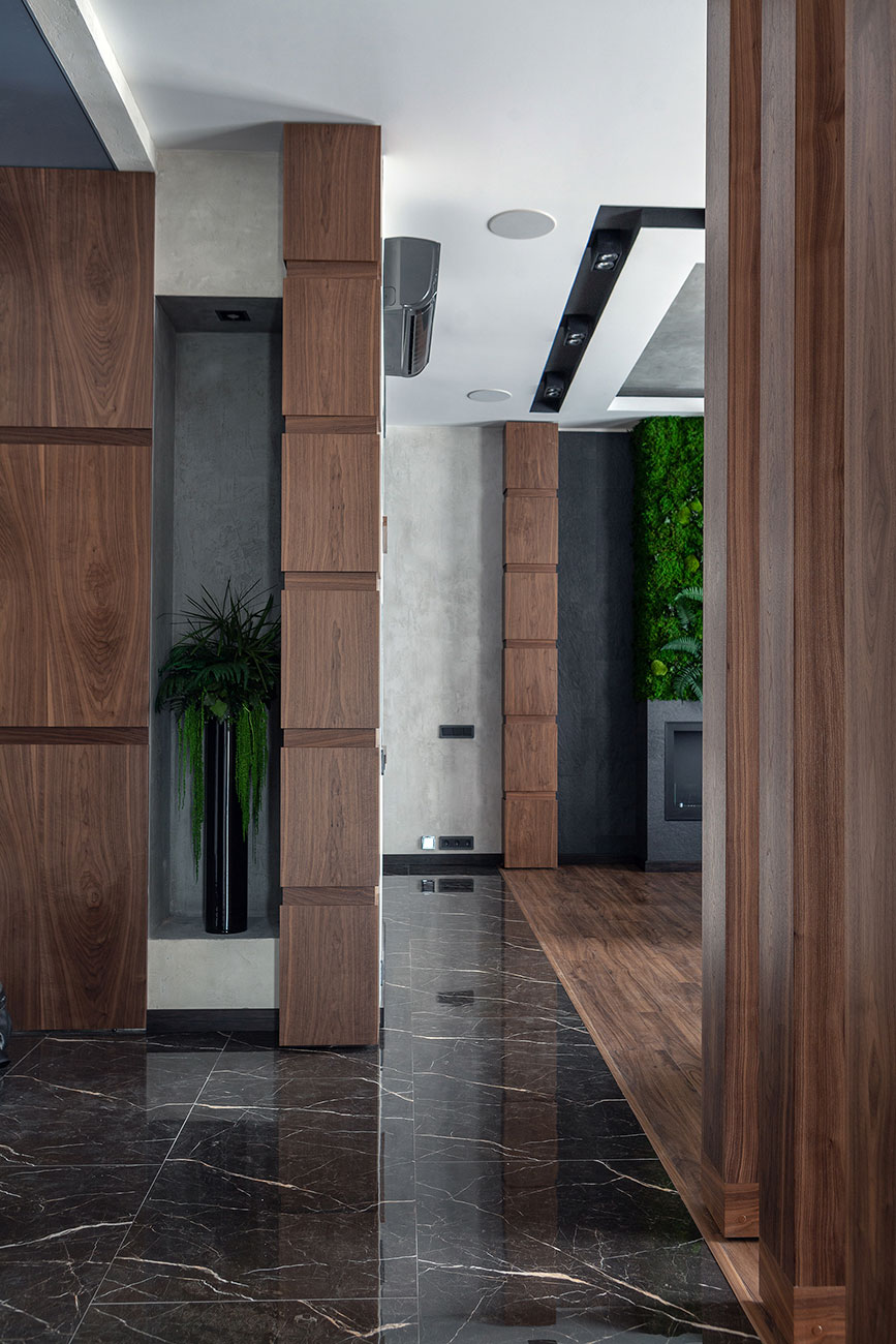Задача была создать гармонию природных теплых текстур и холодных, ассоциируемых с городским пейзажем. В дизайне это отражено сочетанием мрамора с деревом; мха и природного камня — с черным глянцем стекла.
