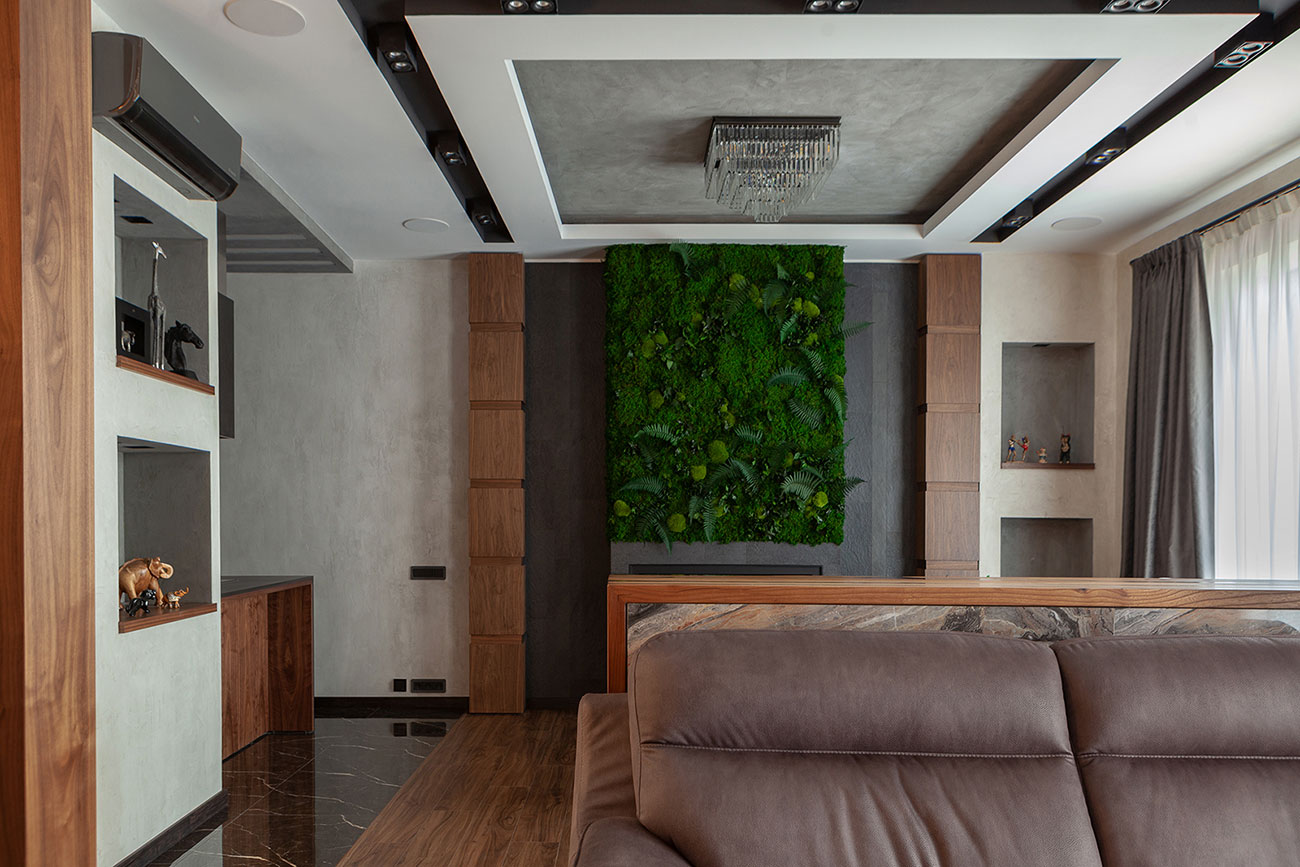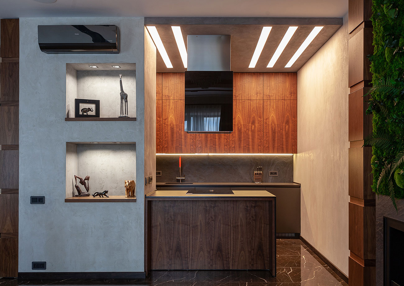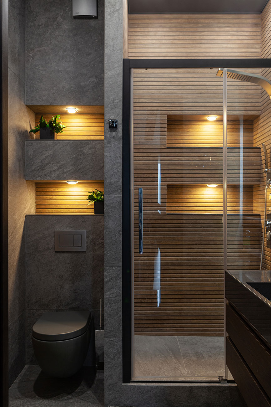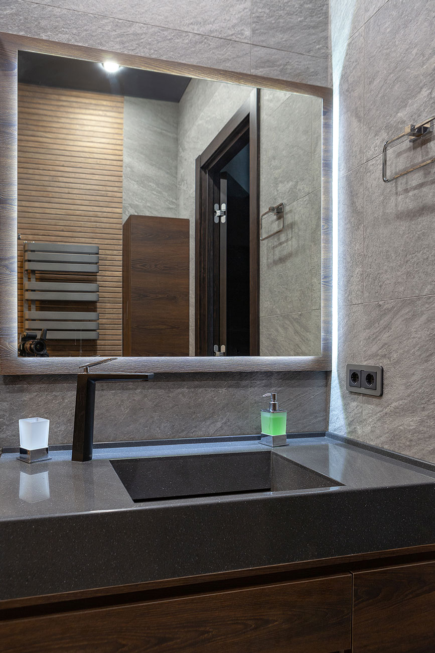 Задача была создать гармонию природных теплых текстур и холодных, ассоциируемых с городским пейзажем. В дизайне это отражено сочетанием мрамора с деревом; мха и природного камня — с черным глянцем стекла.