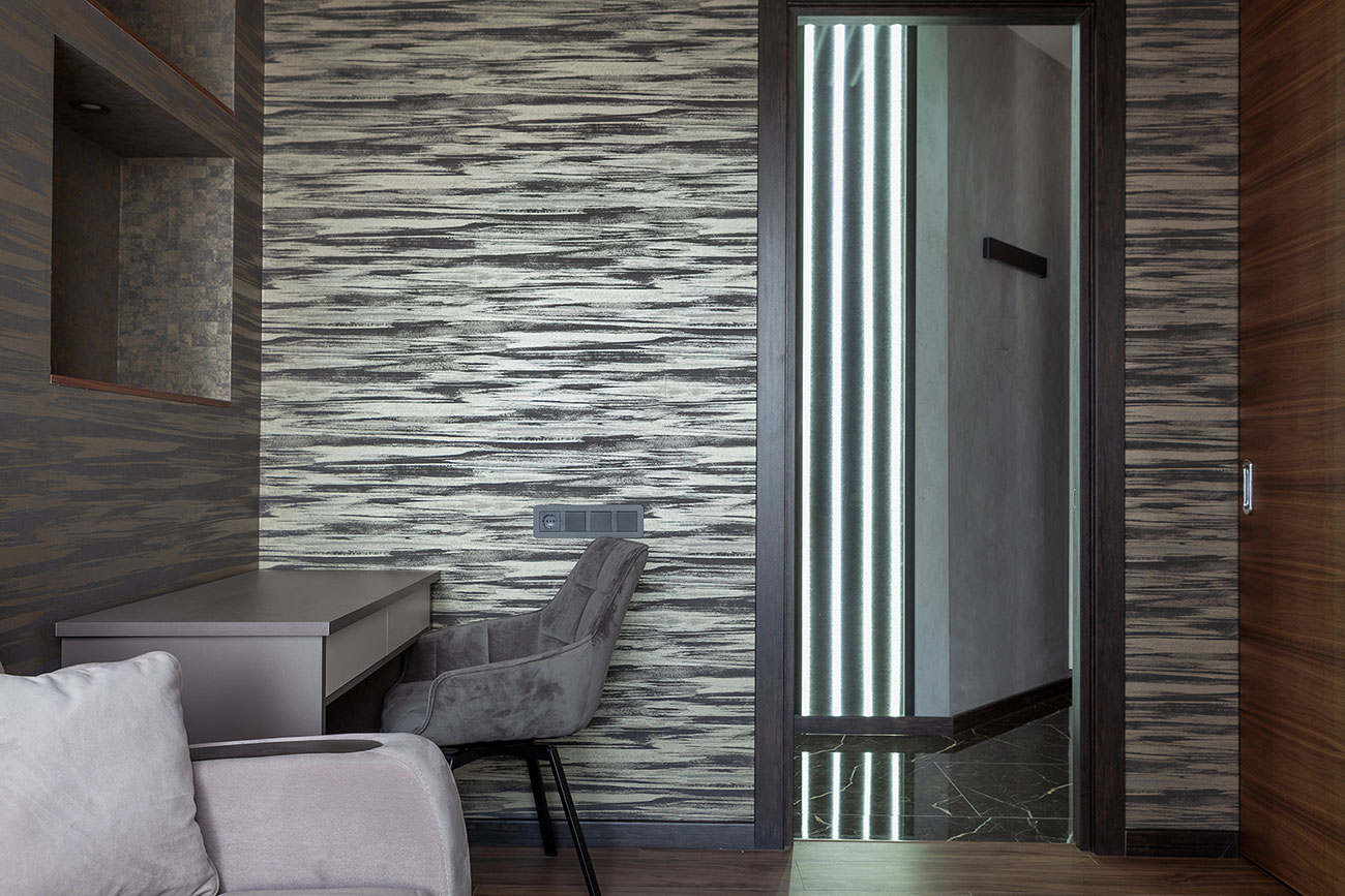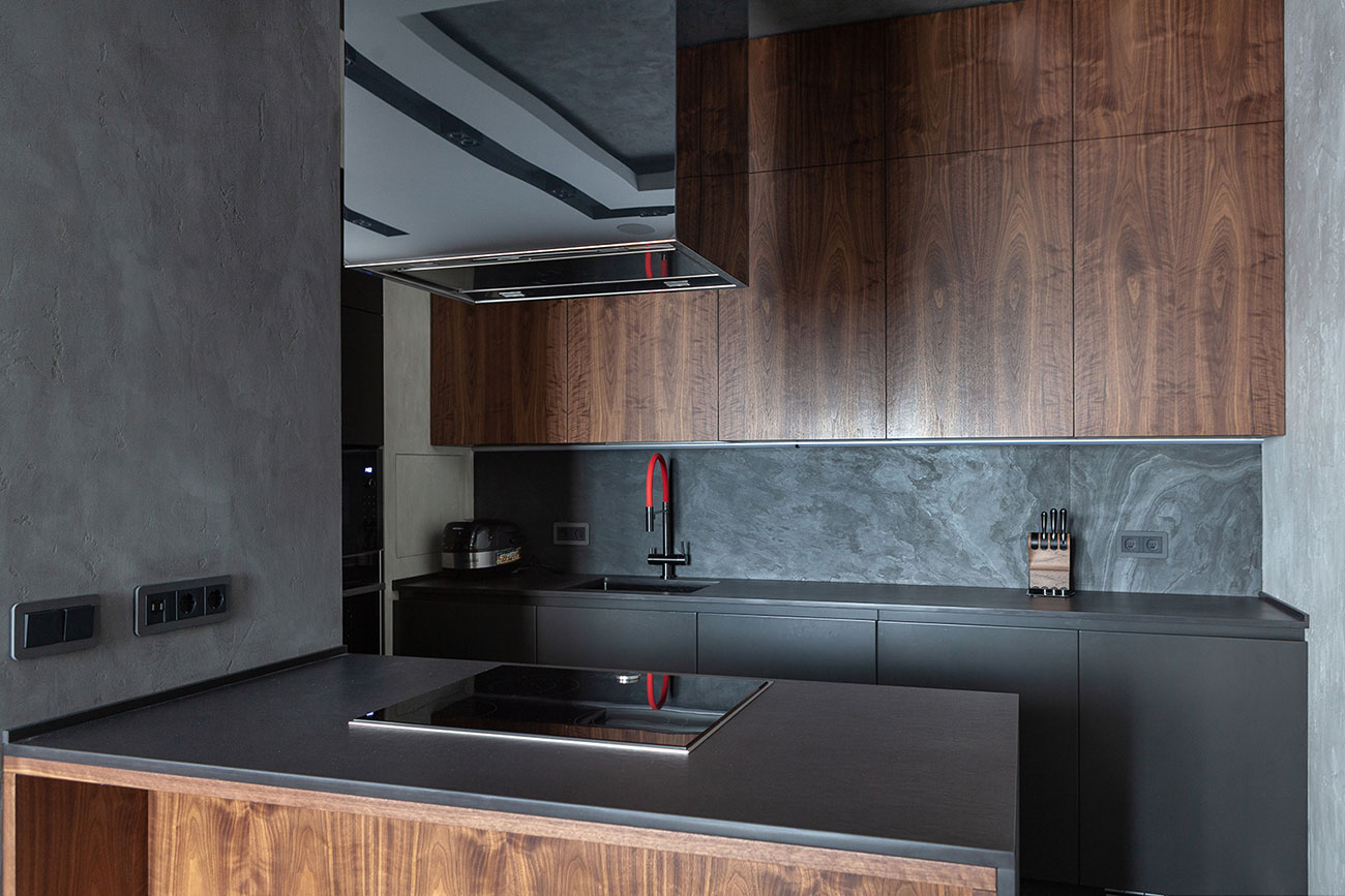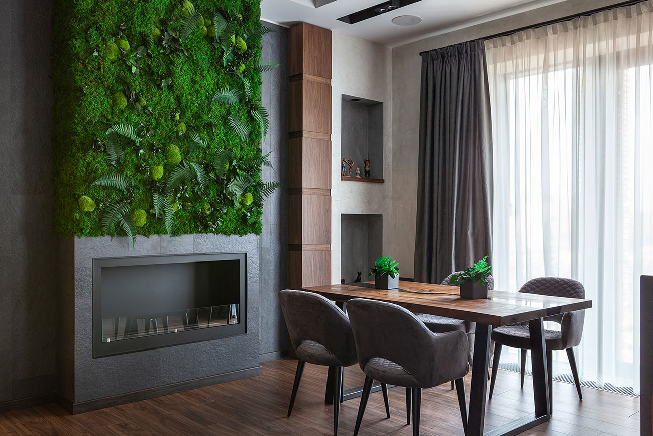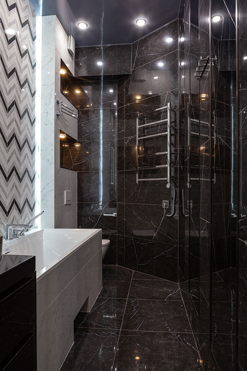 Задача была создать гармонию природных теплых текстур и холодных, ассоциируемых с городским пейзажем. В дизайне это отражено сочетанием мрамора с деревом; мха и природного камня — с черным глянцем стекла.