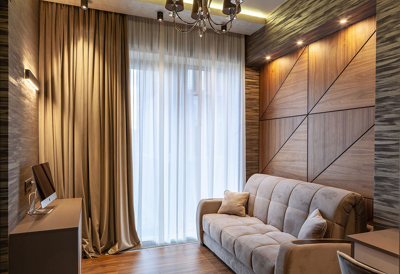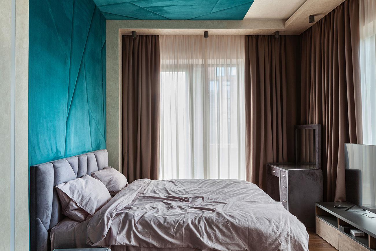 В спальне для создания ощущения тепла и уюта использовали мягкие декоративные панели.