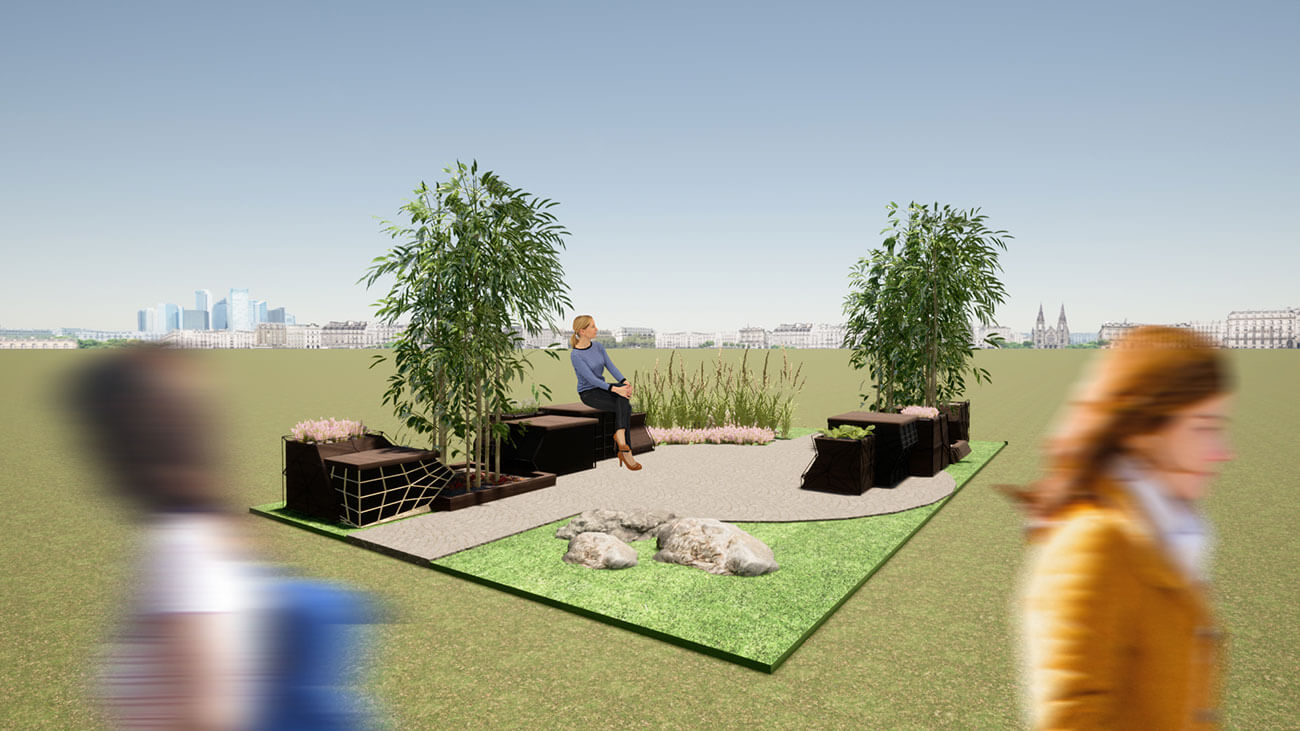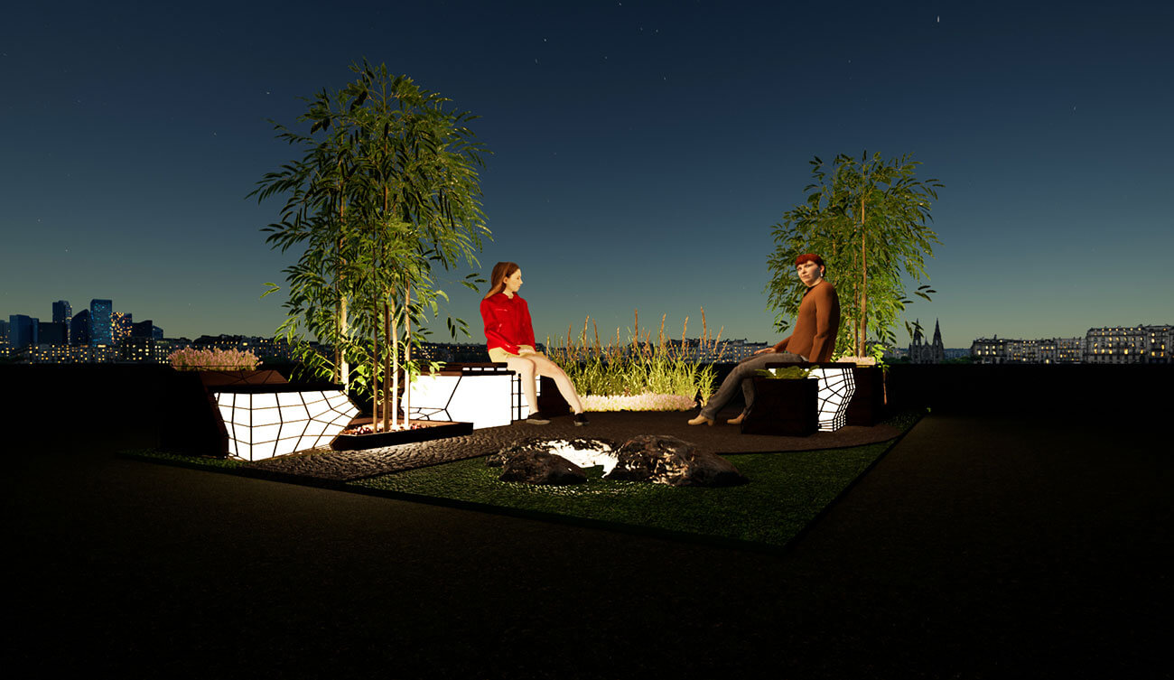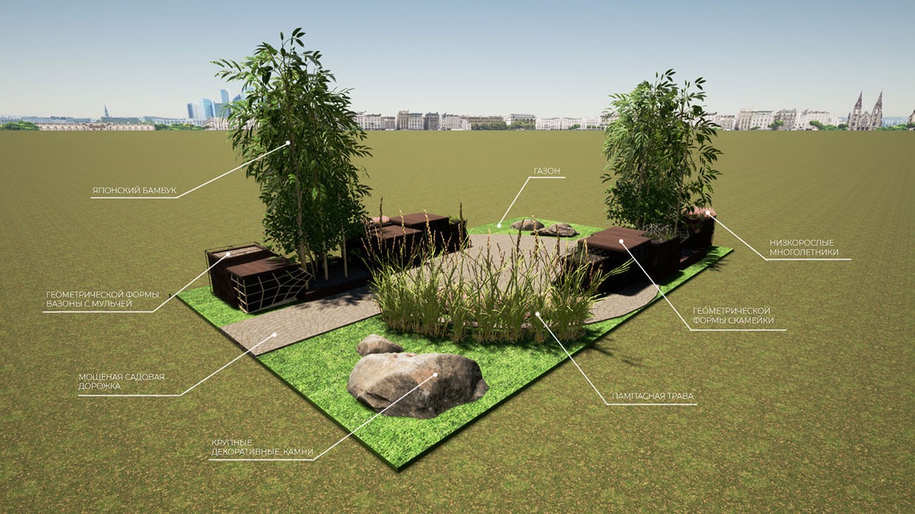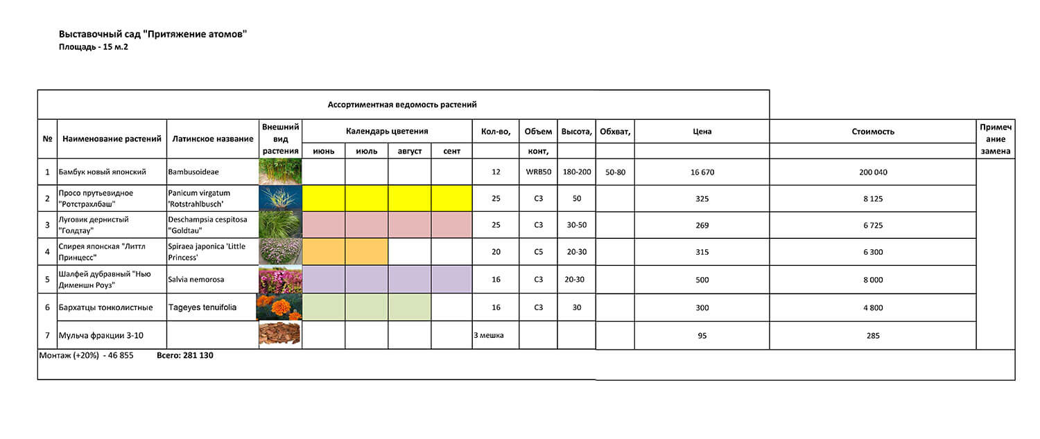 Сад «Притяжение атомов» олицетворяет две стороны, гармонично дополняющие друг друга. Как атомы, эти две половинки притягиваются и становятся уже чем-то большим, одним целым, молекулой. Сад устроен подобно молекуле, есть промежутки, проходные дорожки со входом с одной стороны овала и выходом с другой. Неоновые скамейки, каждая из которых играет роль расщепленного атома, словно стремятся воссоединиться. По отдельности скамейки, еще до перевоплощения в «молекулу», существуют как отдельные миры. Именно данная форма, являющаяся первоисточником слаженной системы, влечет посетителей сада. В качестве основного растения выбран бамбук новый японский, который придает саду некую экзотику. Утонченные стебли ясно перекликаются с геометризованной решеткой скамеек. Имитацией ограждения выступает просо прутьевидное «Ротстрахлбаш». Растение вносит в сад воздушность, невесомость и летнюю романтику.