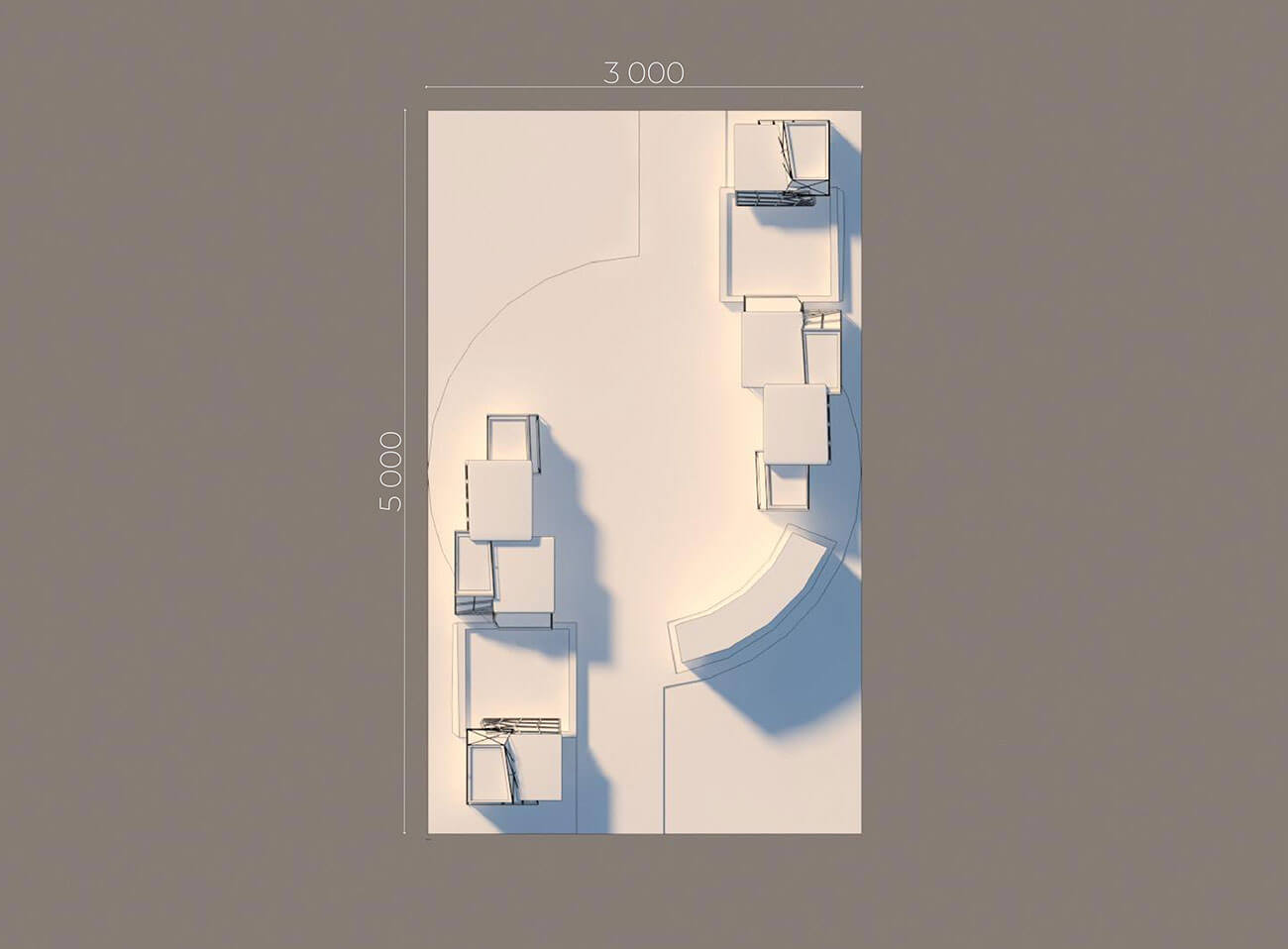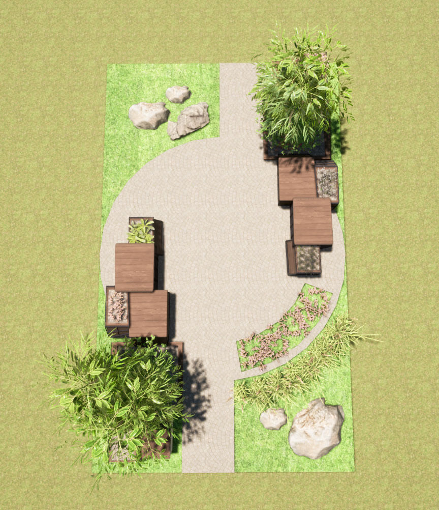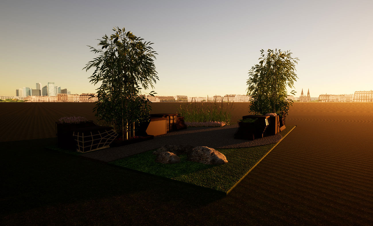 Сад «Притяжение атомов» олицетворяет две стороны, гармонично дополняющие друг друга. Как атомы, эти две половинки притягиваются и становятся уже чем-то большим, одним целым, молекулой. Сад устроен подобно молекуле, есть промежутки, проходные дорожки со входом с одной стороны овала и выходом с другой. Неоновые скамейки, каждая из которых играет роль расщепленного атома, словно стремятся воссоединиться. По отдельности скамейки, еще до перевоплощения в «молекулу», существуют как отдельные миры. Именно данная форма, являющаяся первоисточником слаженной системы, влечет посетителей сада. В качестве основного растения выбран бамбук новый японский, который придает саду некую экзотику. Утонченные стебли ясно перекликаются с геометризованной решеткой скамеек. Имитацией ограждения выступает просо прутьевидное «Ротстрахлбаш». Растение вносит в сад воздушность, невесомость и летнюю романтику.