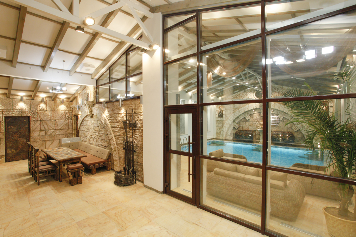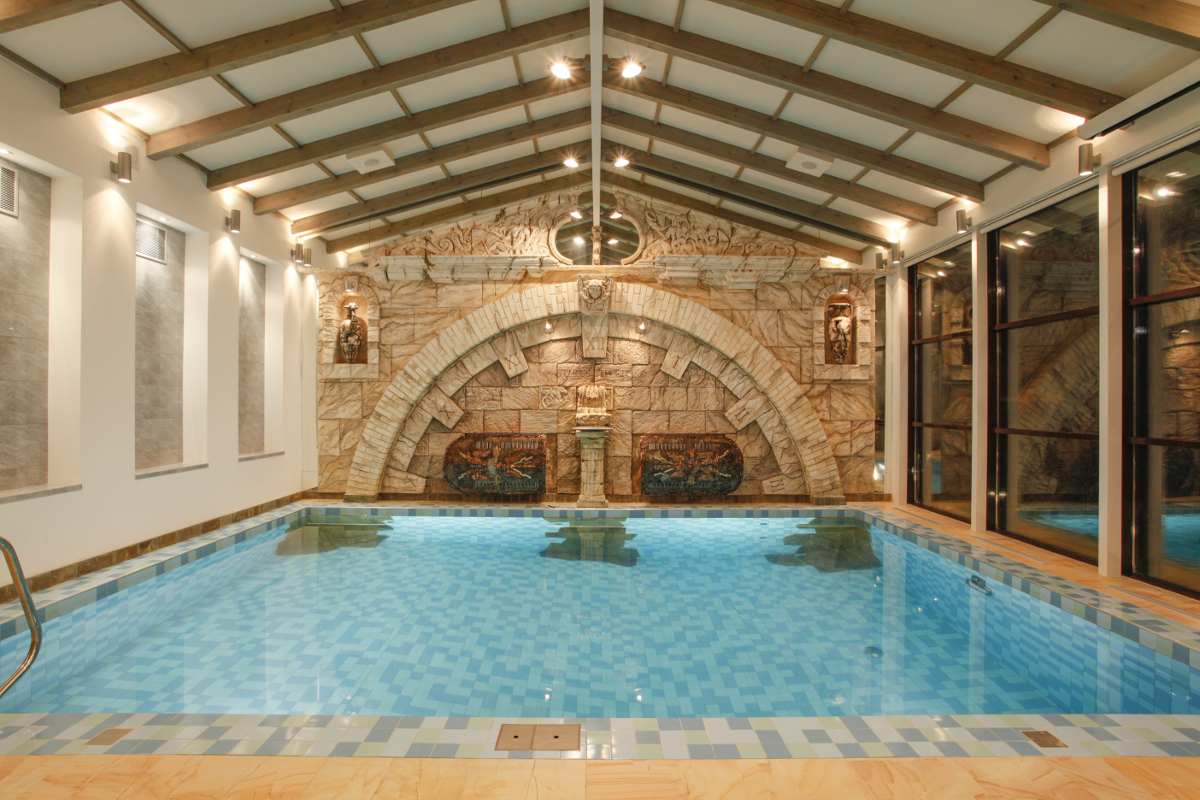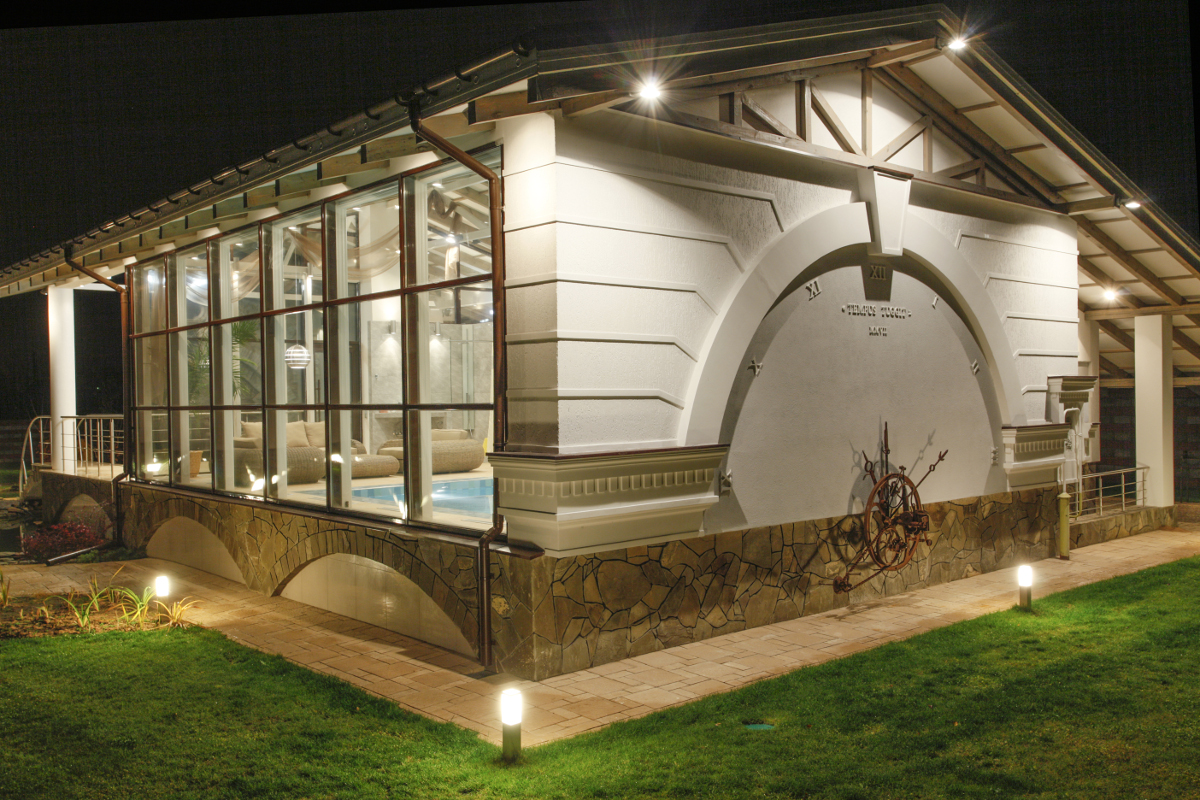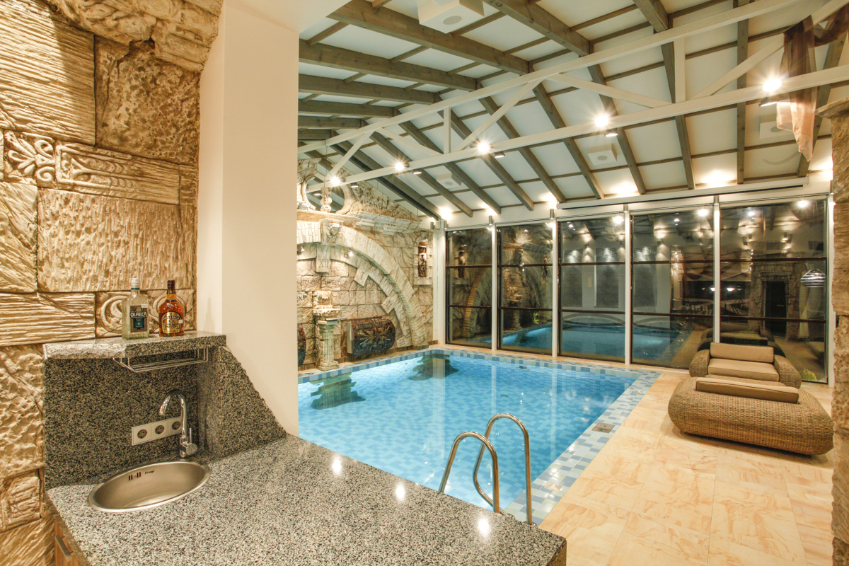 Планировочное решение просто! Бассейн — гостевой дом с хаммамом в один этаж. Конструкция — металлический каркас, накрывающий руины, с алюминиевыми витражами — парником, впитывающим солнце.