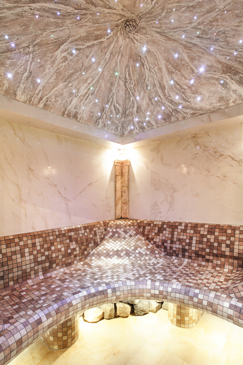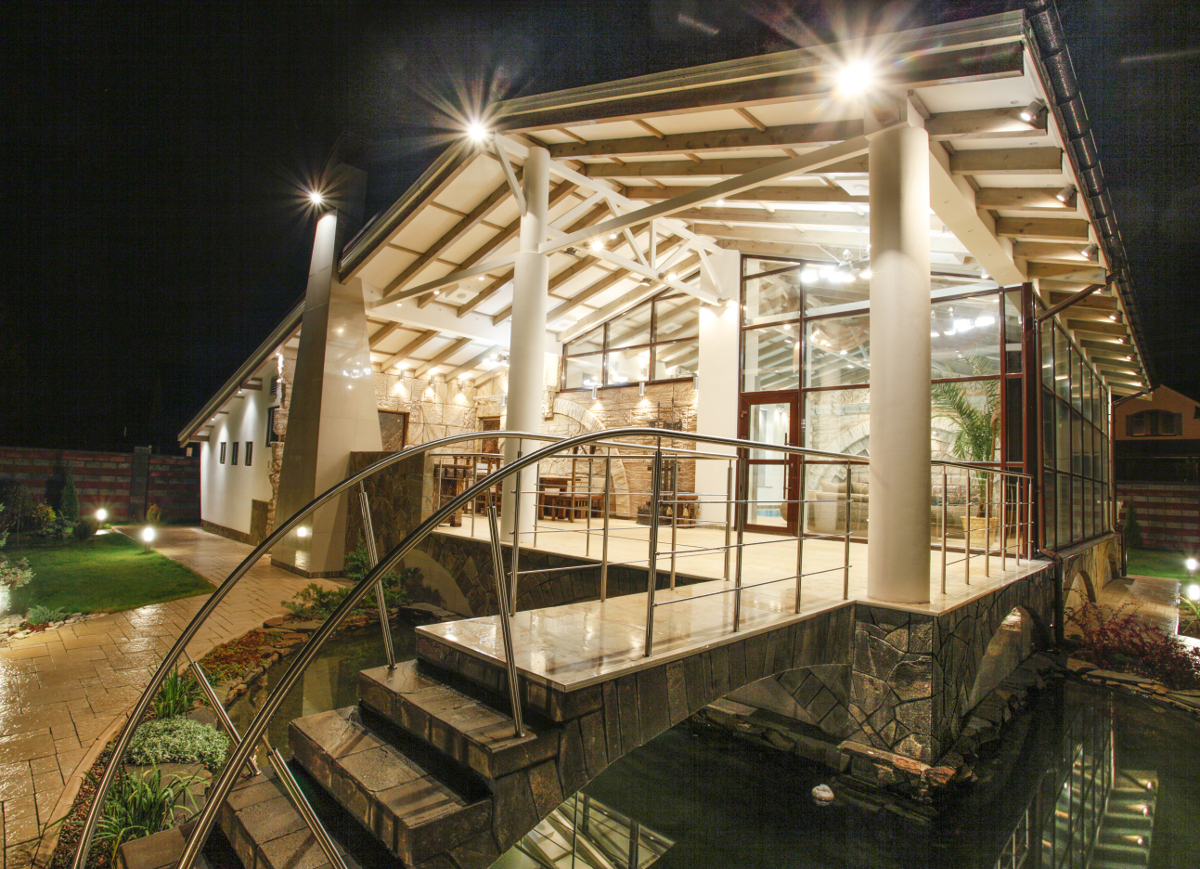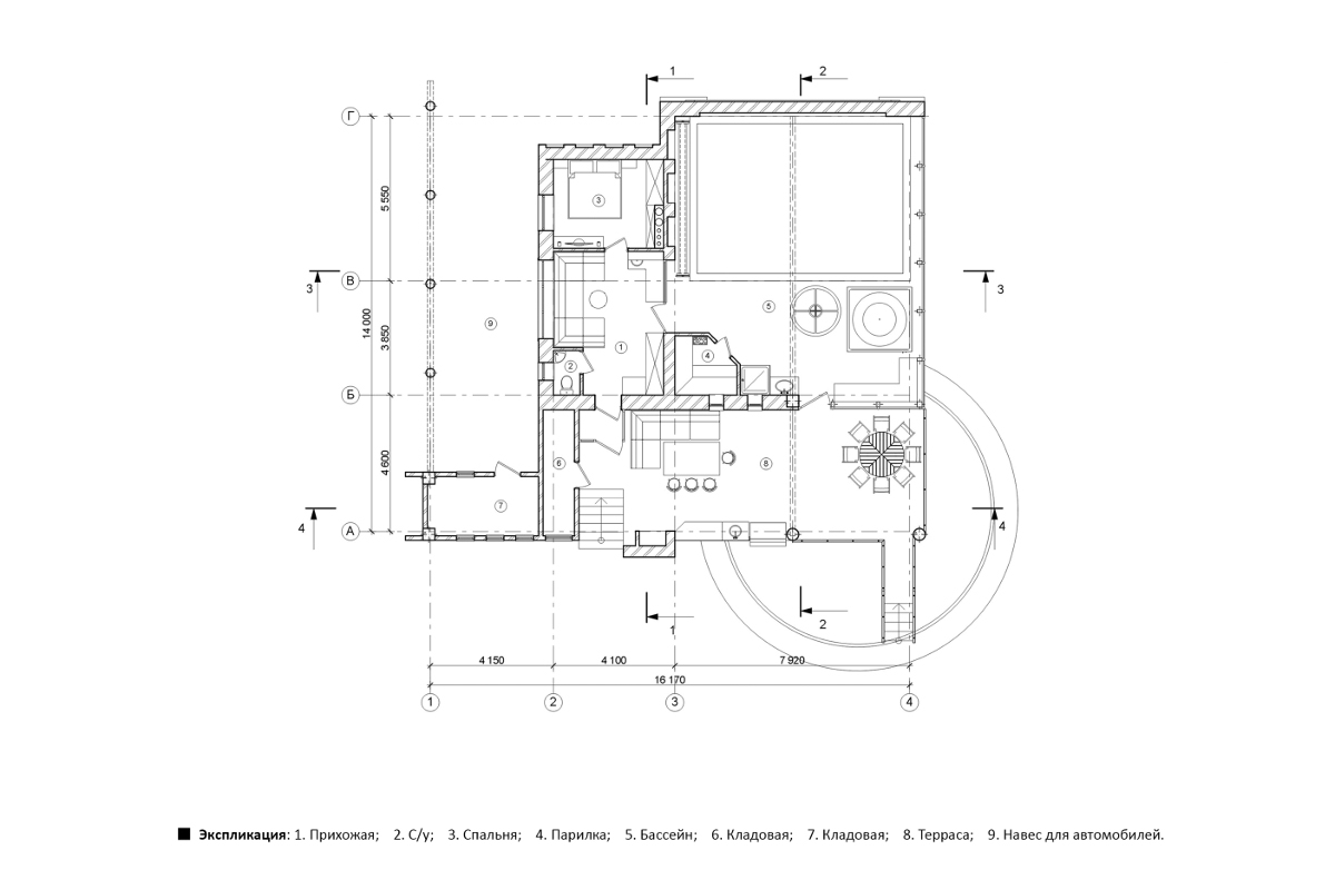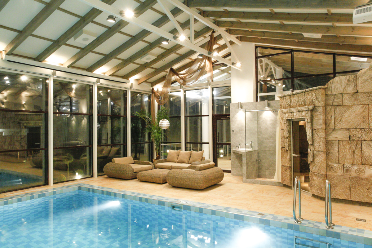 Планировочное решение просто! Бассейн — гостевой дом с хаммамом в один этаж. Конструкция — металлический каркас, накрывающий руины, с алюминиевыми витражами — парником, впитывающим солнце.