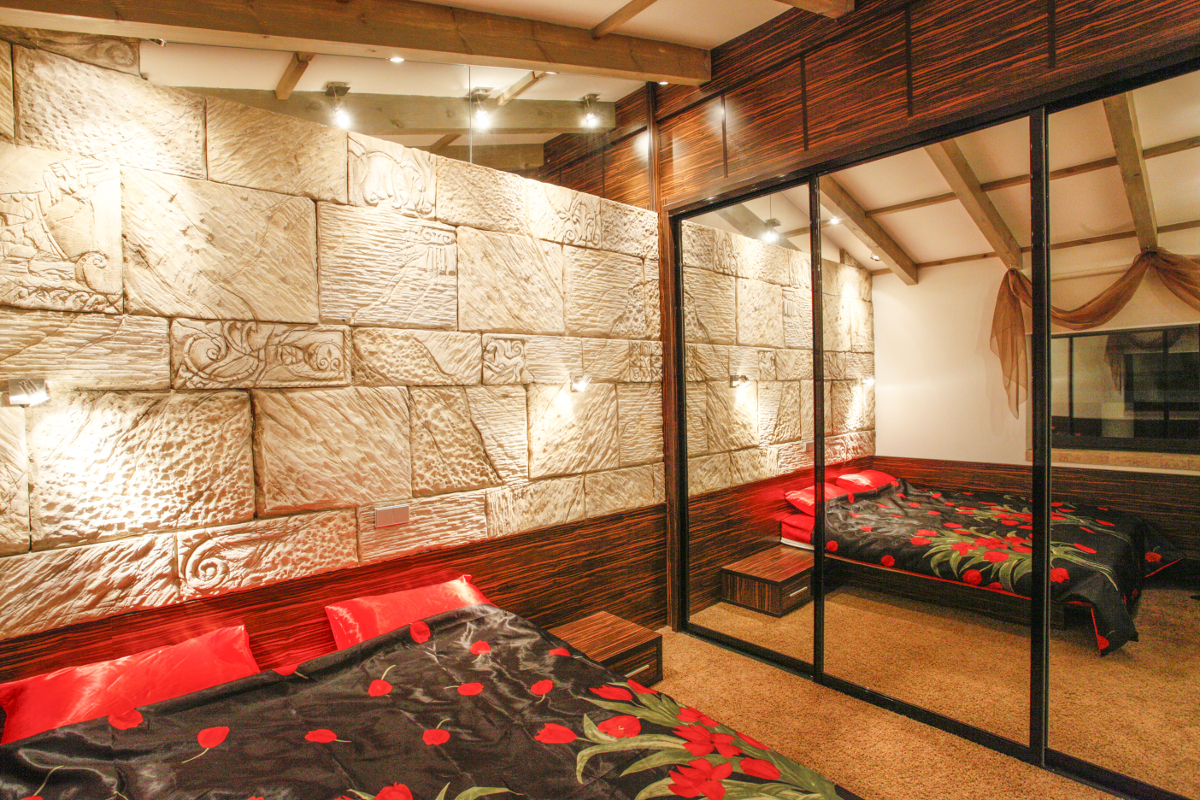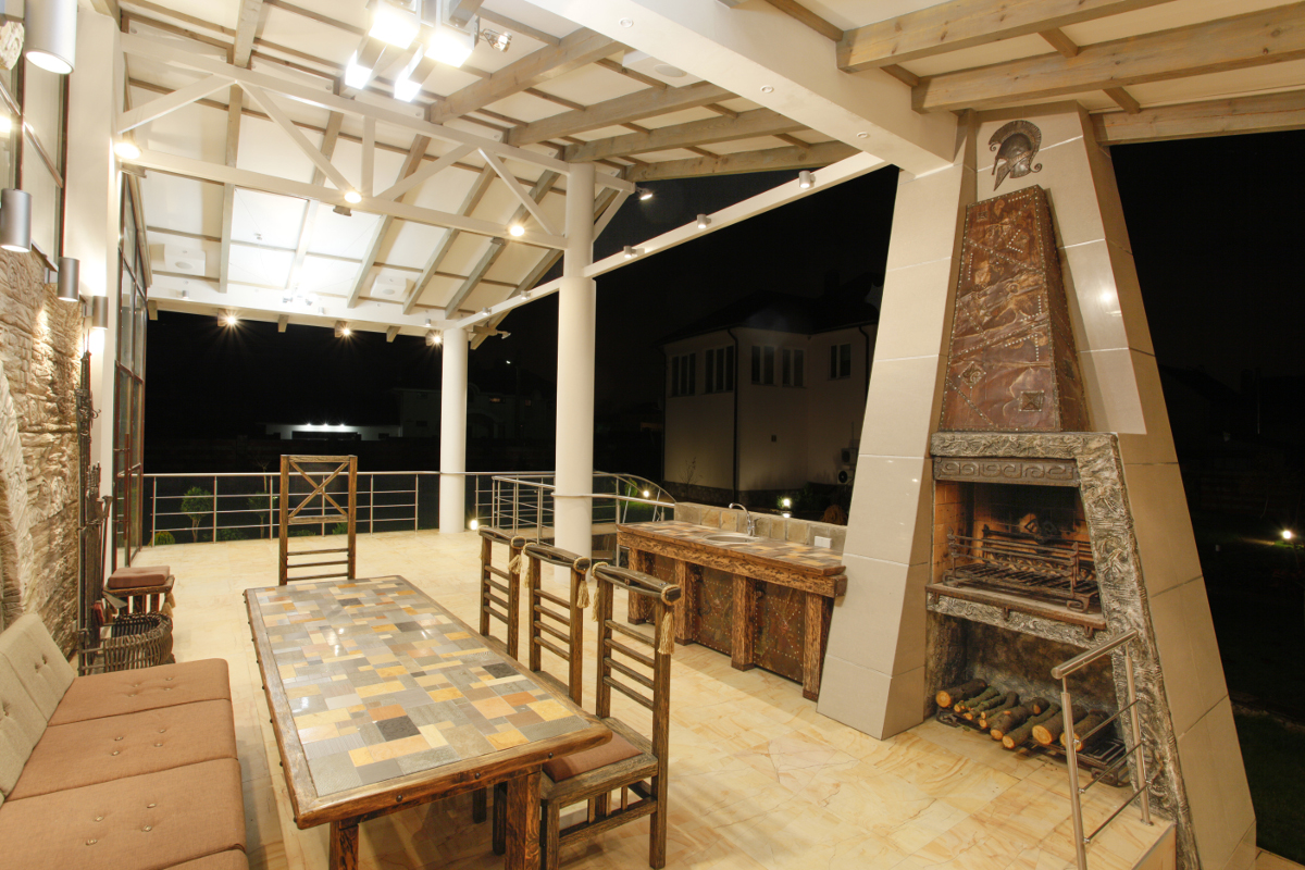 В отделке песчаник, итальянский туф, дерево, плитка.